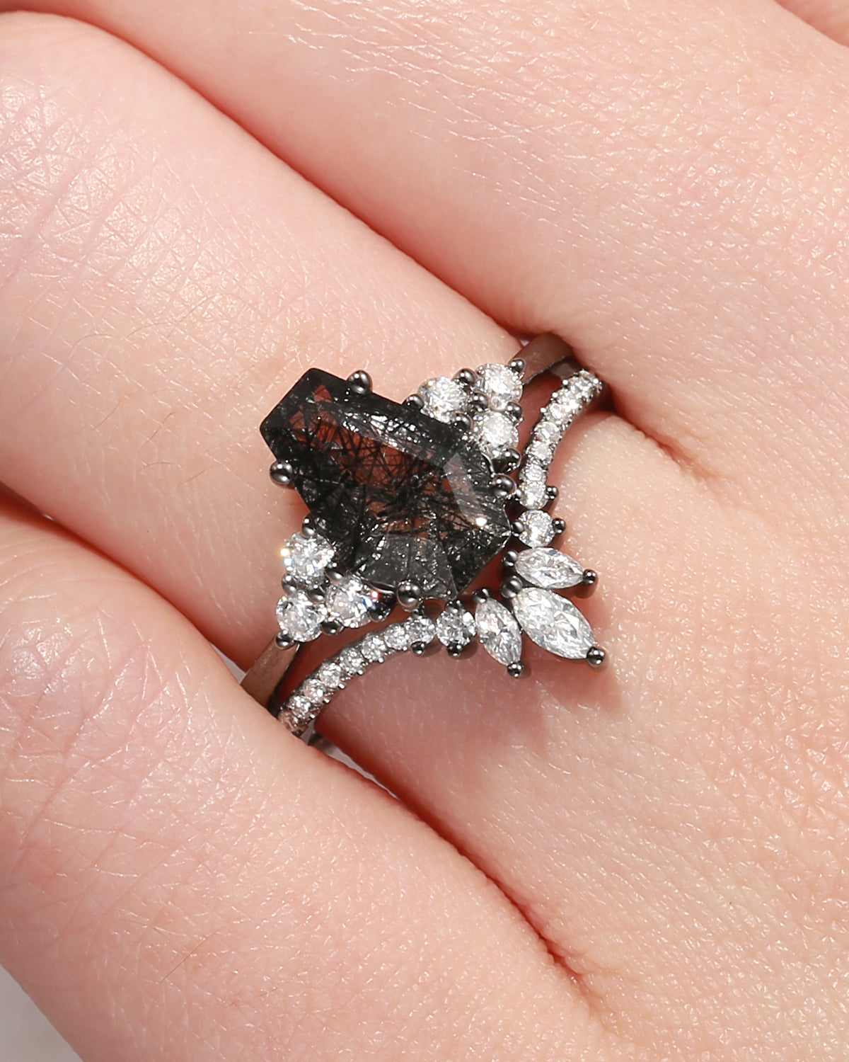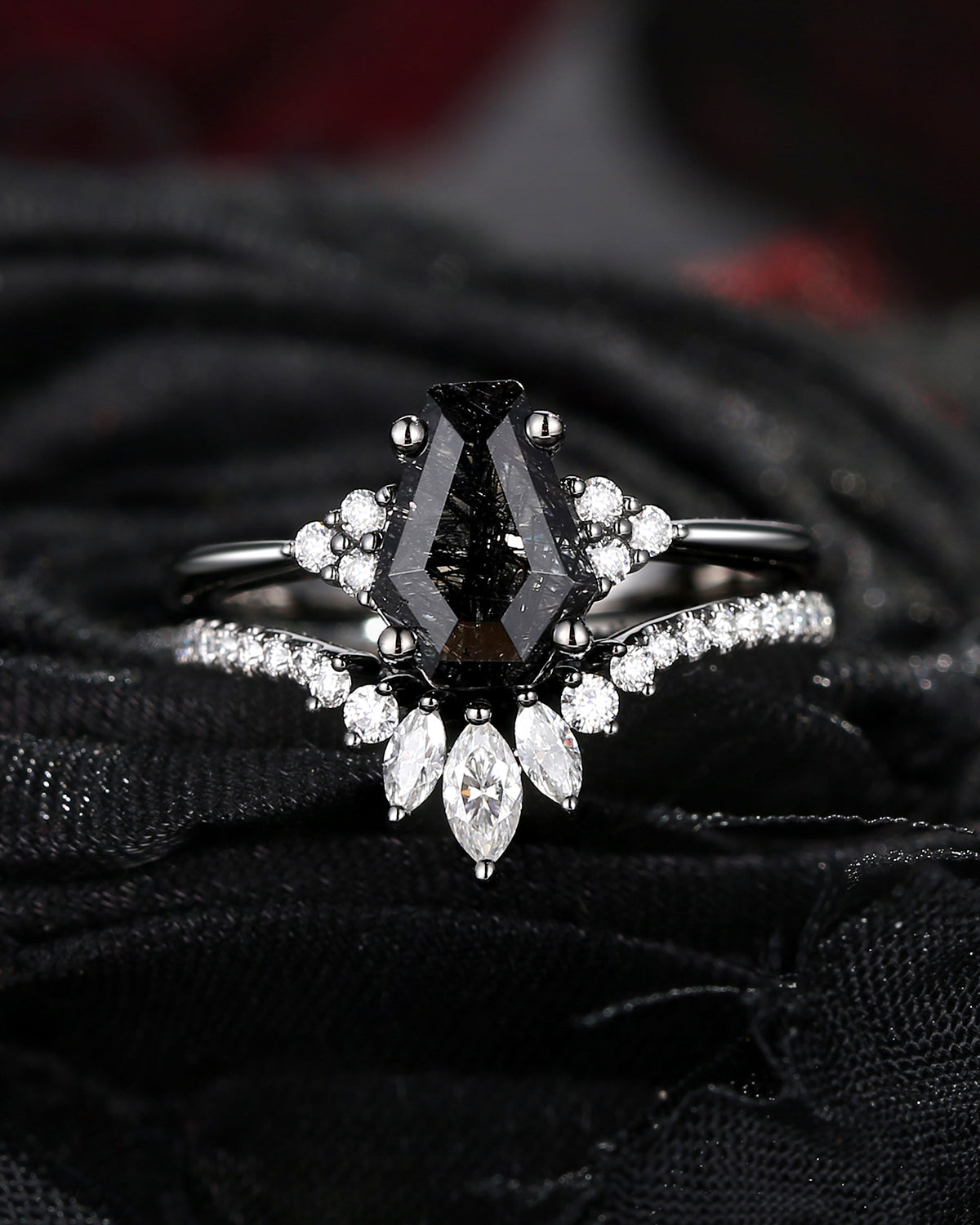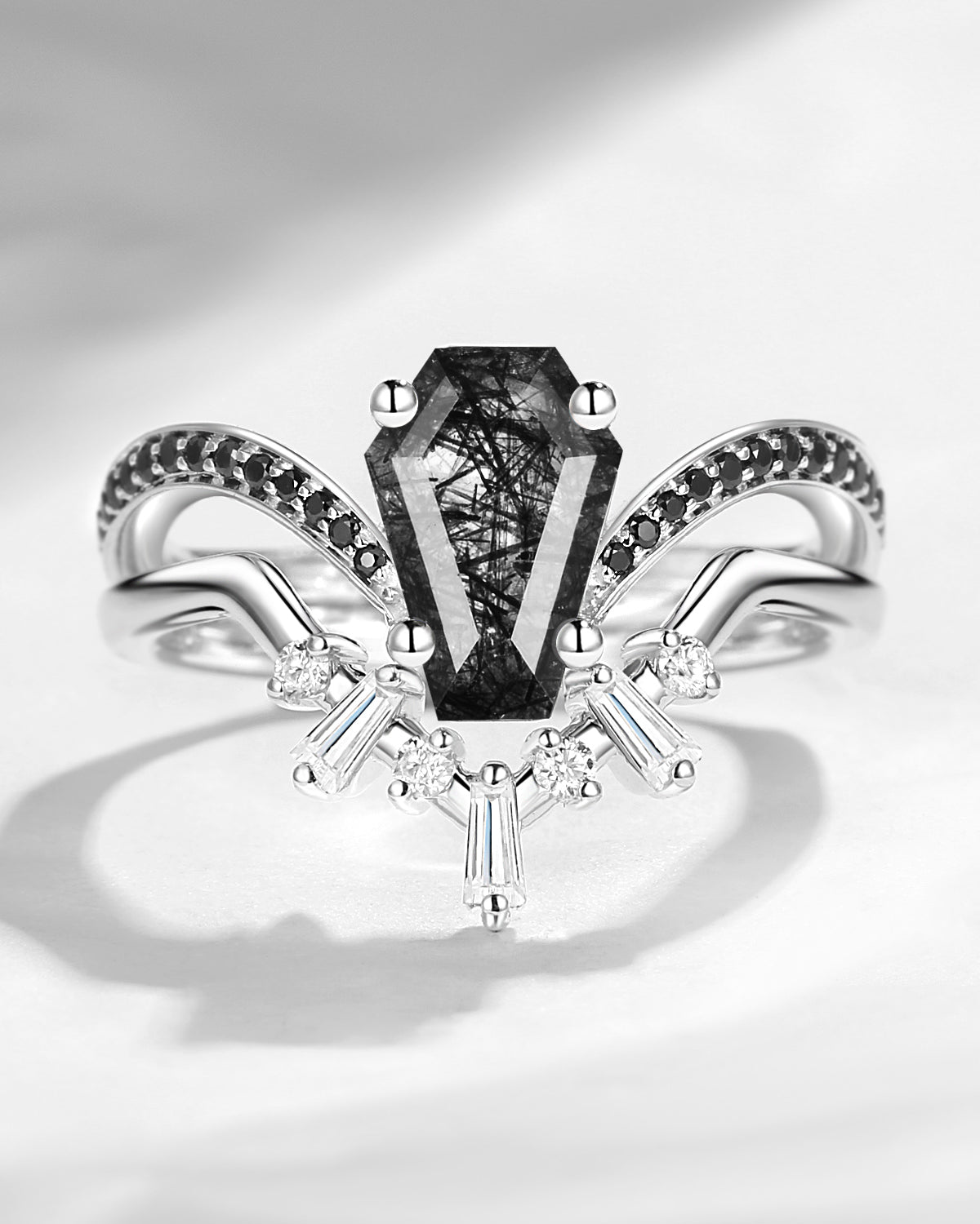 Coffin Black Rutilated Quartz Black Gold Engagement Ring 2PCS - White Dress