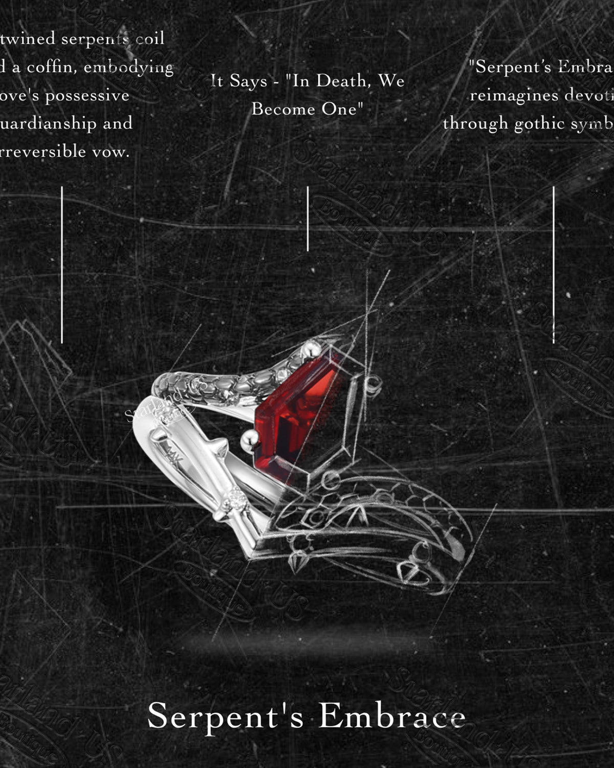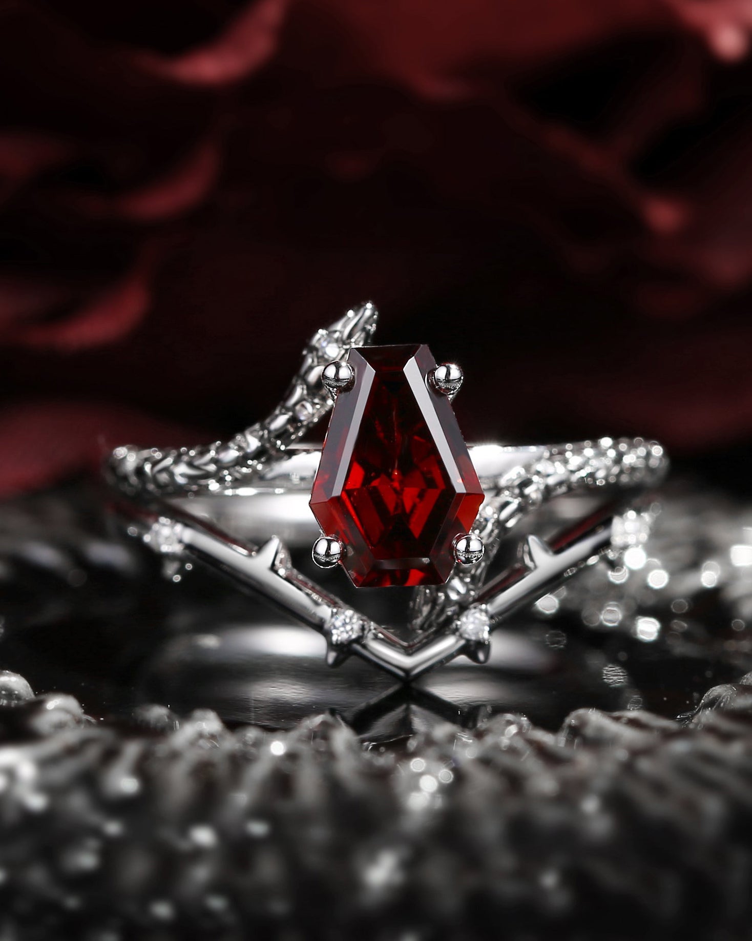 Vintage Twist Coffin Cut Garnet Engagement Ring Set 2pcs - Serpent's Embrace