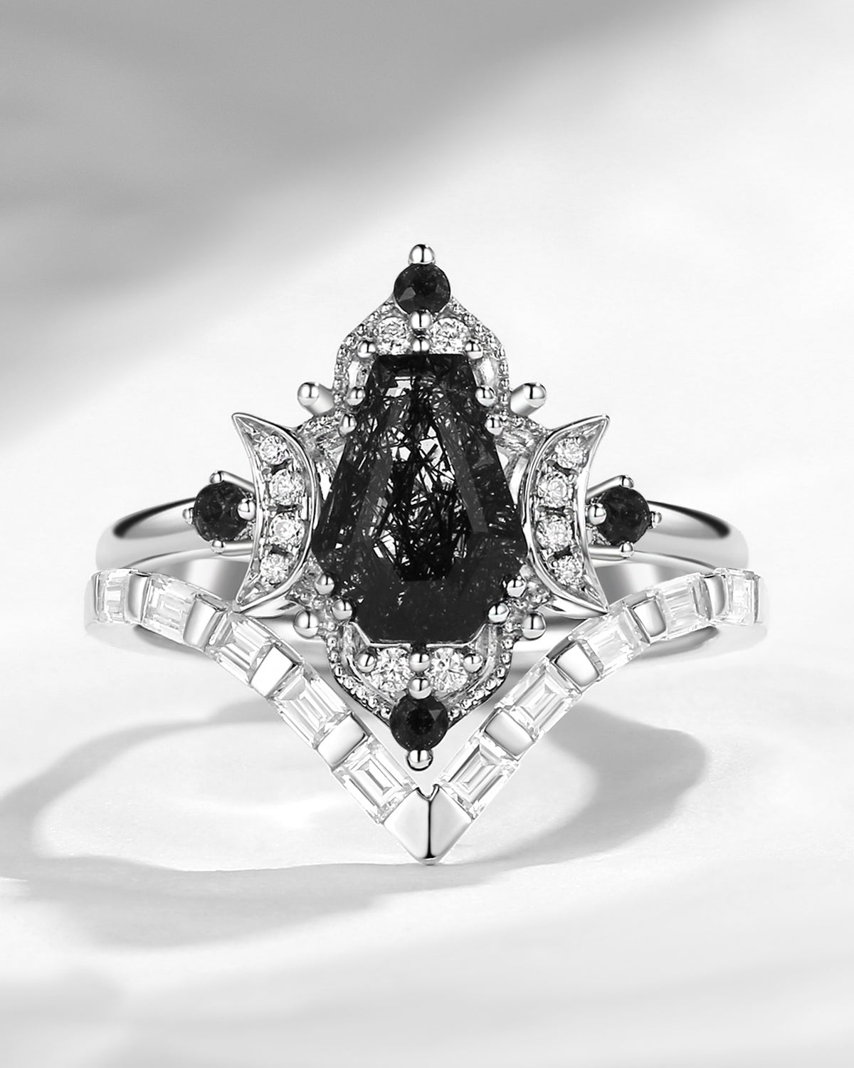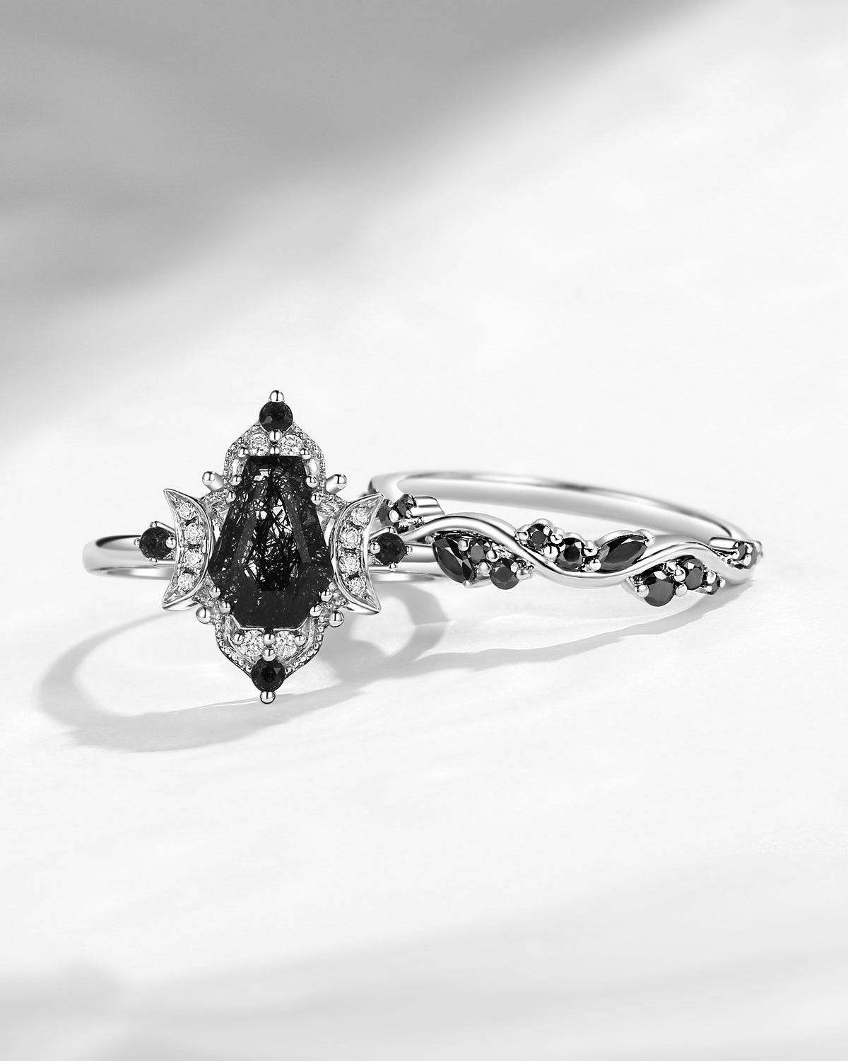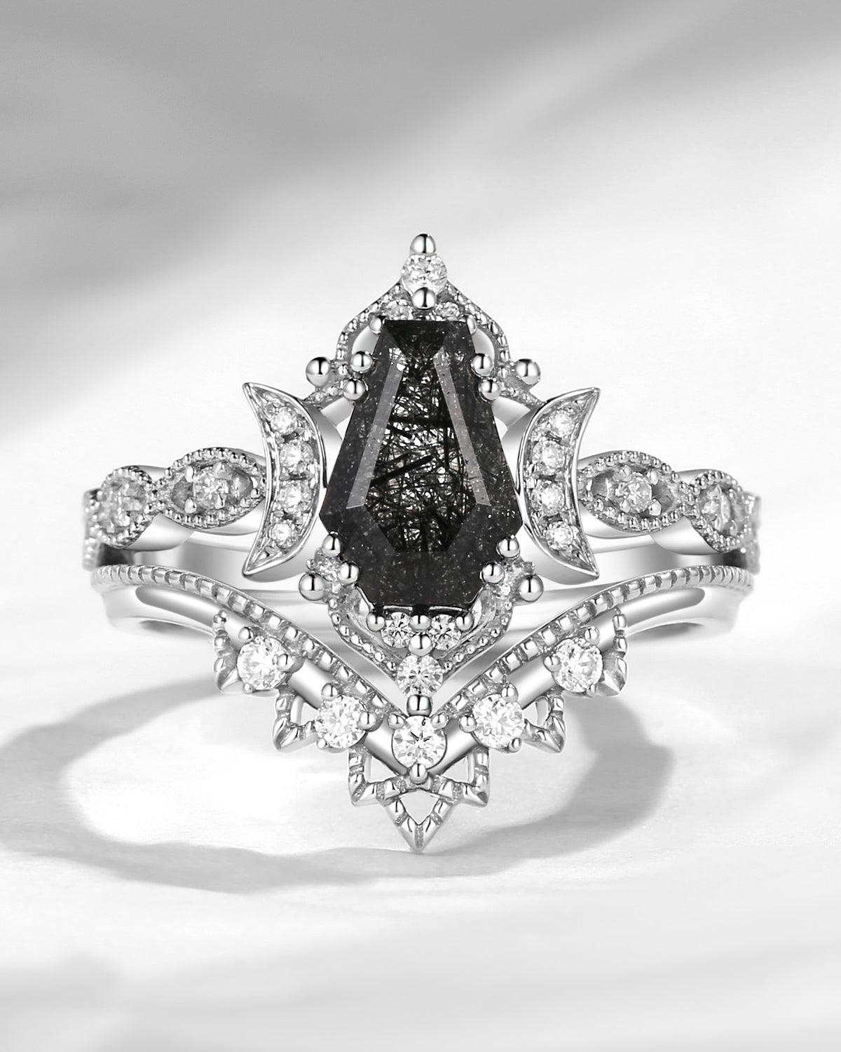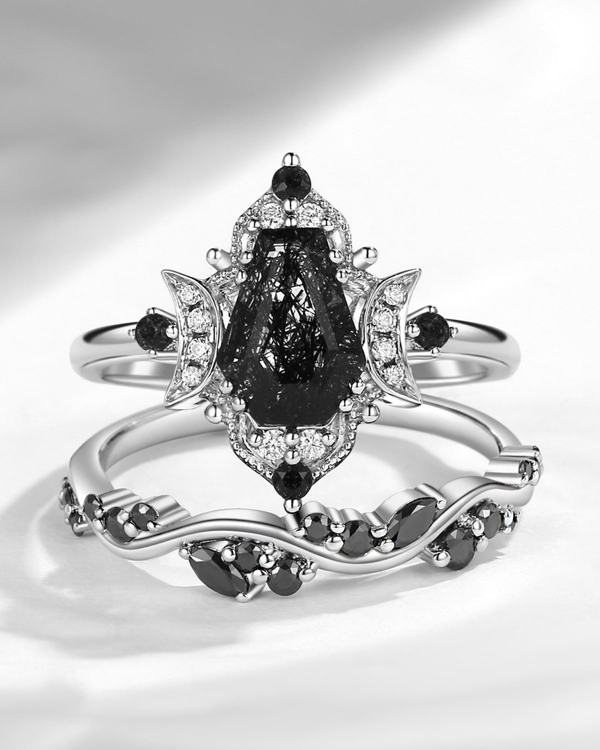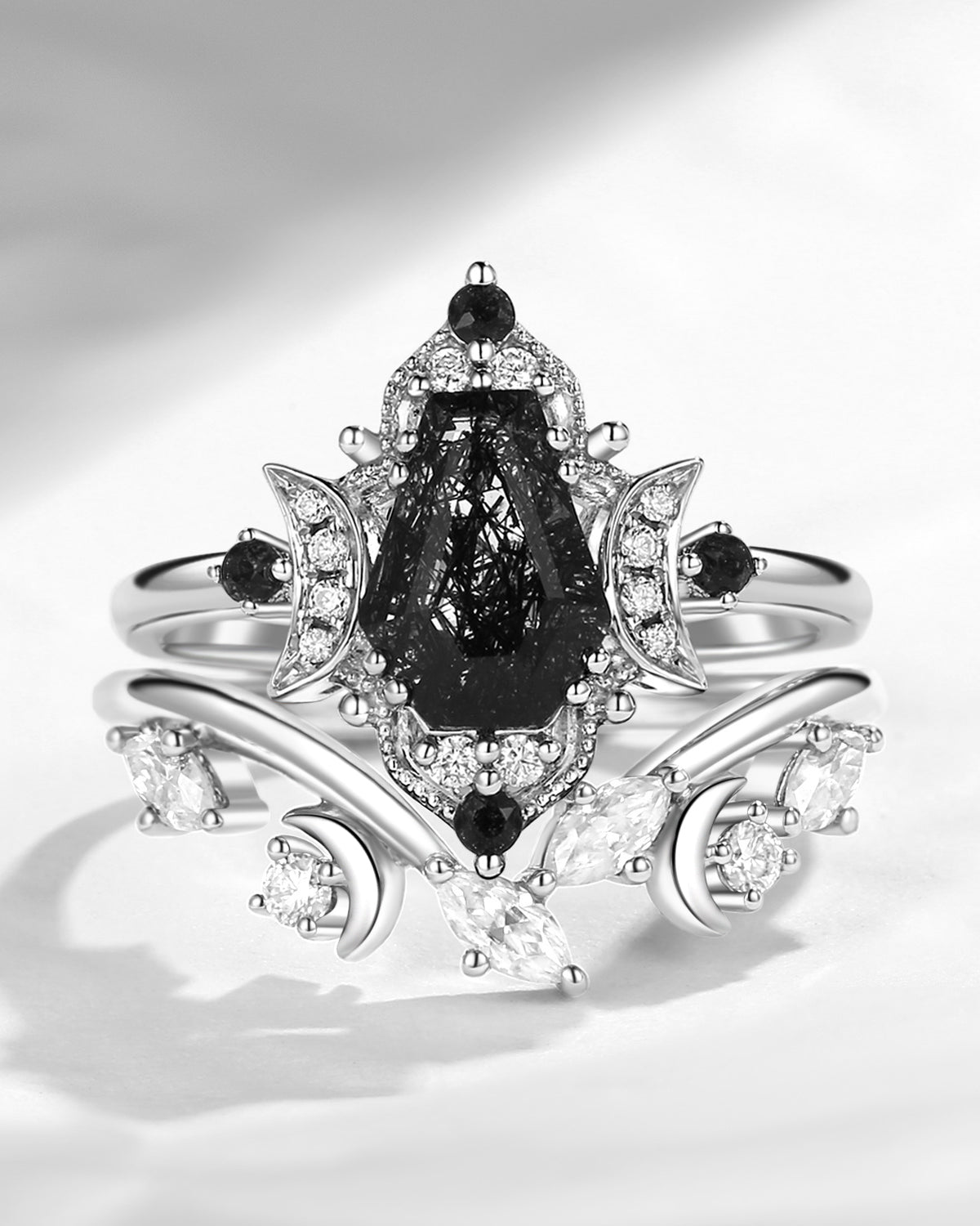 Crescent Moon | Coffin Cut Black Rutilated Quartz Engagement Ring Set 2pcs
