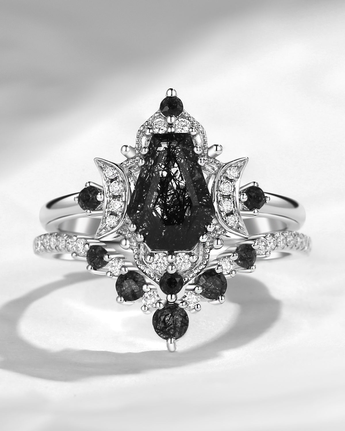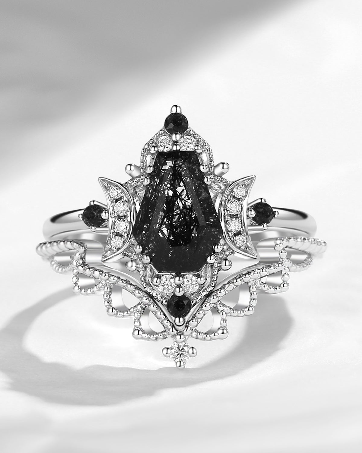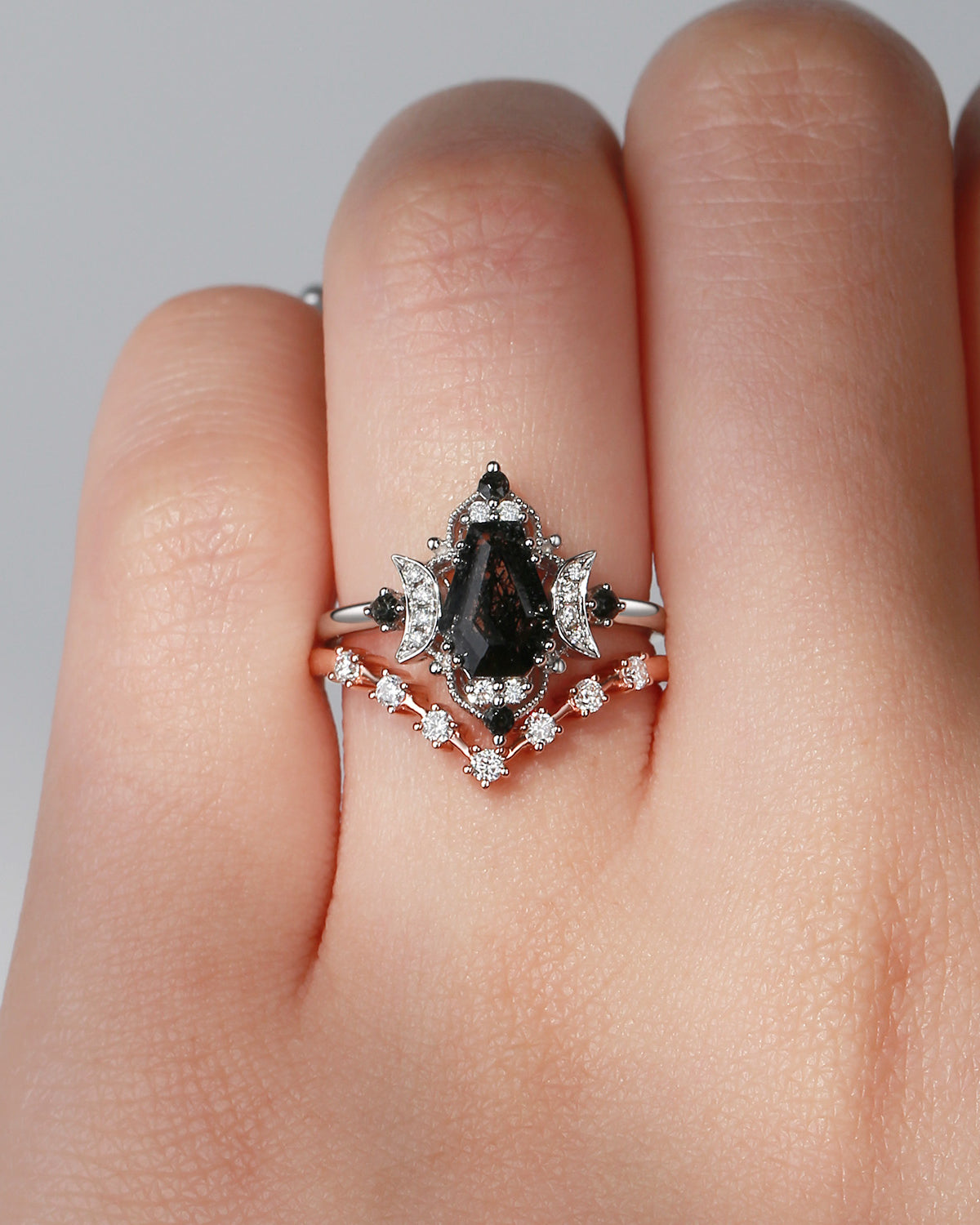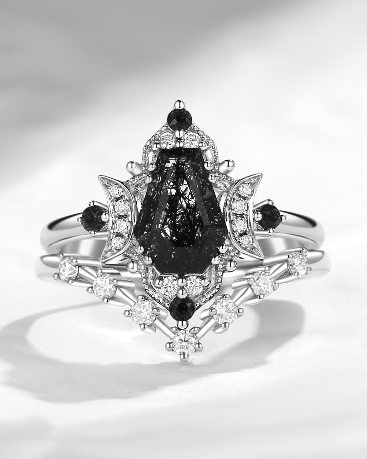 Crescent Moon | Coffin Cut Black Rutilated Quartz Engagement Ring Set 2pcs