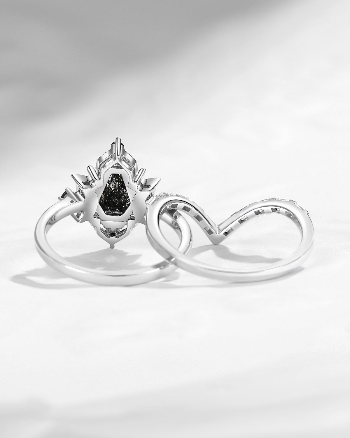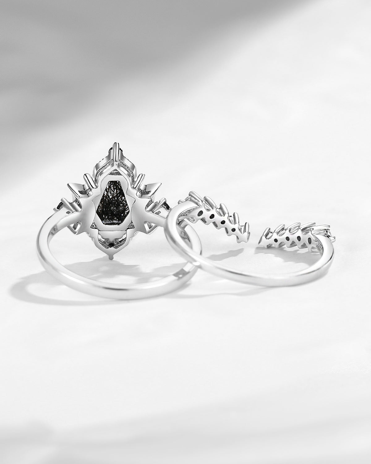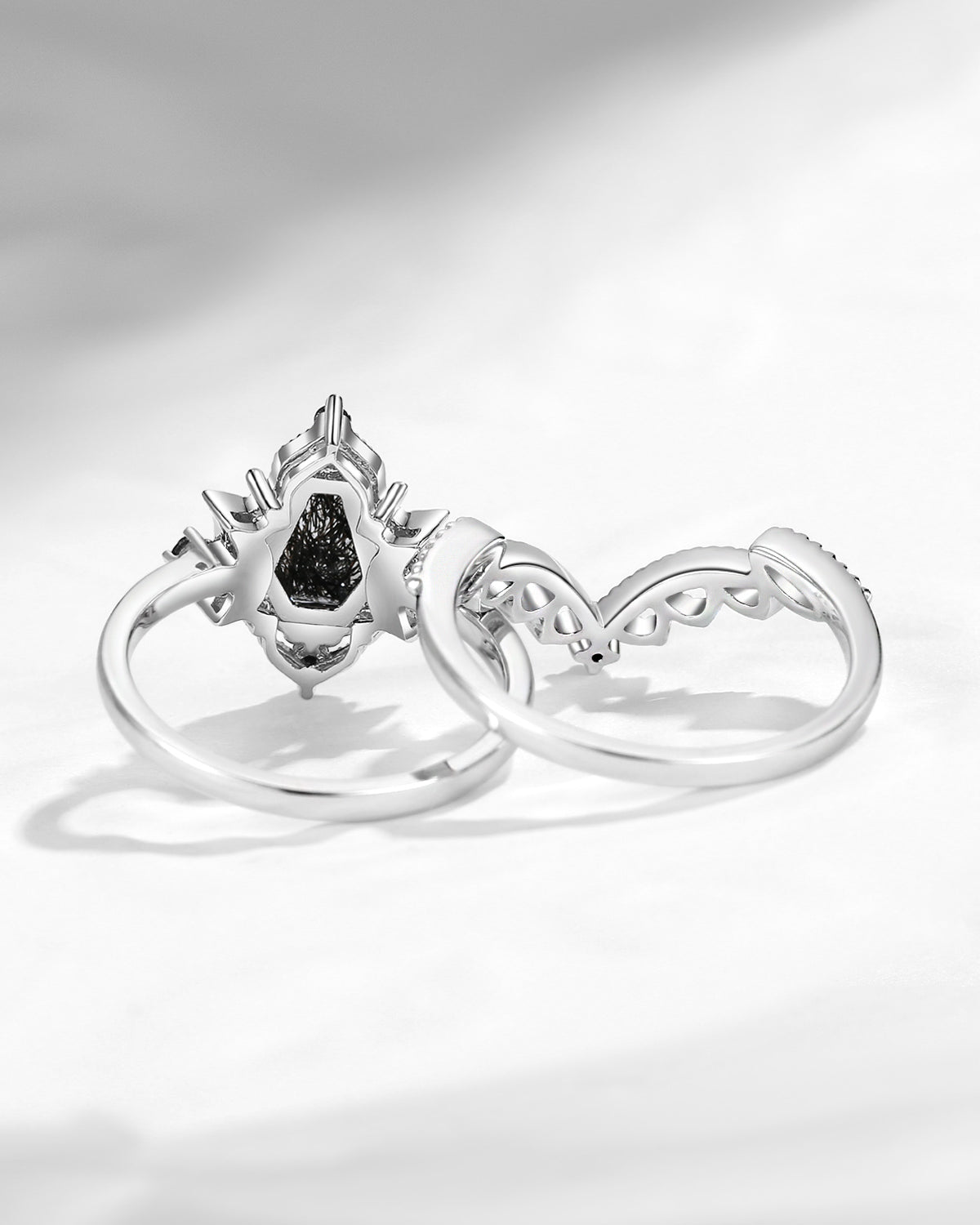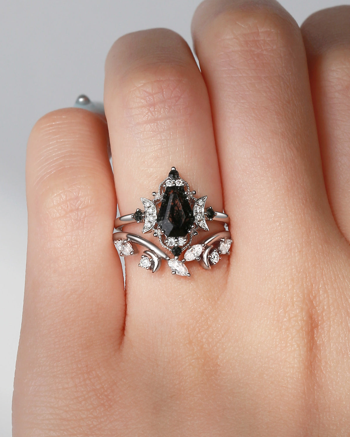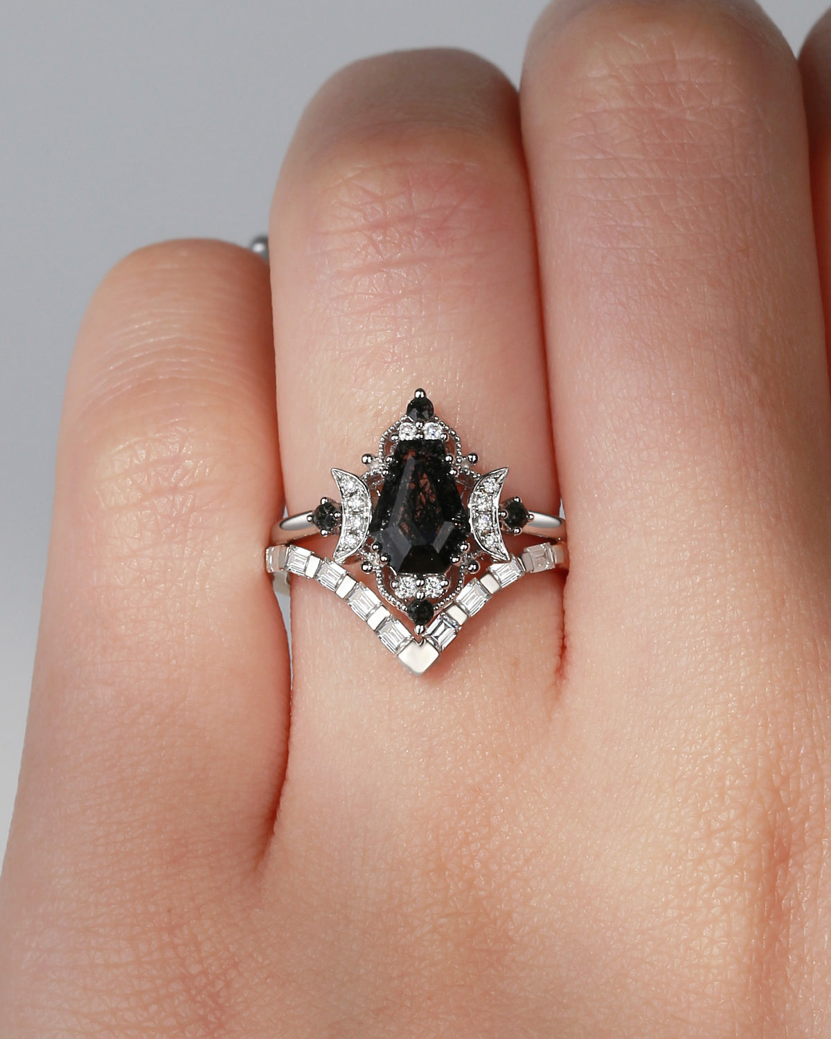 Crescent Moon | Coffin Cut Black Rutilated Quartz Engagement Ring Set 2pcs