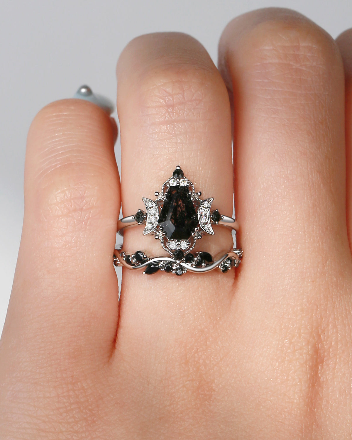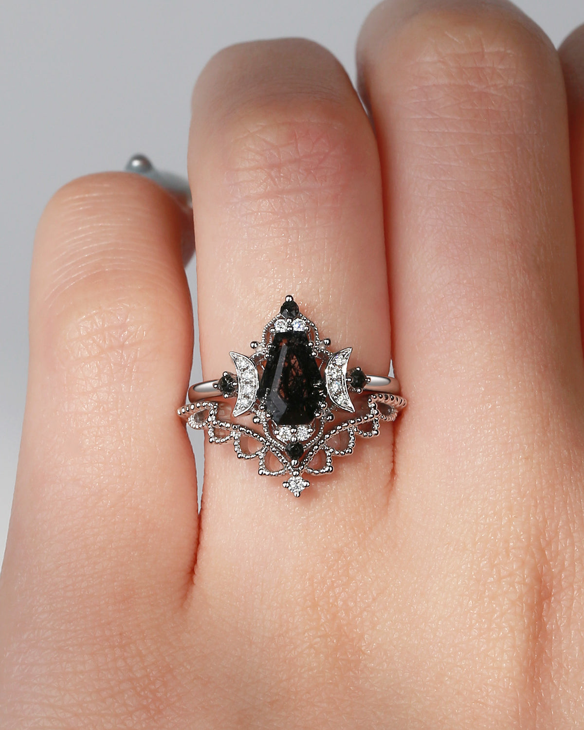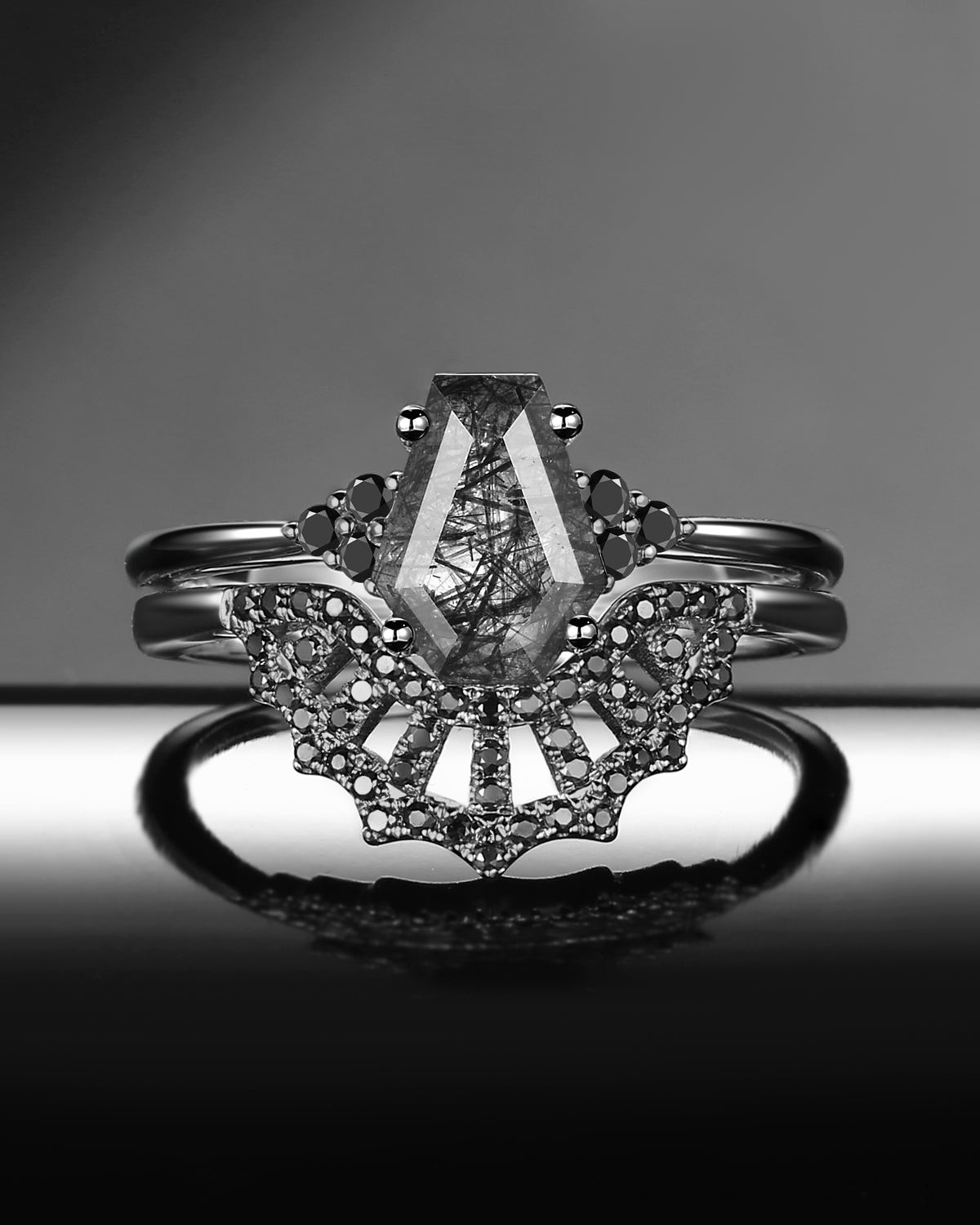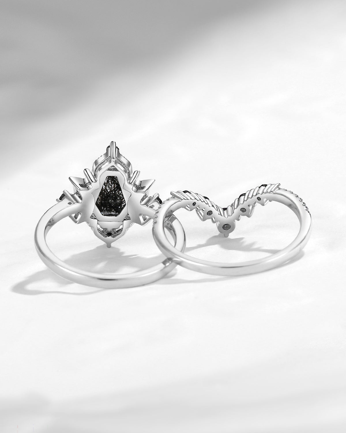 Crescent Moon | Coffin Cut Black Rutilated Quartz Engagement Ring Set 2pcs