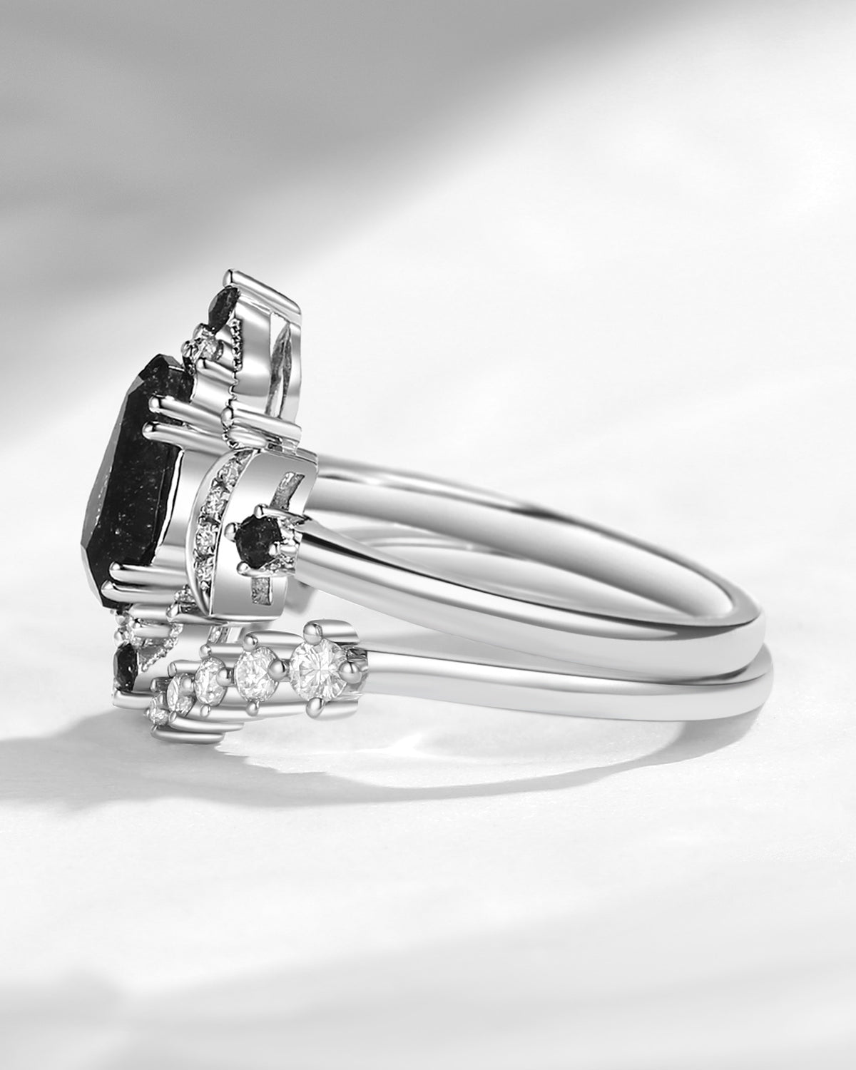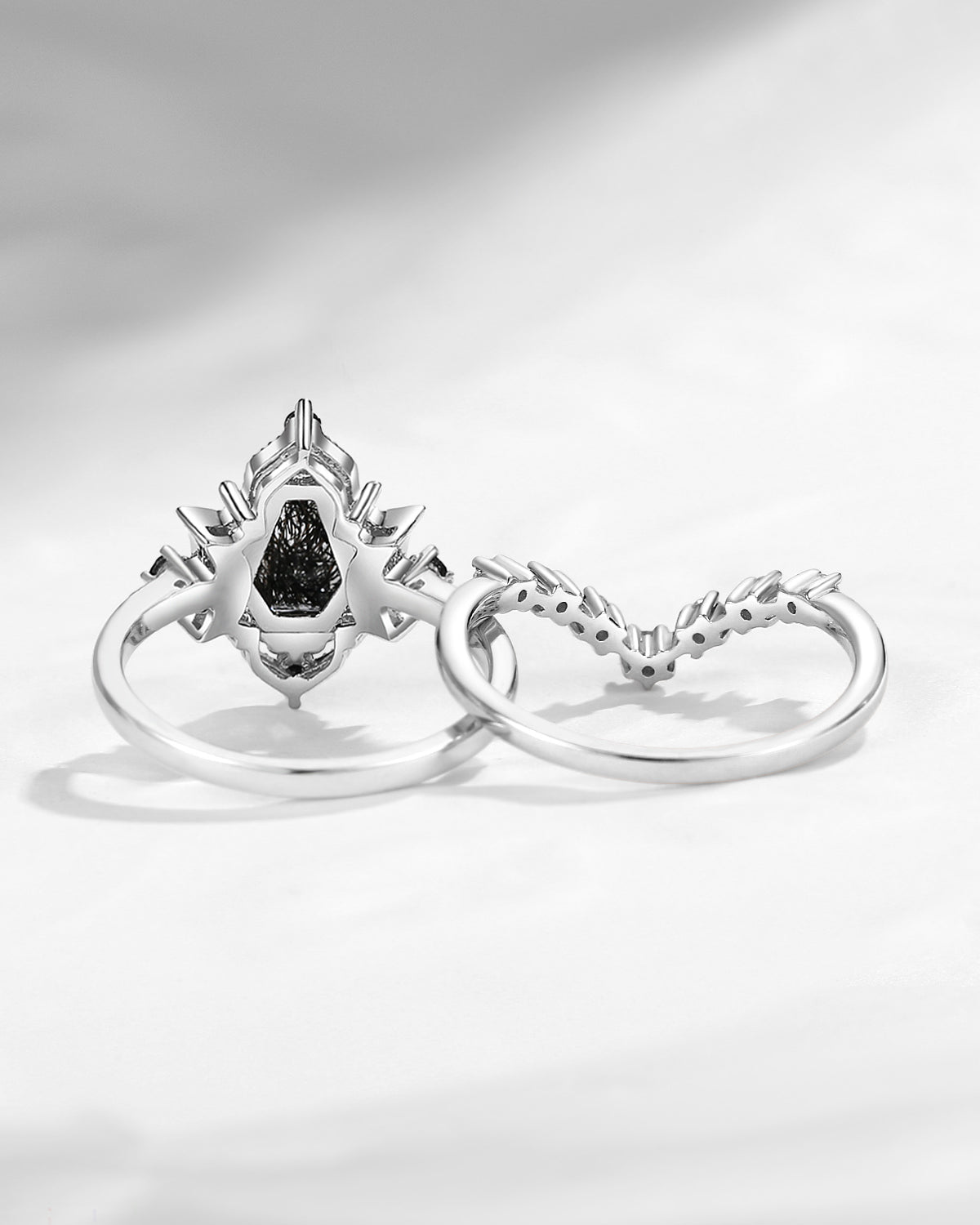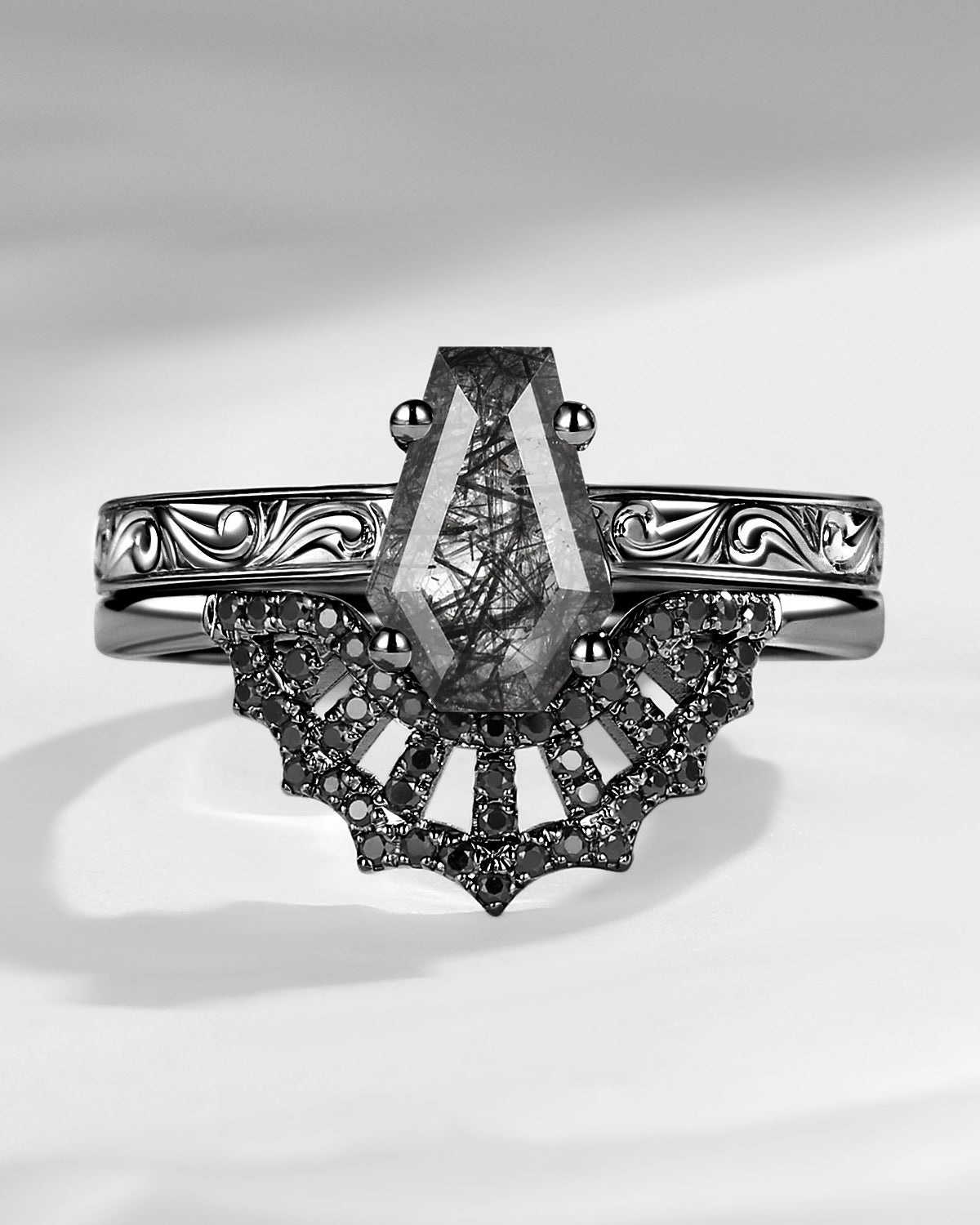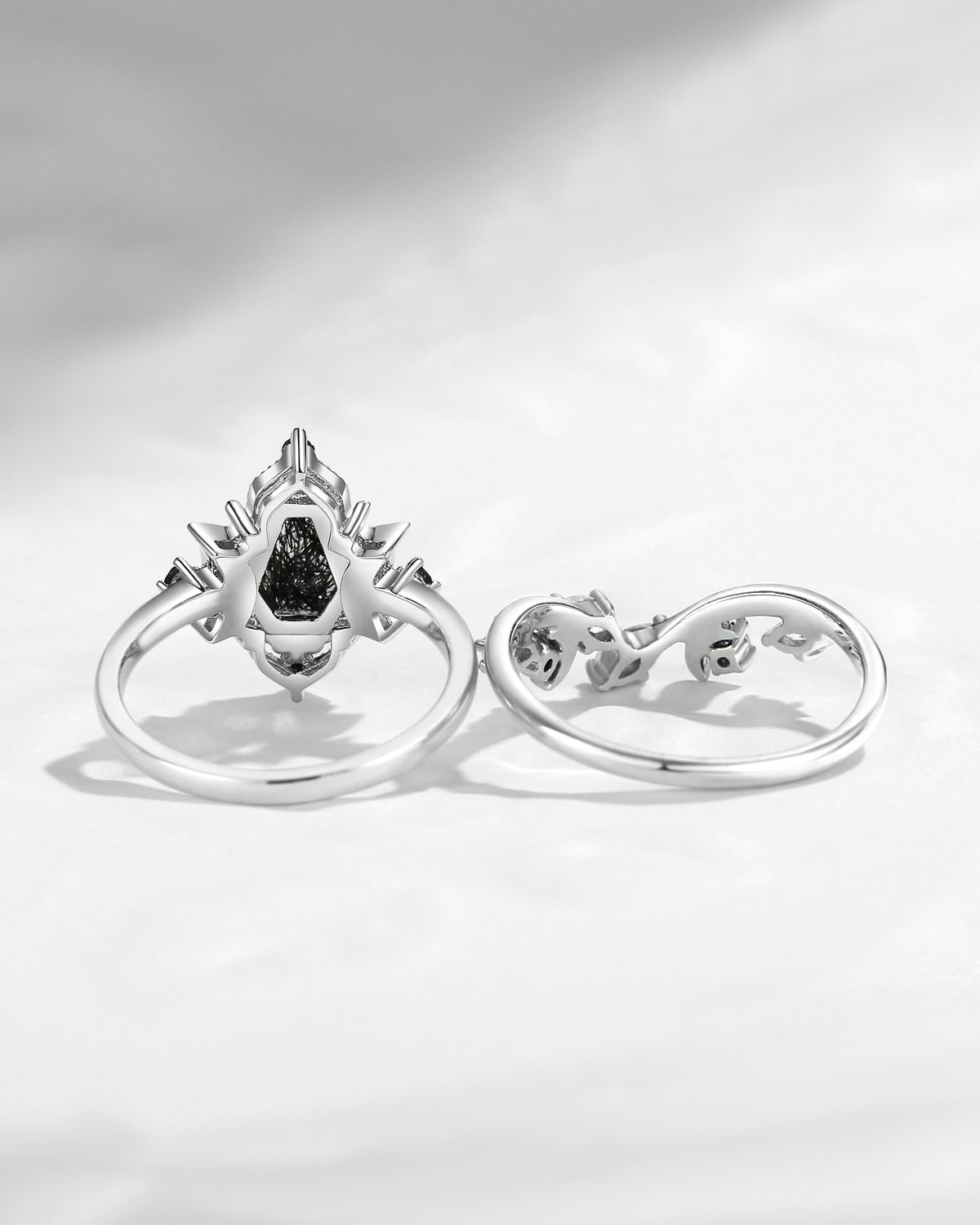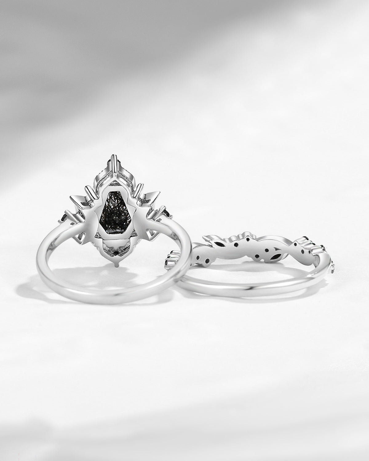 Crescent Moon | Coffin Cut Black Rutilated Quartz Engagement Ring Set 2pcs