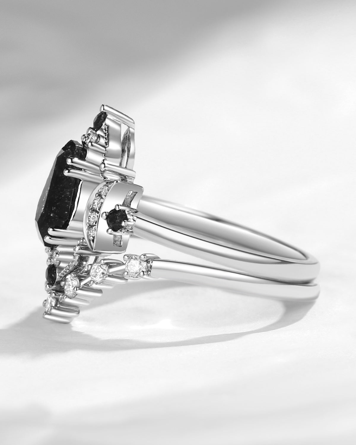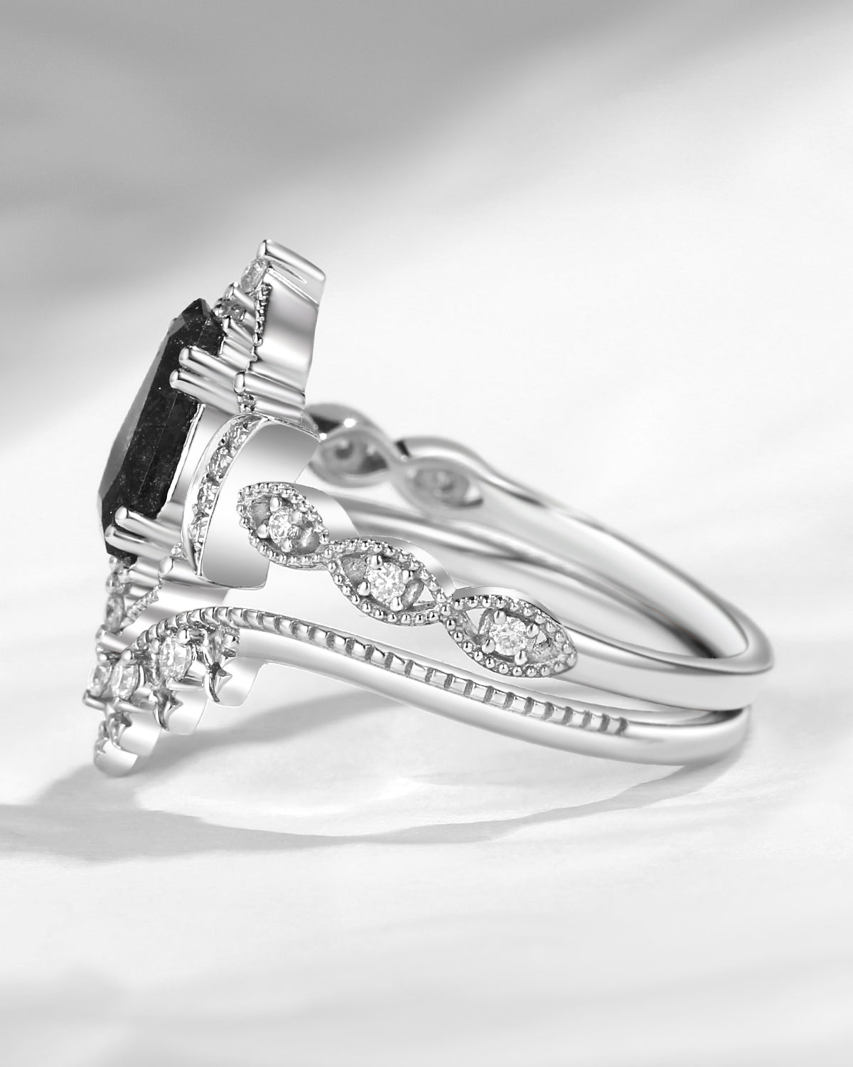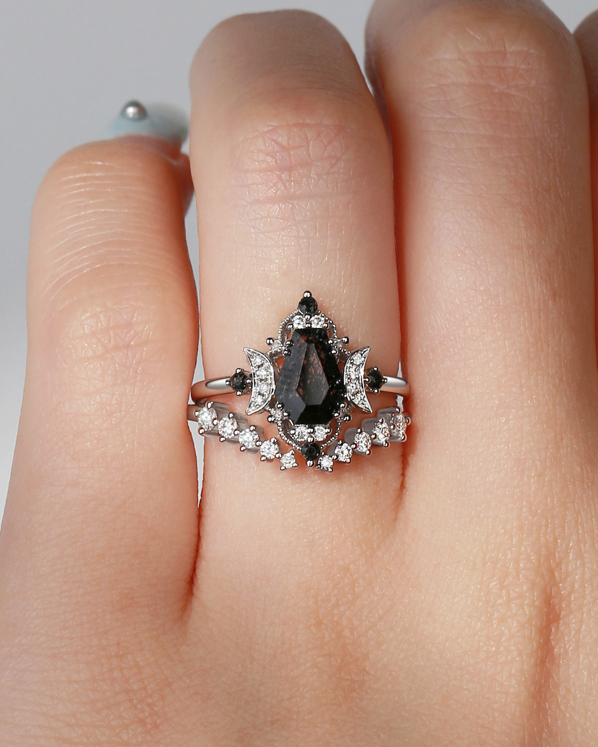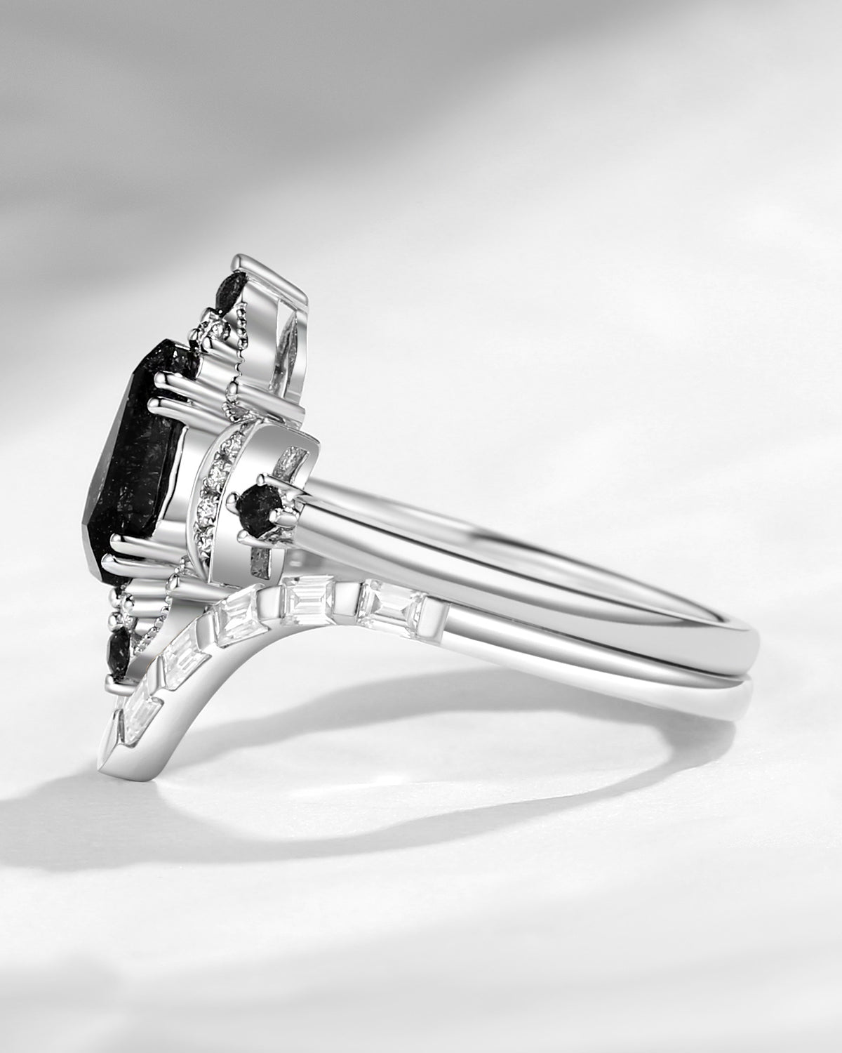 Crescent Moon | Coffin Cut Black Rutilated Quartz Engagement Ring Set 2pcs