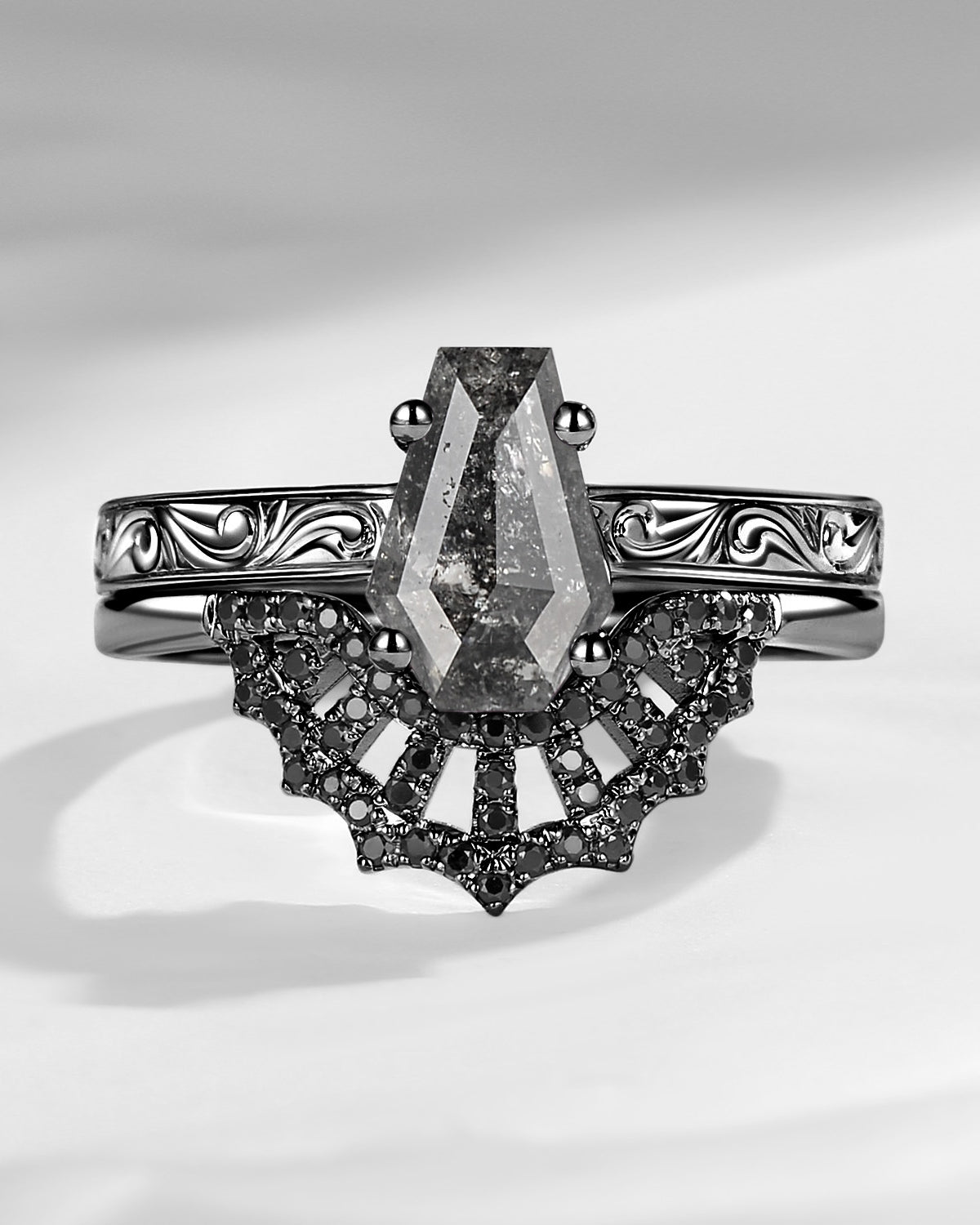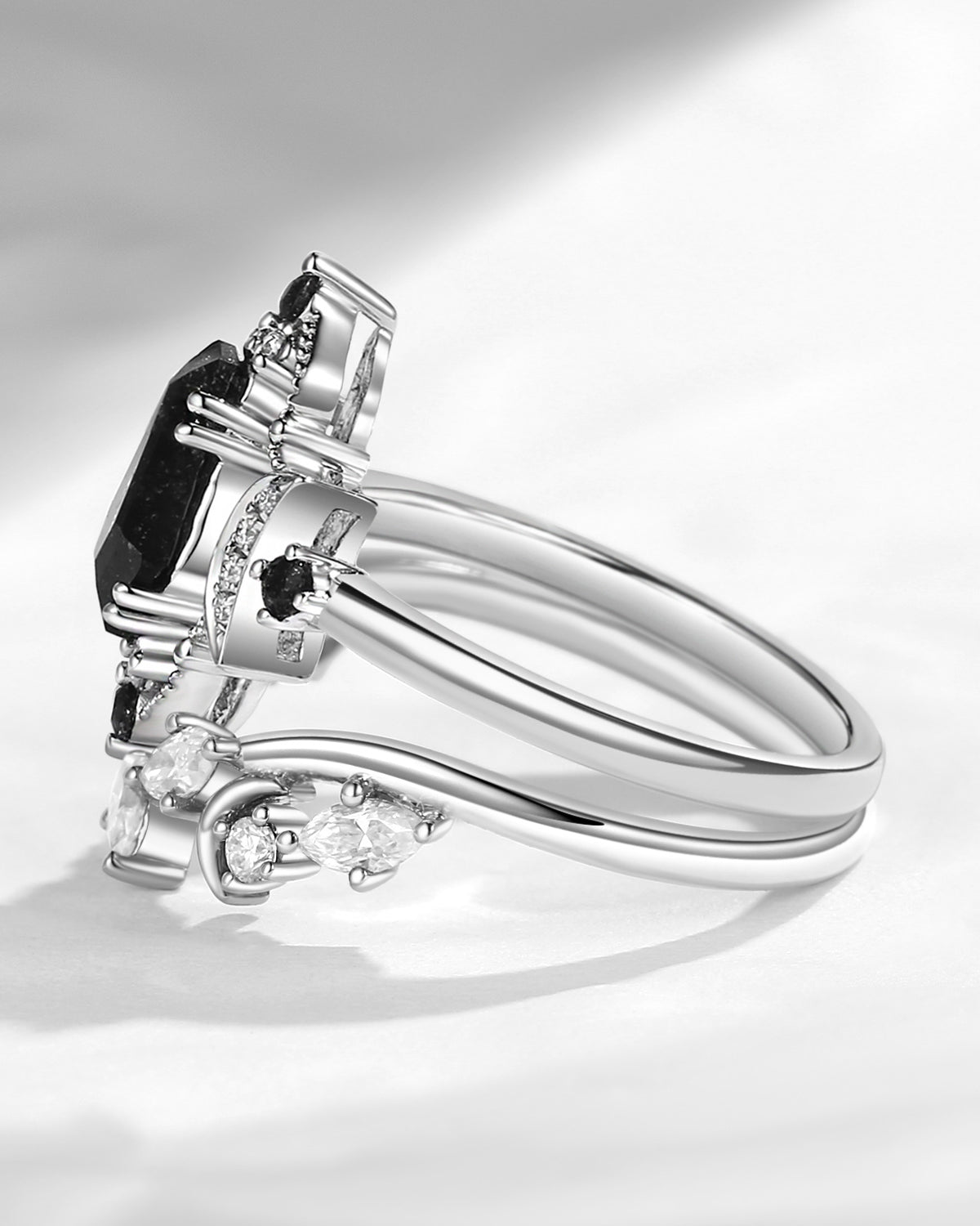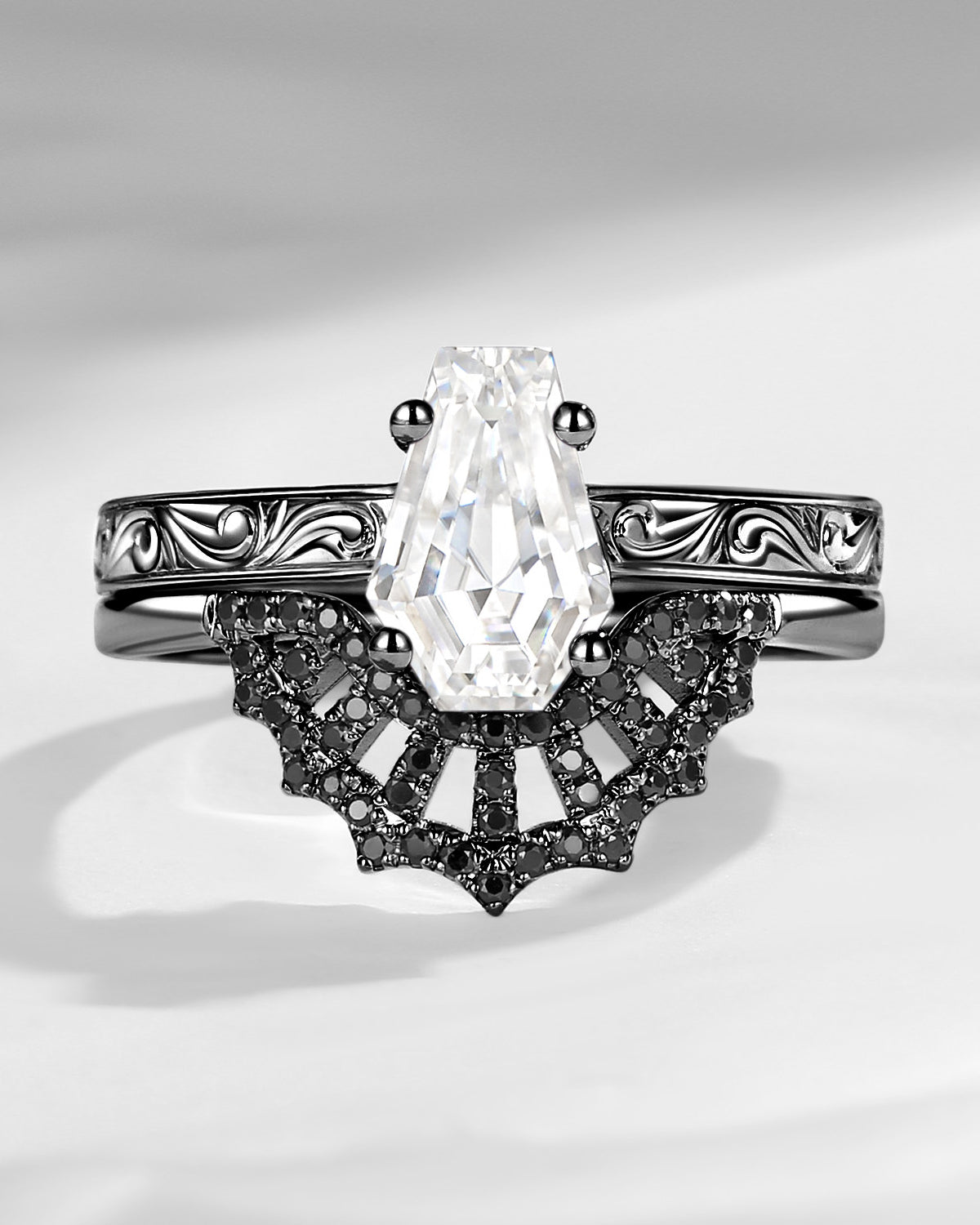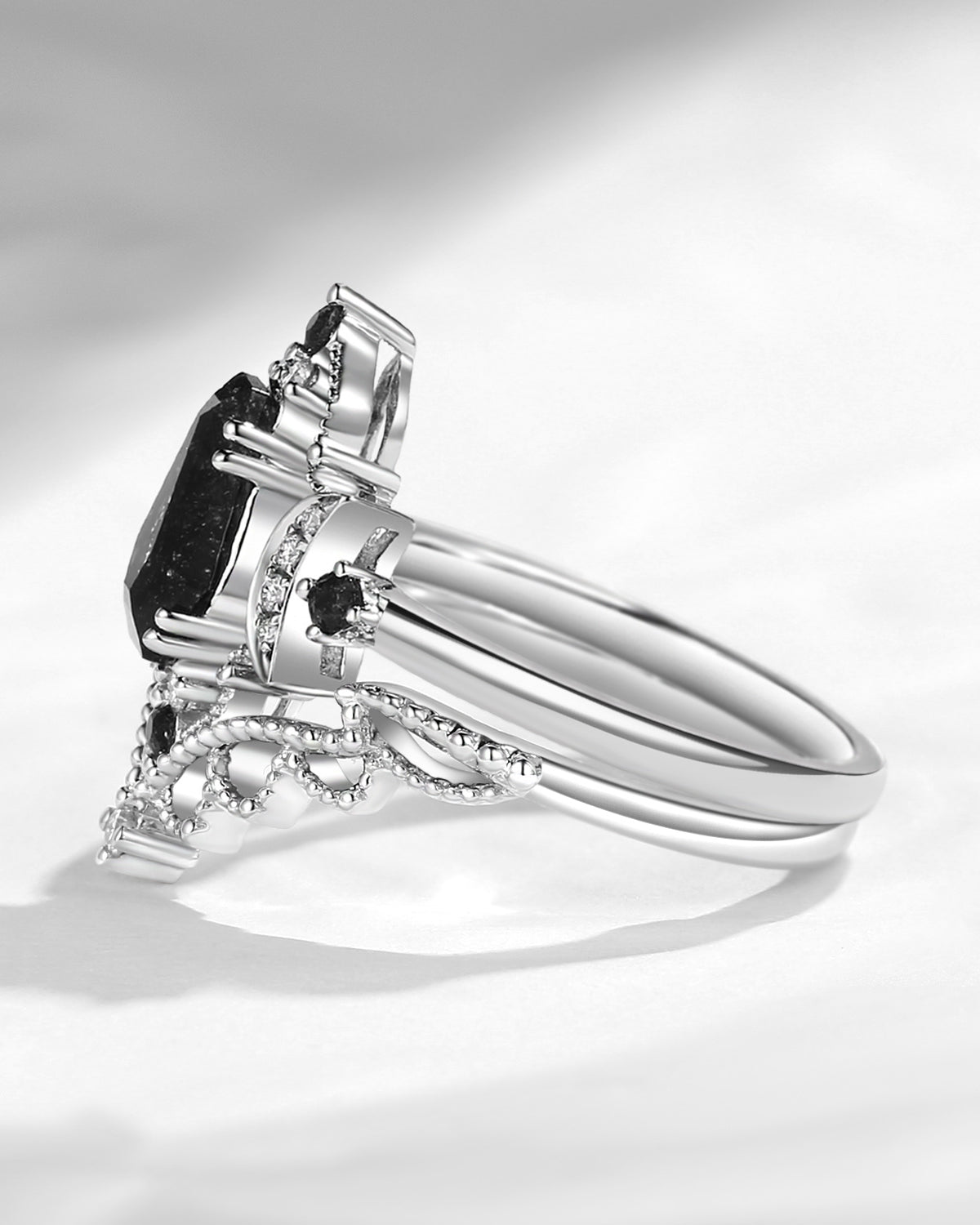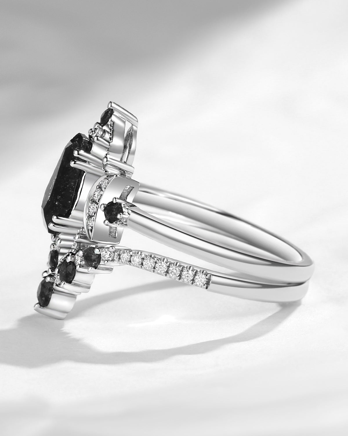 Crescent Moon | Coffin Cut Black Rutilated Quartz Engagement Ring Set 2pcs