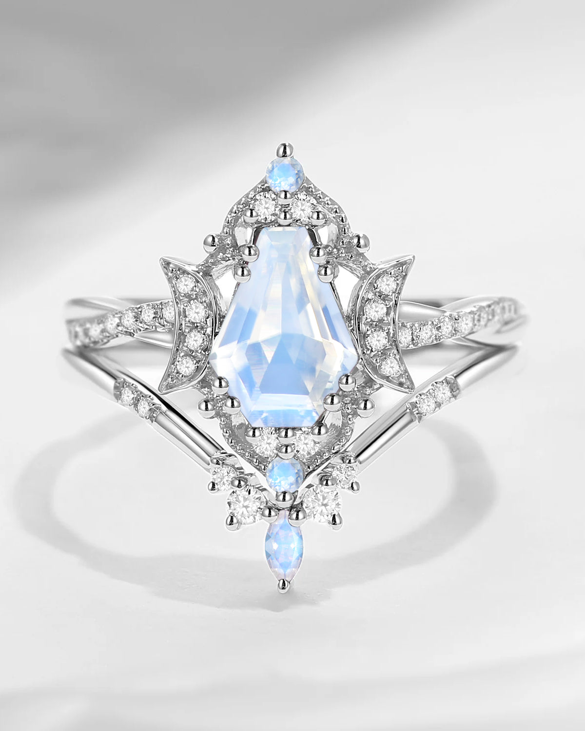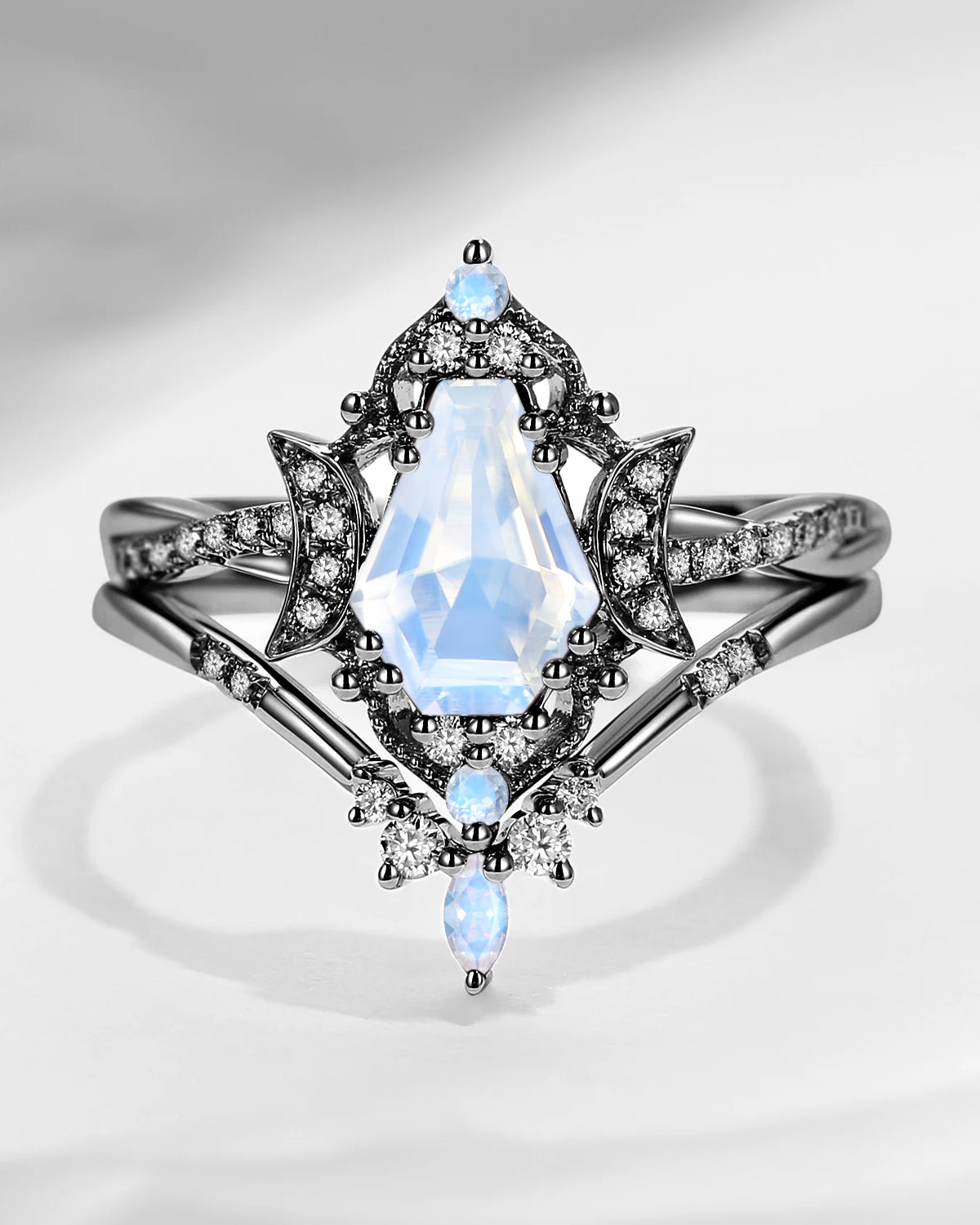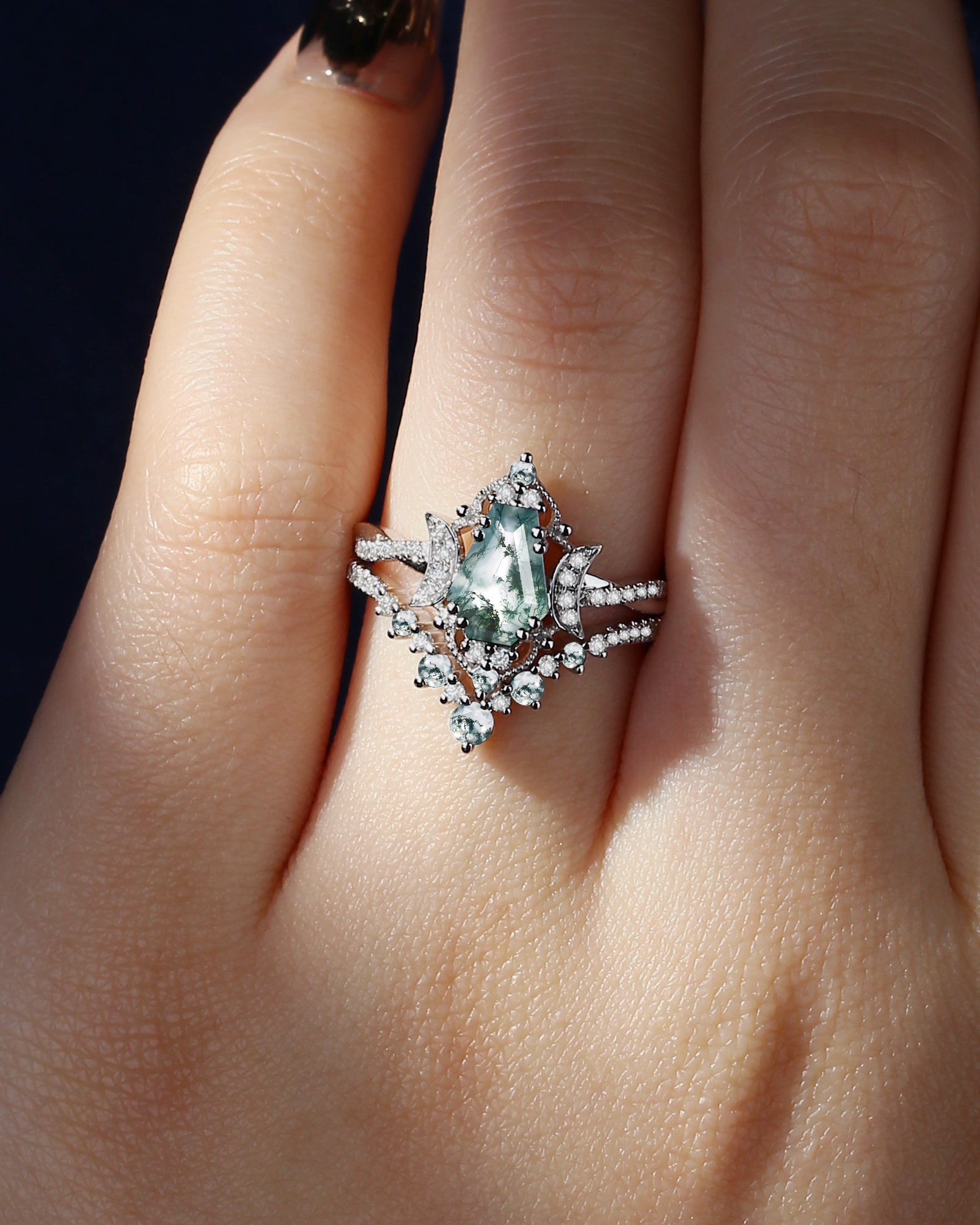 Crescent Moon | Coffin Cut Moss Agate Bridal Set 2pcs Moon Infinity Ring