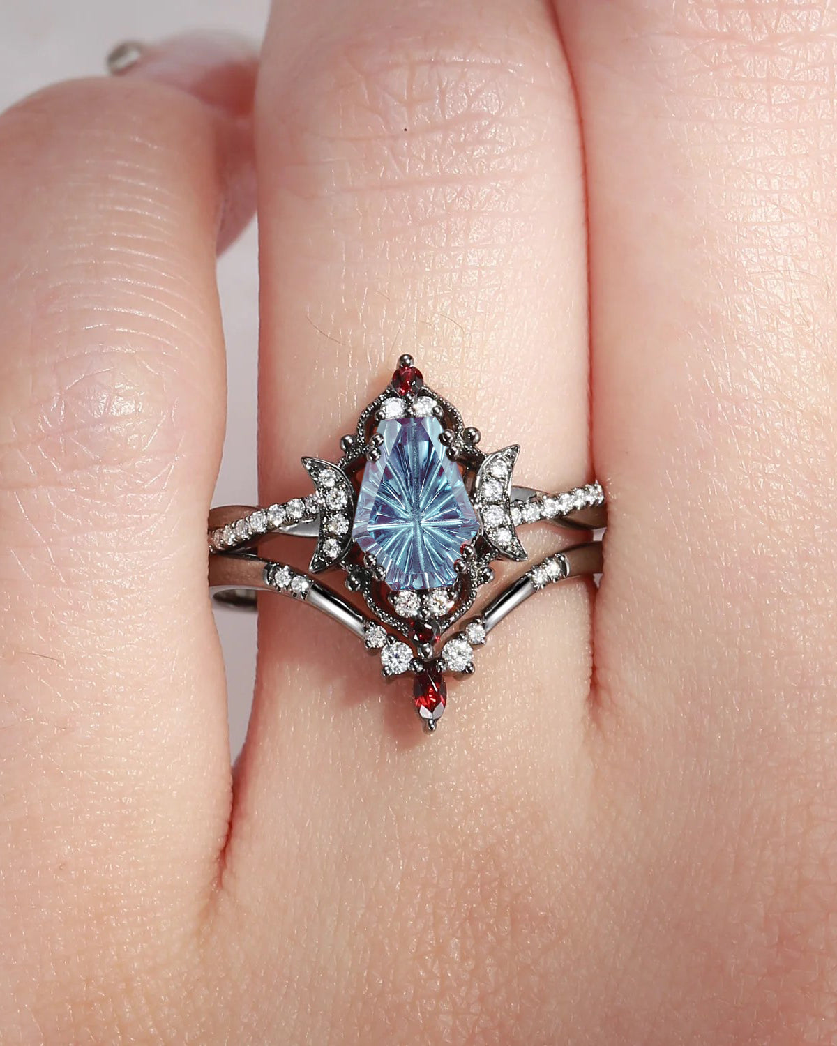Gothic Love Coffin Cut Garnet Vampire Engagement Ring Set 3pcs