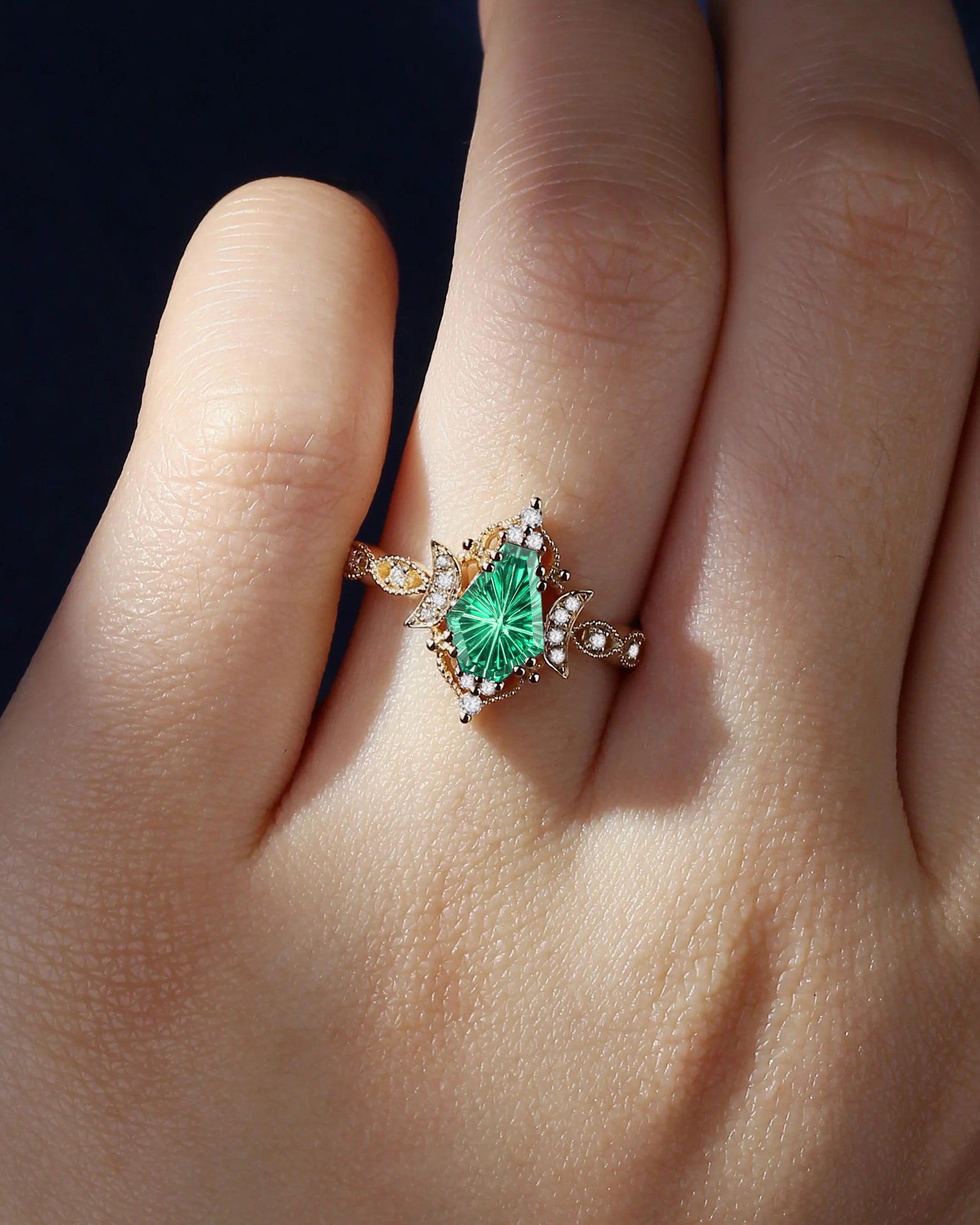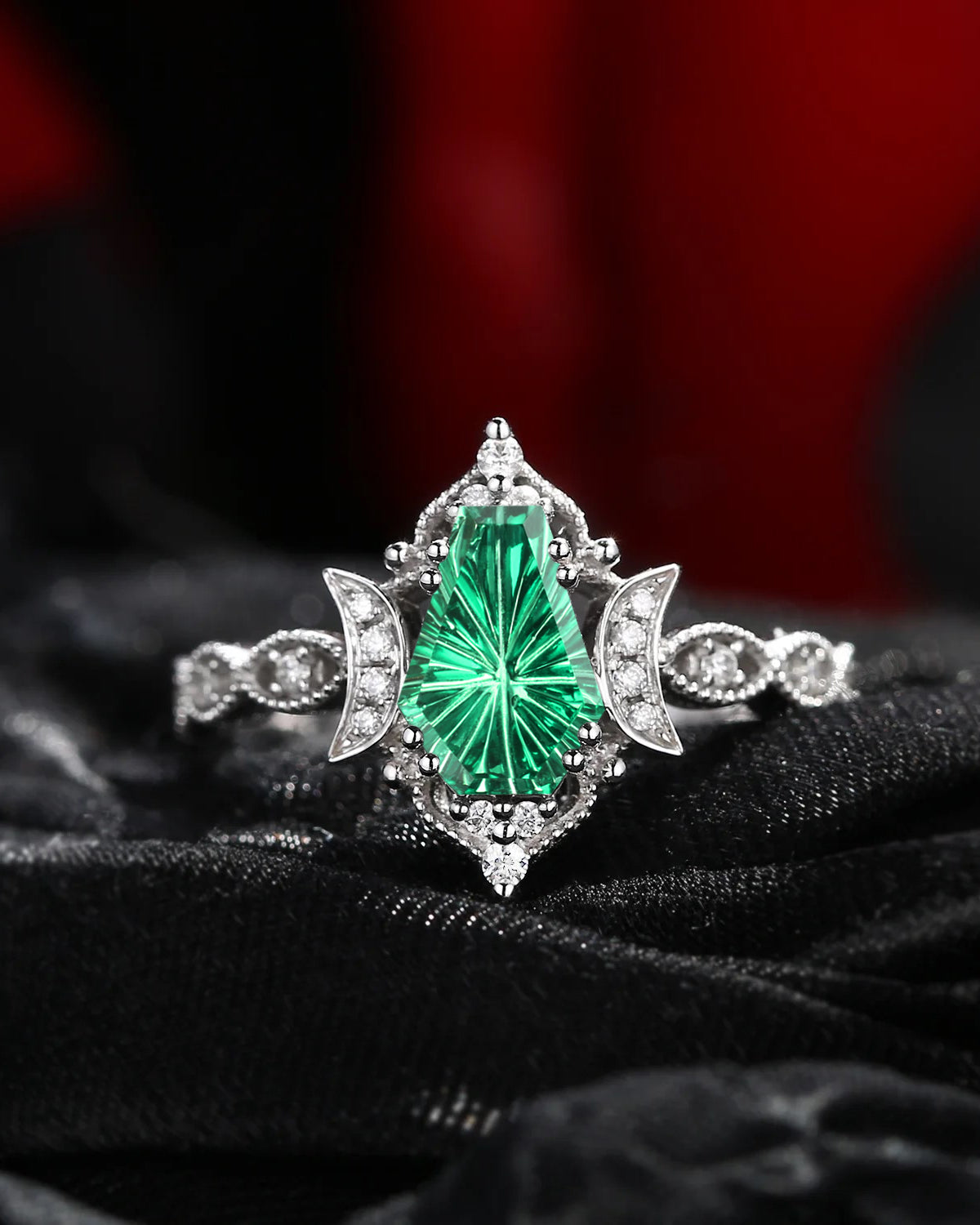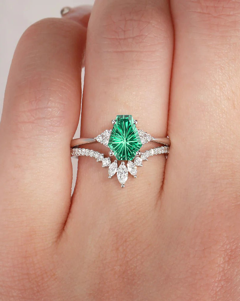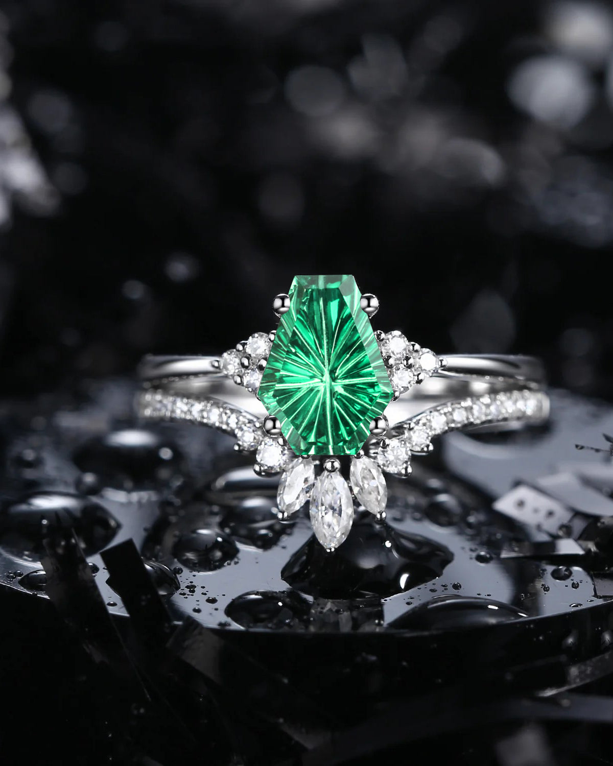 Unique Firework Cut Coffin Lab Emerald Engagement Ring Set 2pcs - Coffin Kite