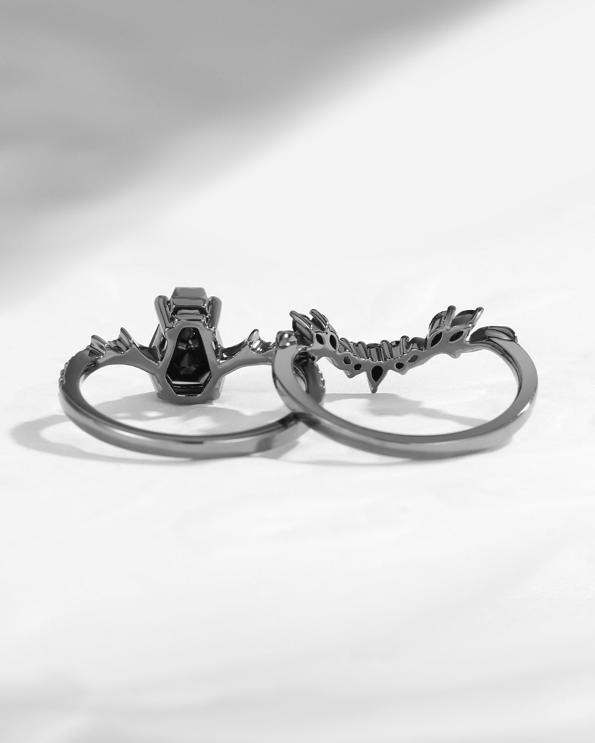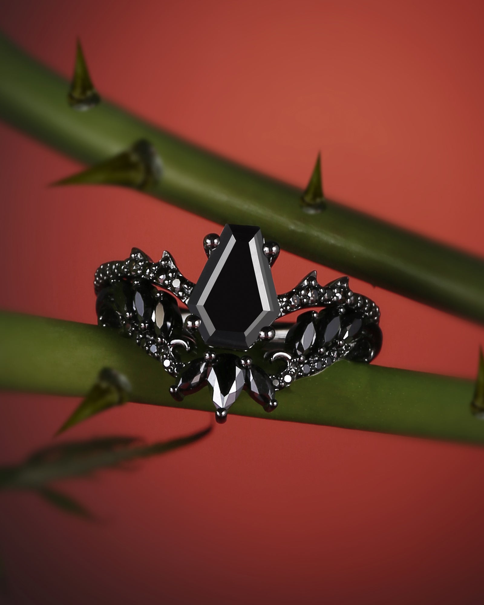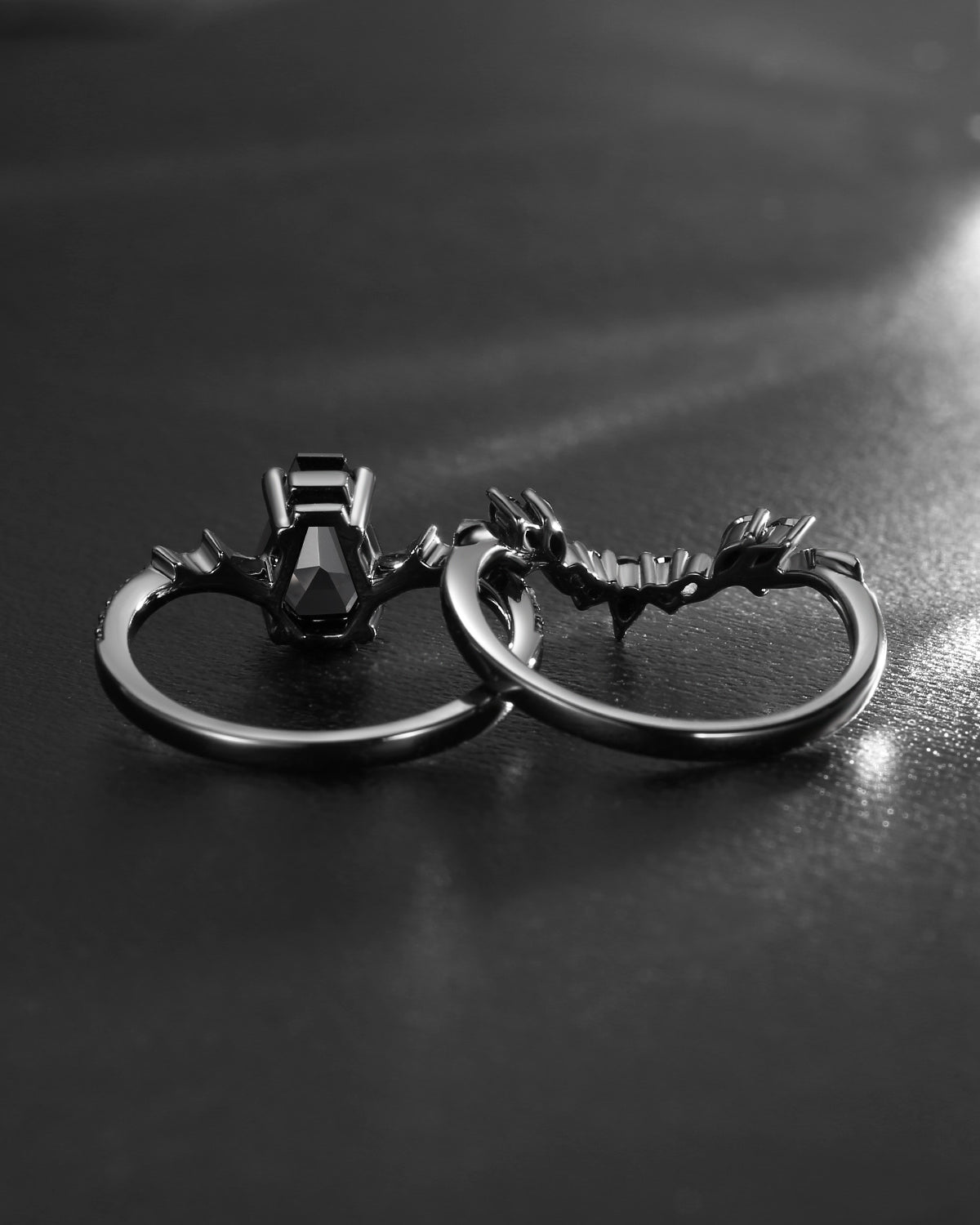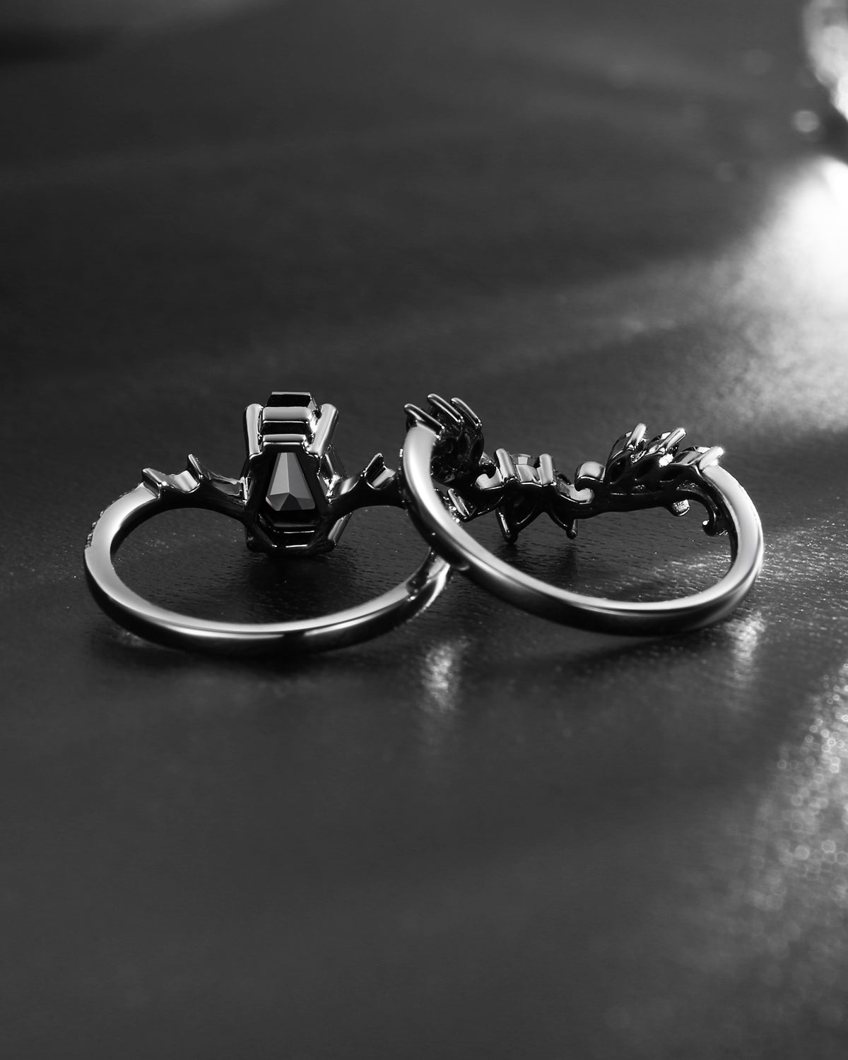 Gothic Style Coffin Black Moissanite Vine And Thorns Engagement Ring 2pcs