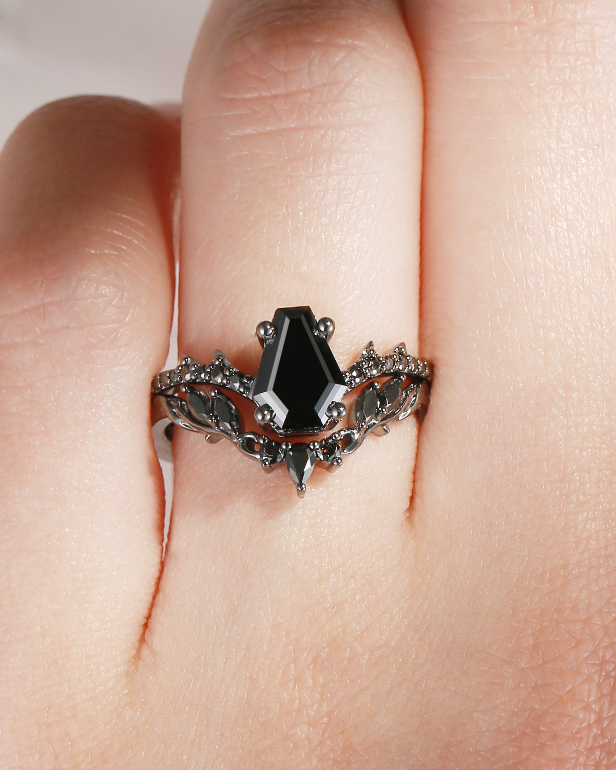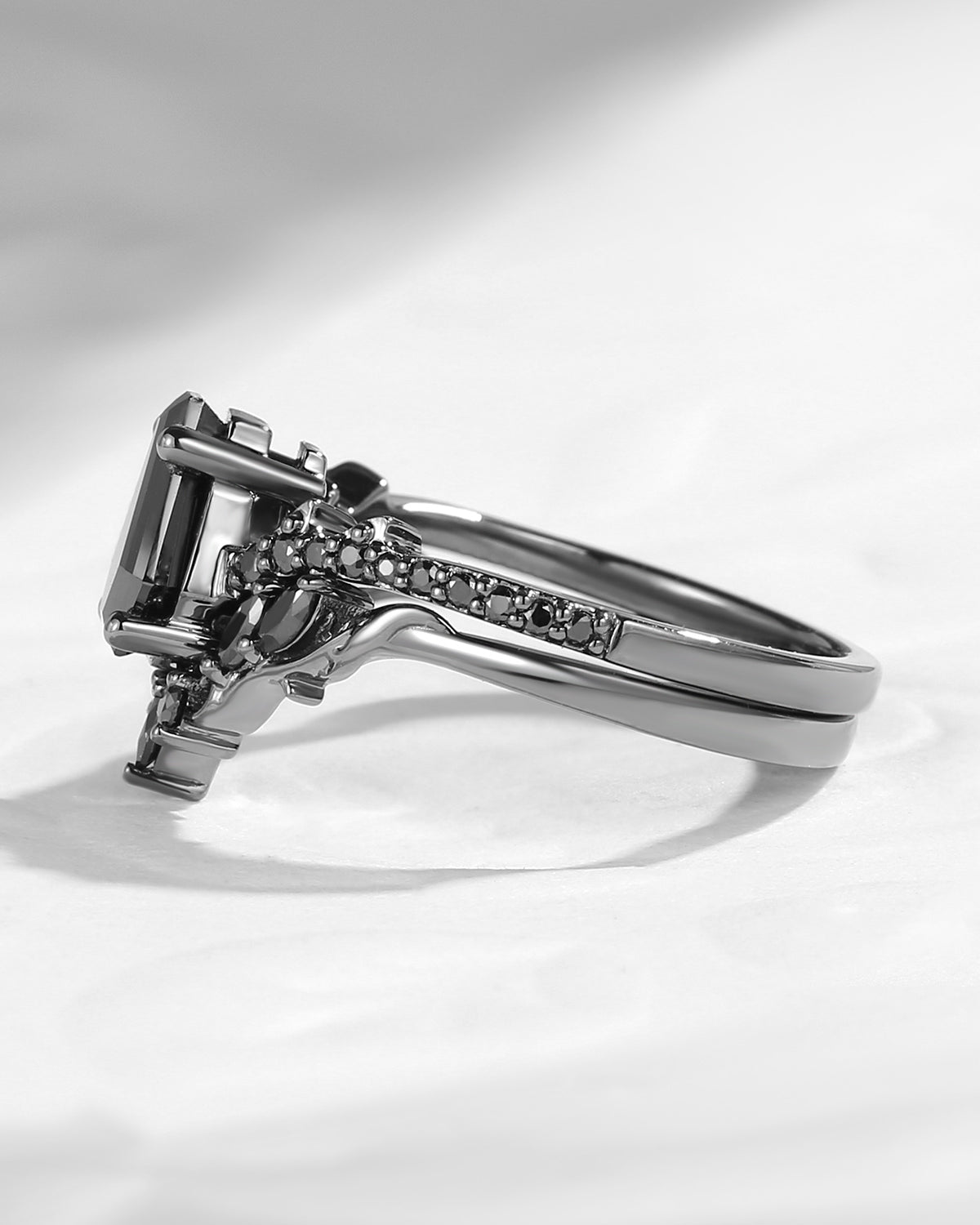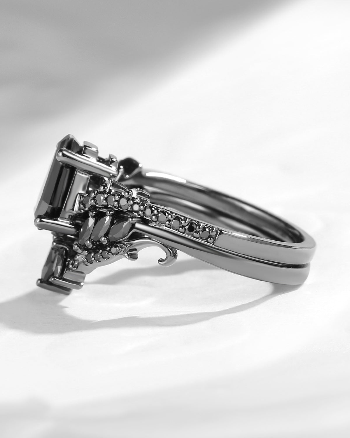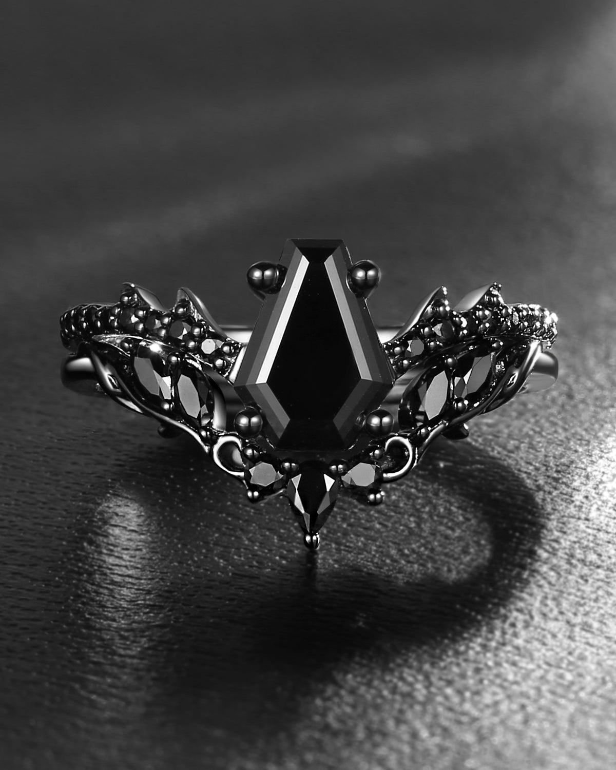 Gothic Style Coffin Black Moissanite Vine And Thorns Engagement Ring 2pcs