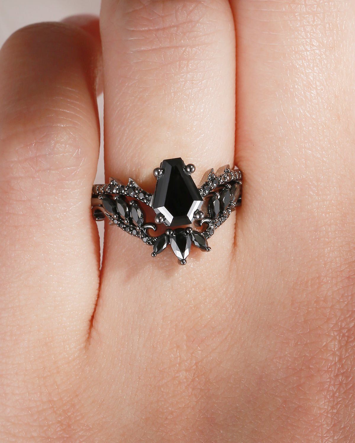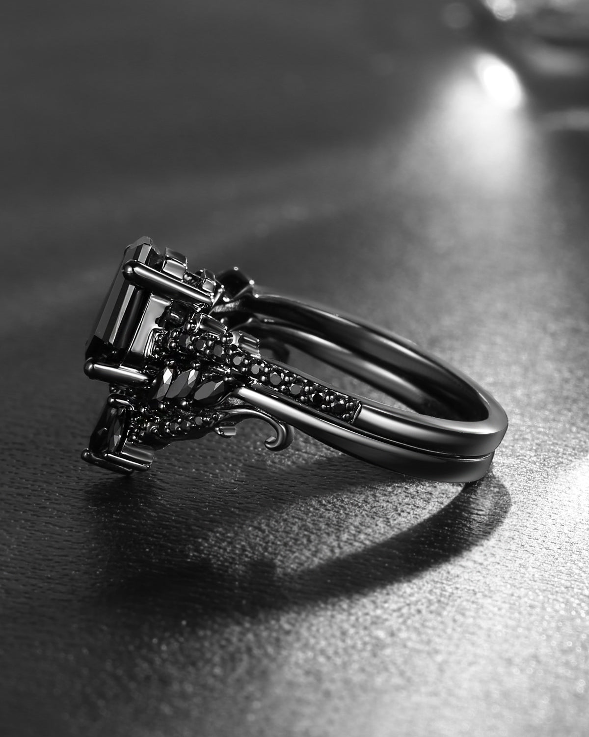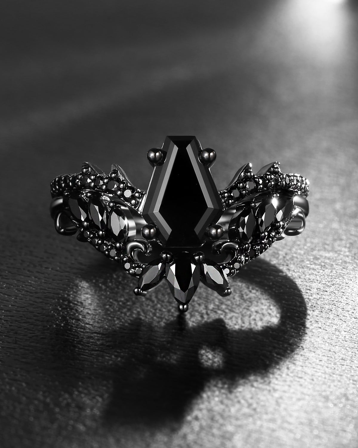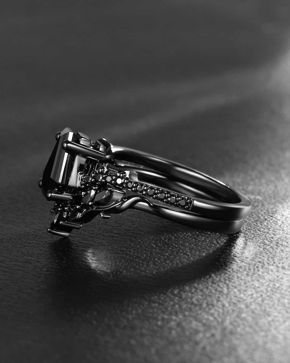 Gothic Style Coffin Black Moissanite Vine And Thorns Engagement Ring 2pcs