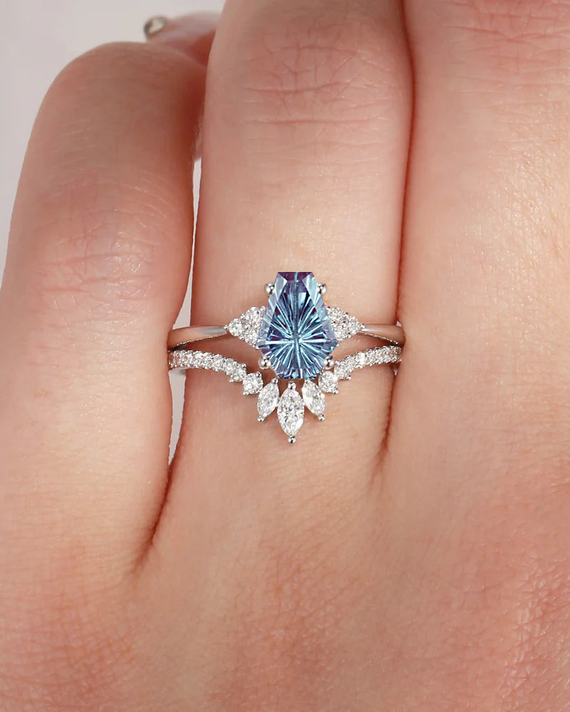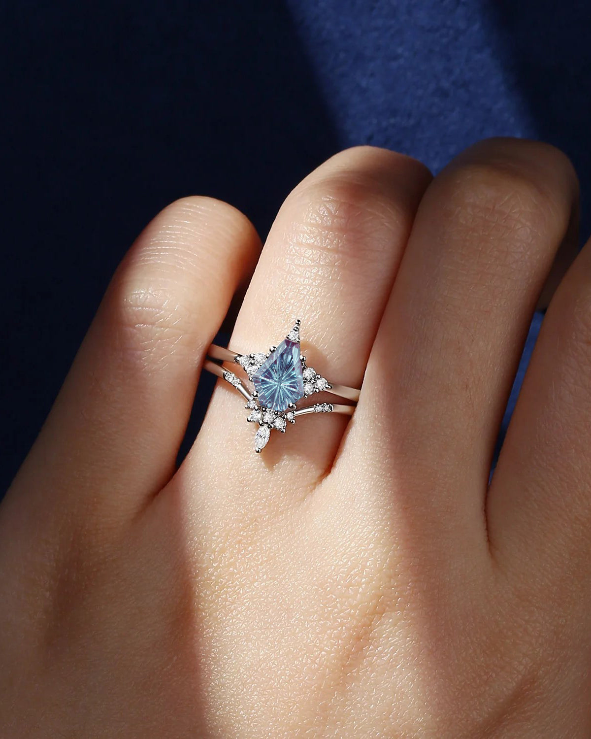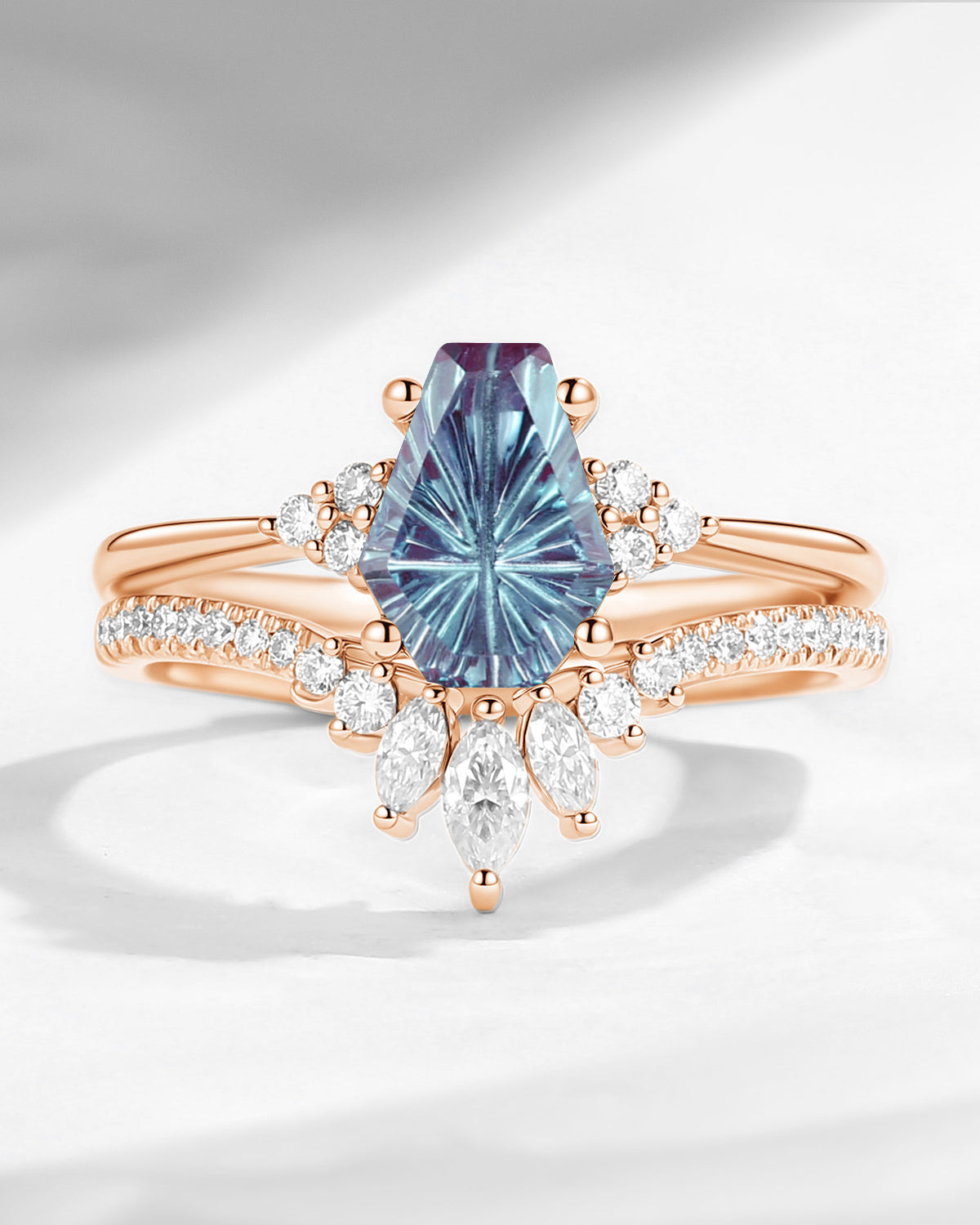 Firework Cut Coffin Lab Alexandrite Engagement Set 2pcs - White Dress