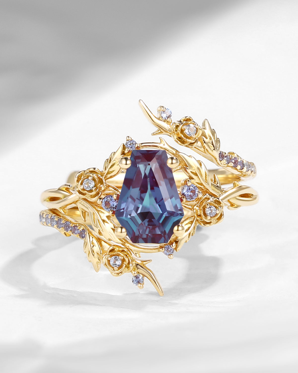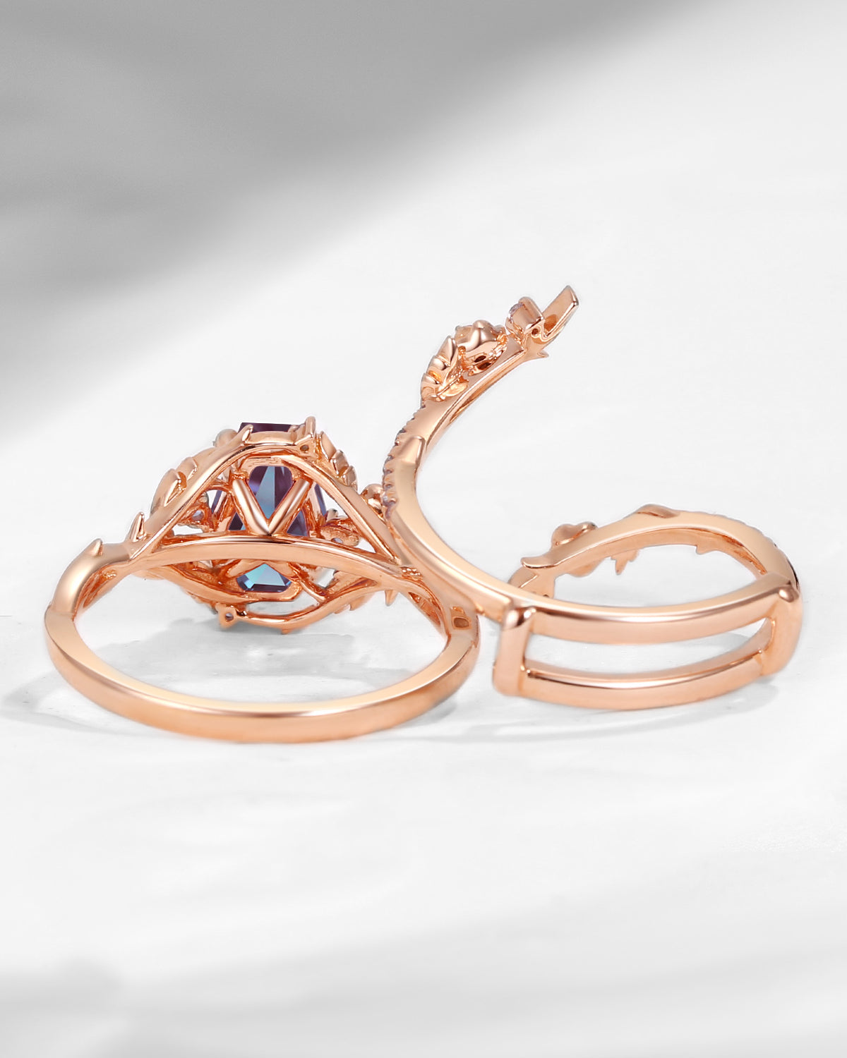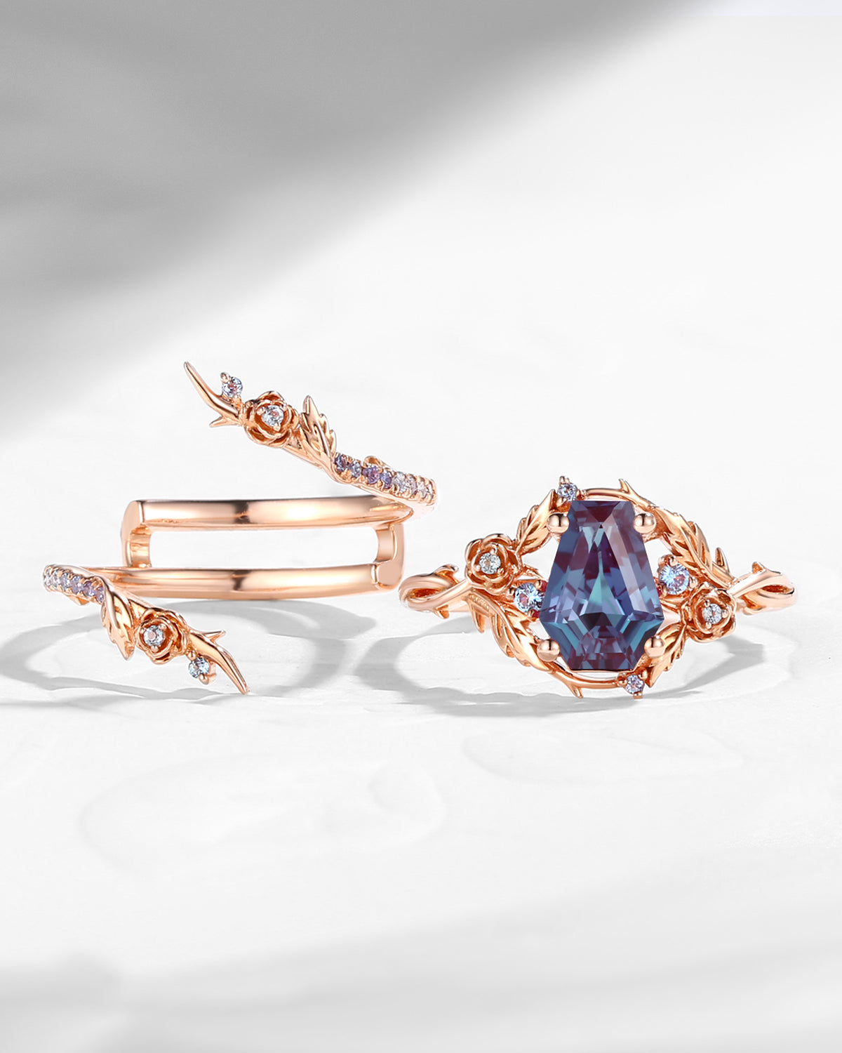 Nature Inspired Twist Coffin Cut Lab Alexandrite Engagement Ring Set 2pcs