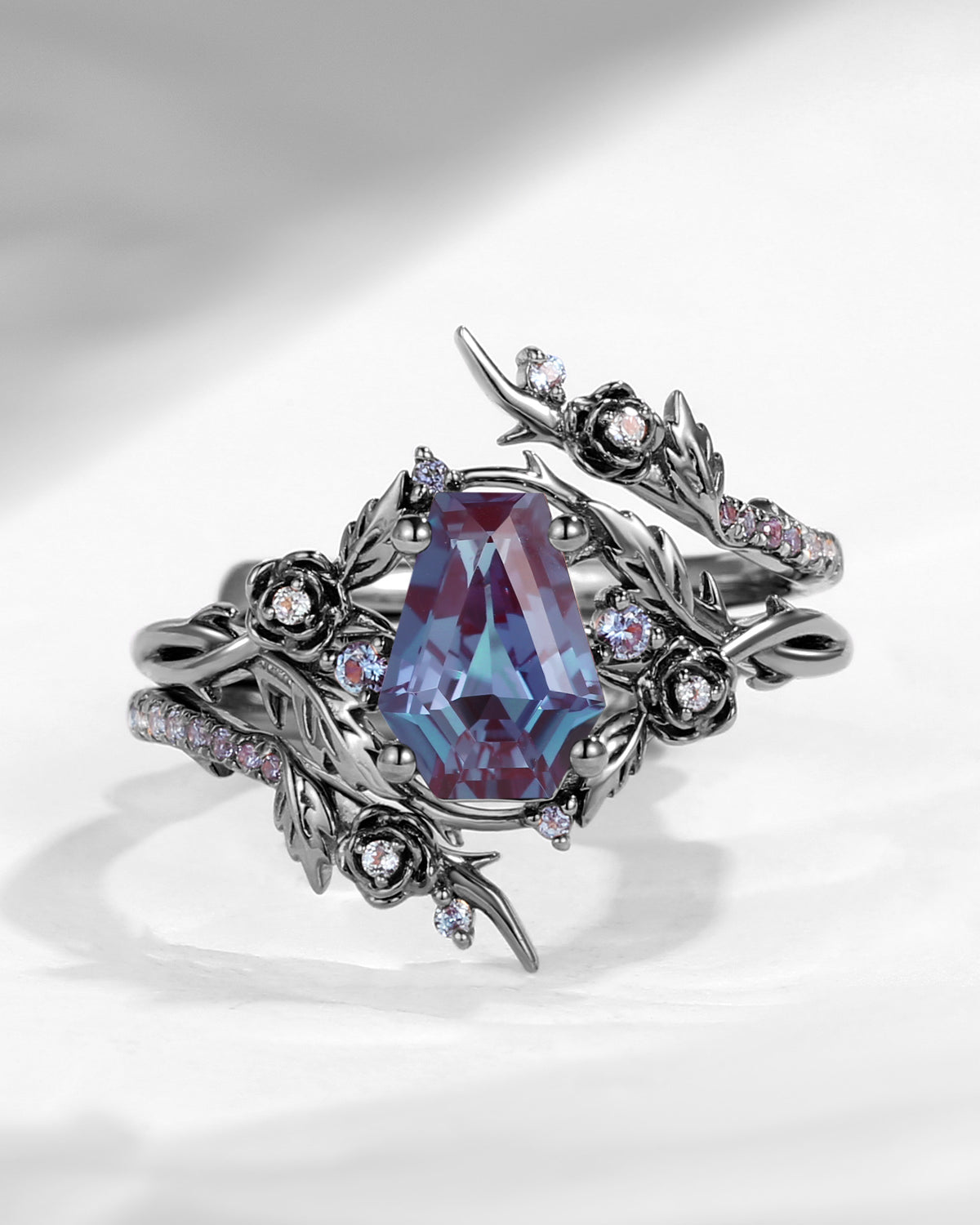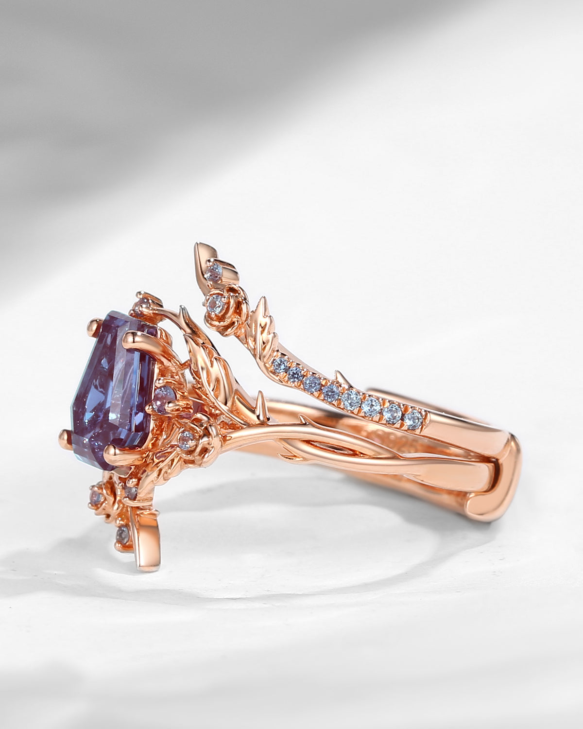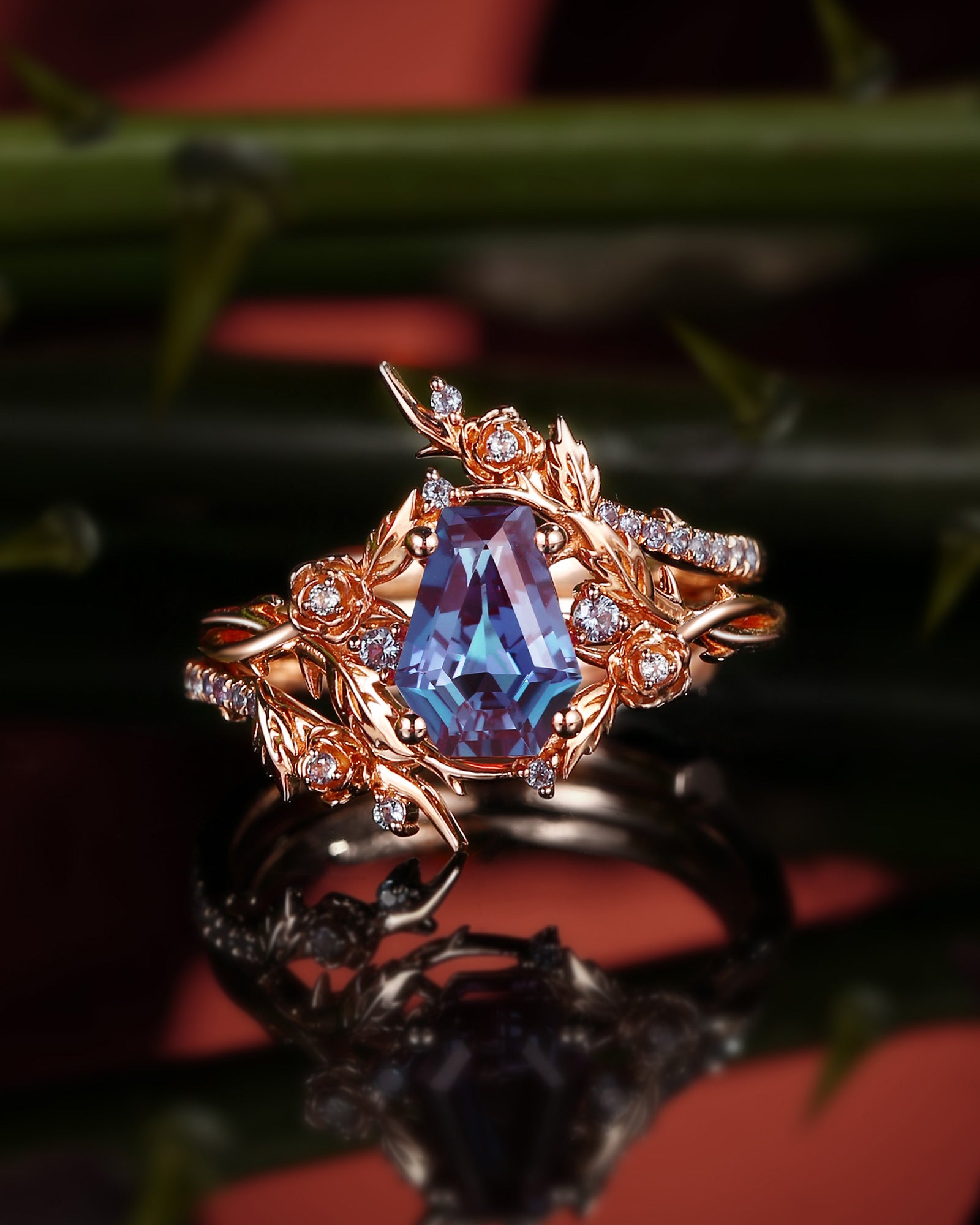 Nature Inspired Twist Coffin Cut Lab Alexandrite Engagement Ring Set 2pcs