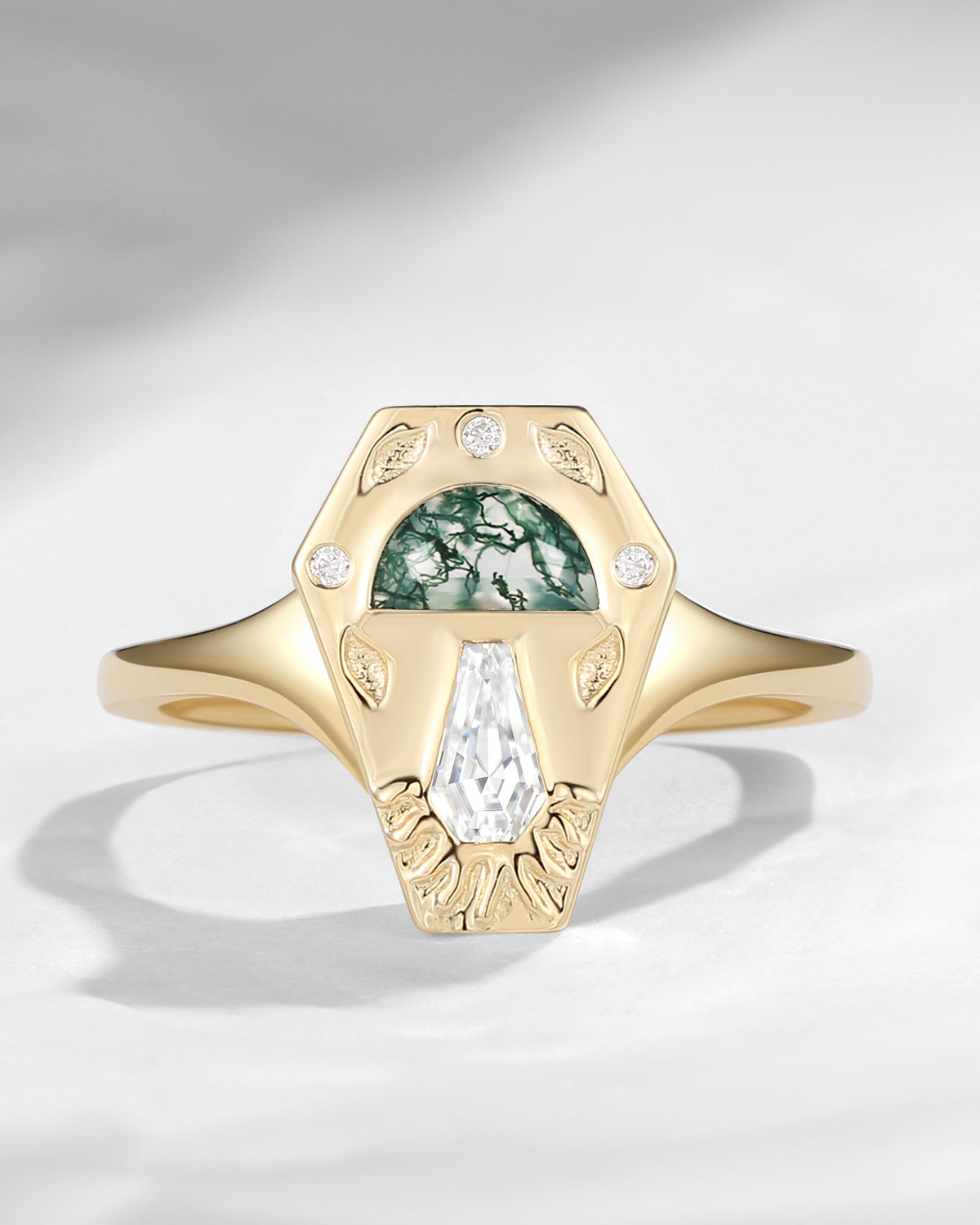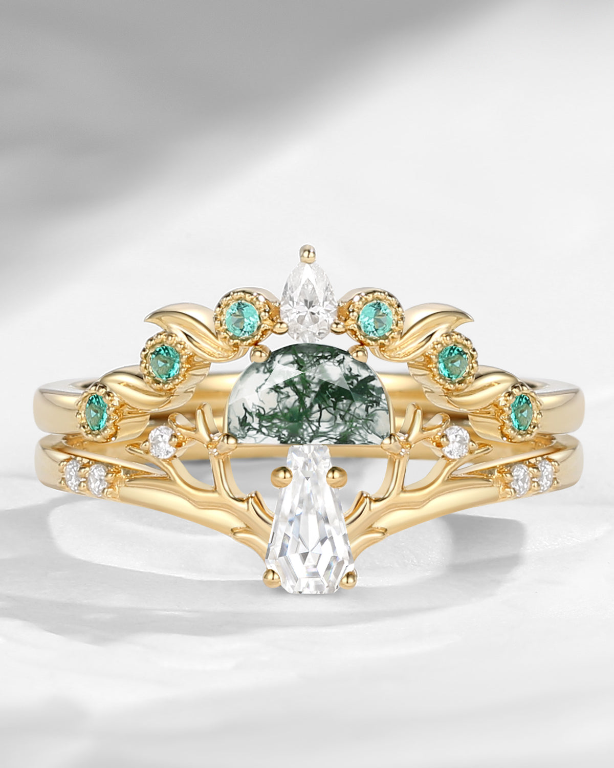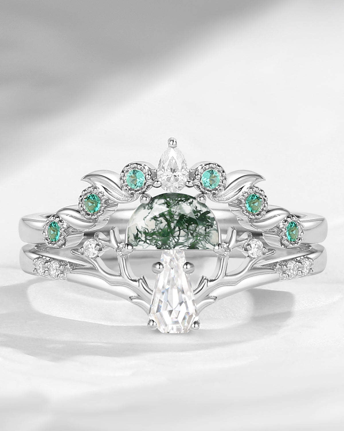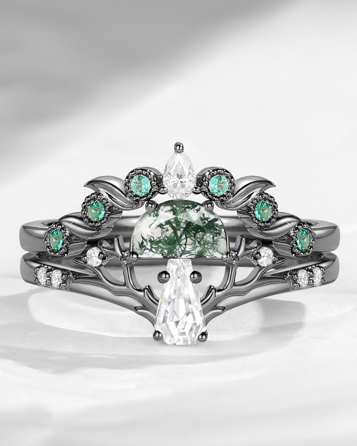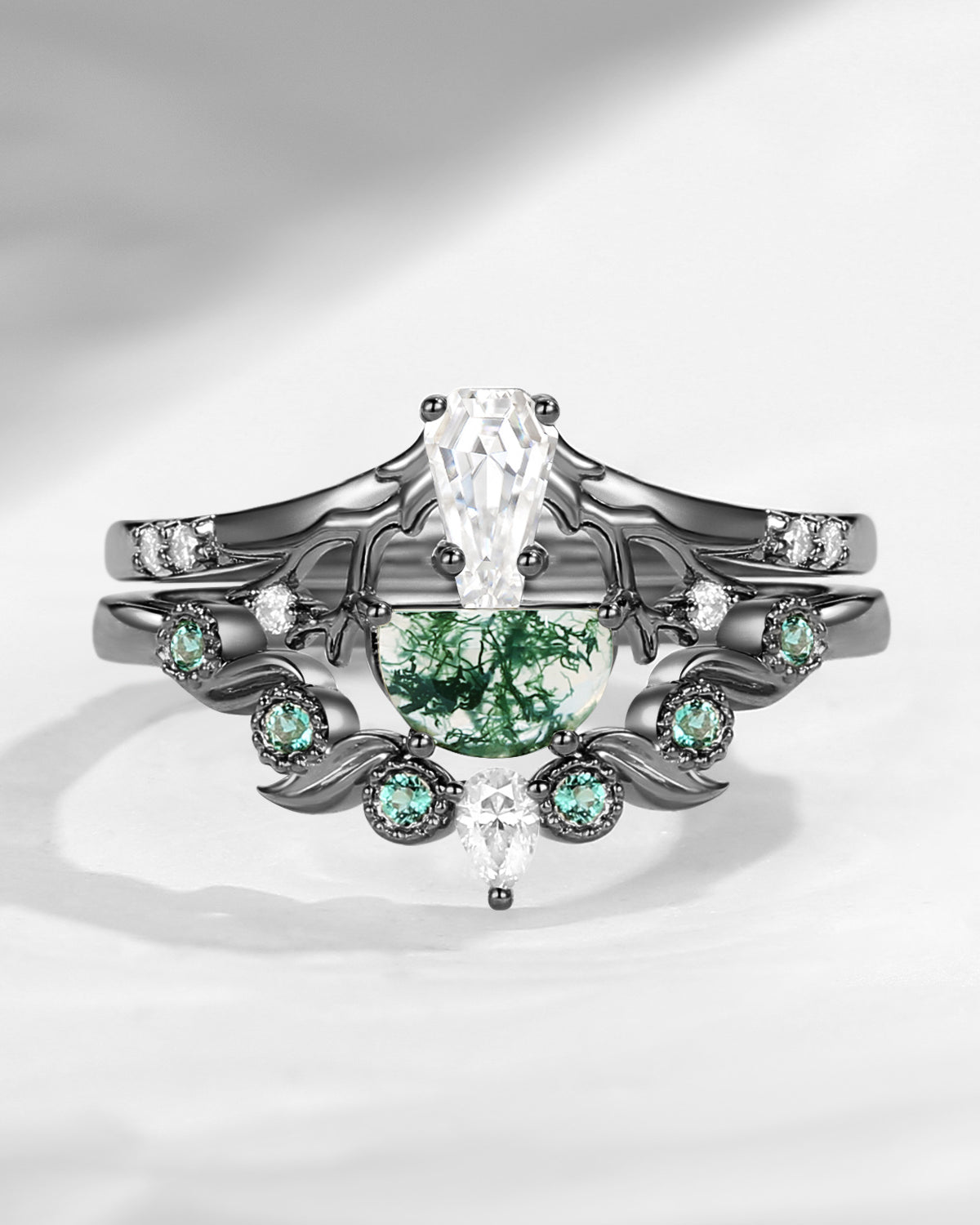 Crescent Moon | Coffin Cut Moss Agate 'Till Death Do Us Apart' Ring Set 2pcs