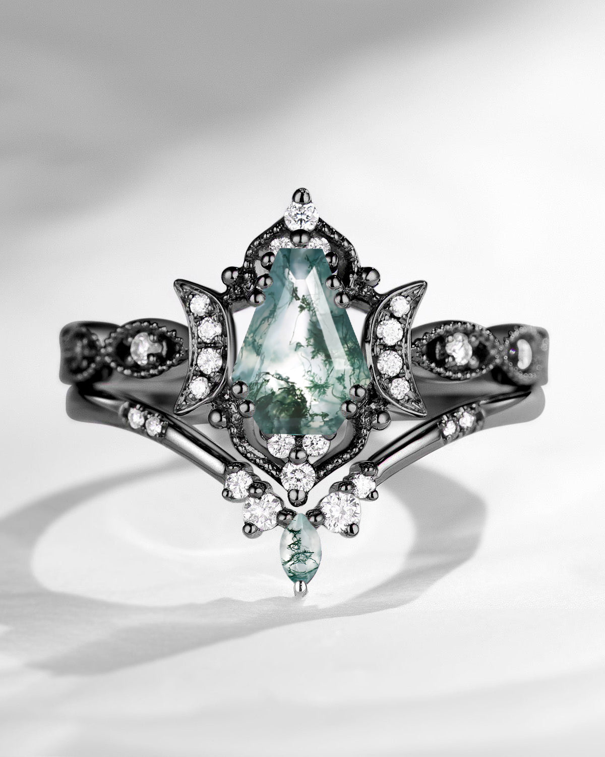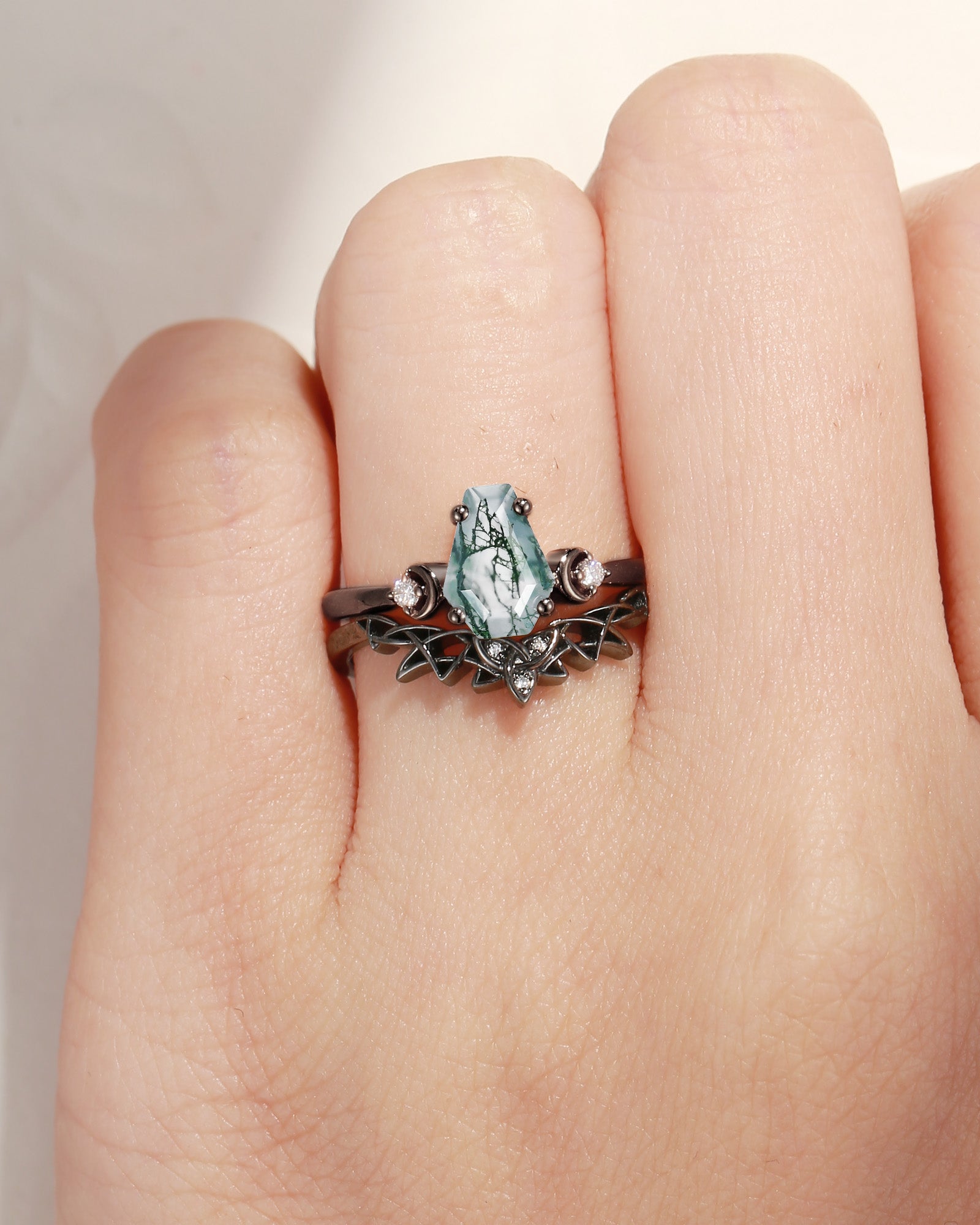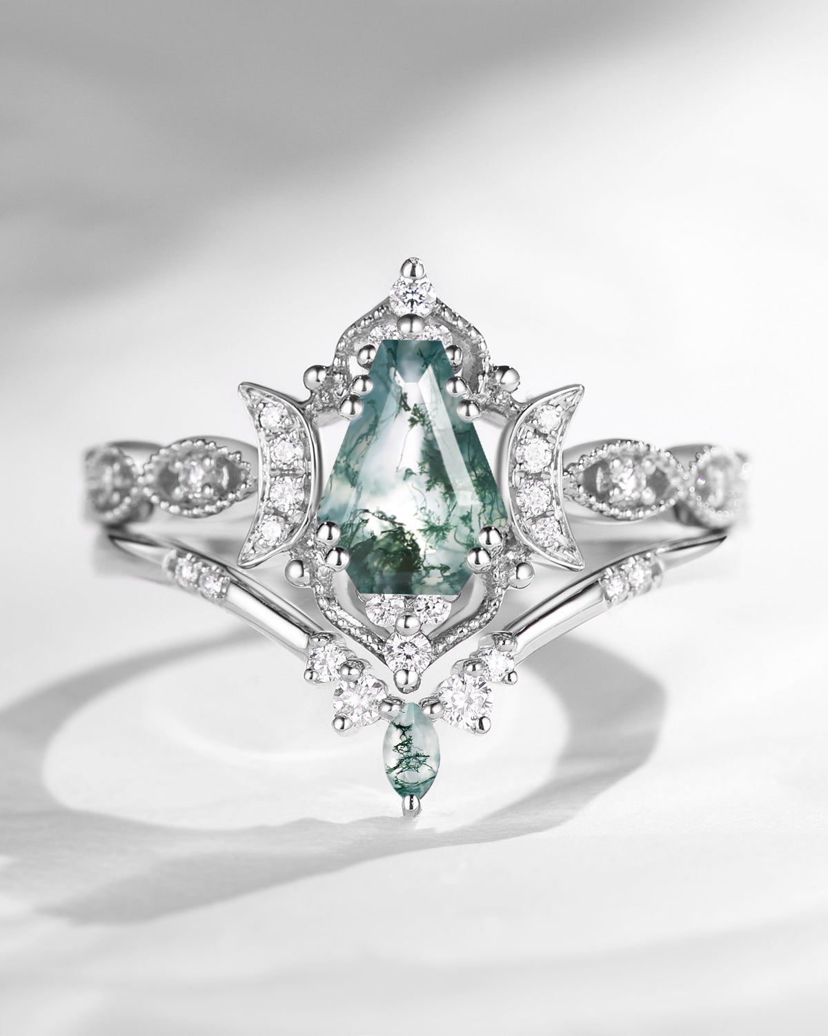 Crescent Moon | Unique Coffin Cut Moss Agate Engagement Ring Set 2pcs - Luna