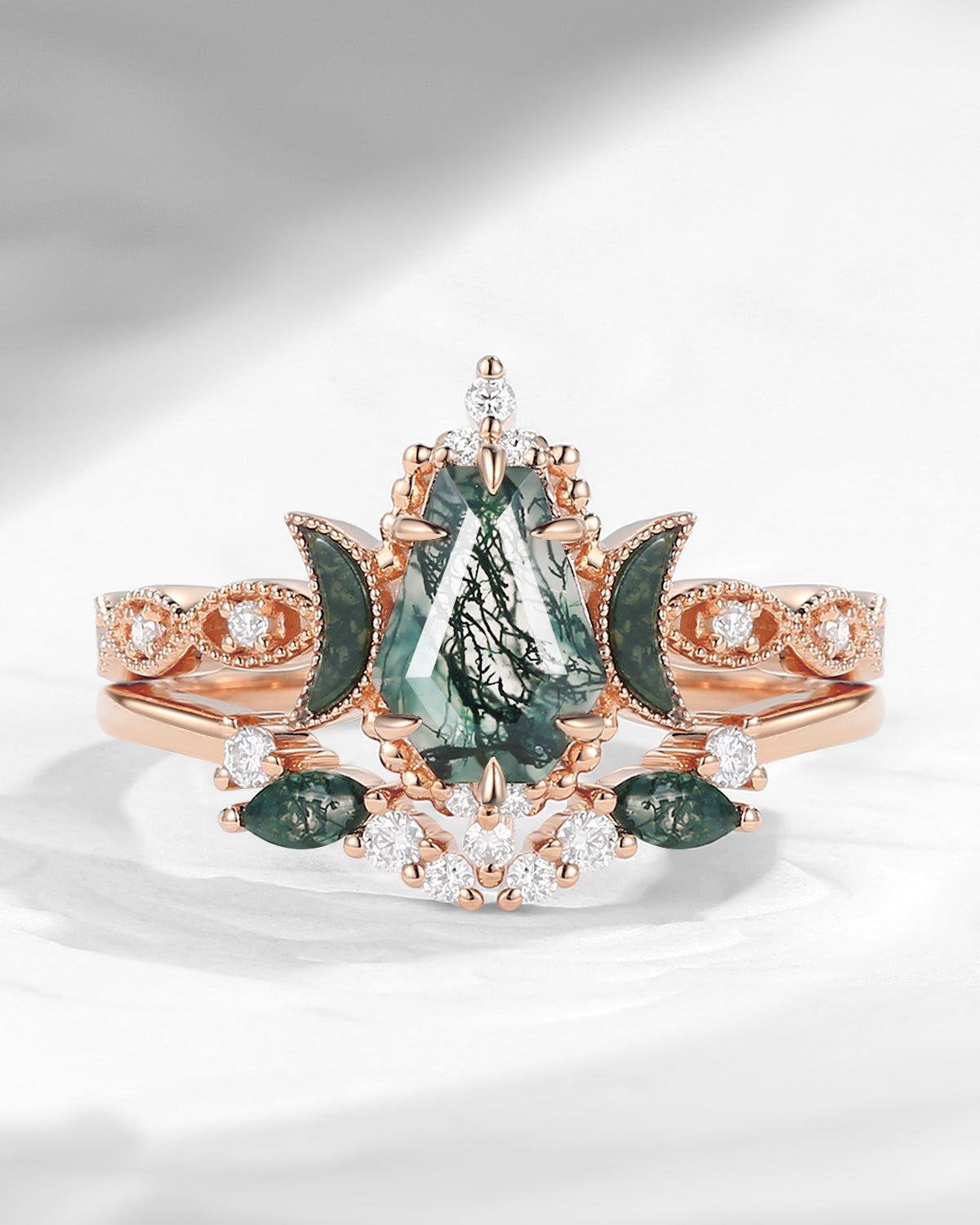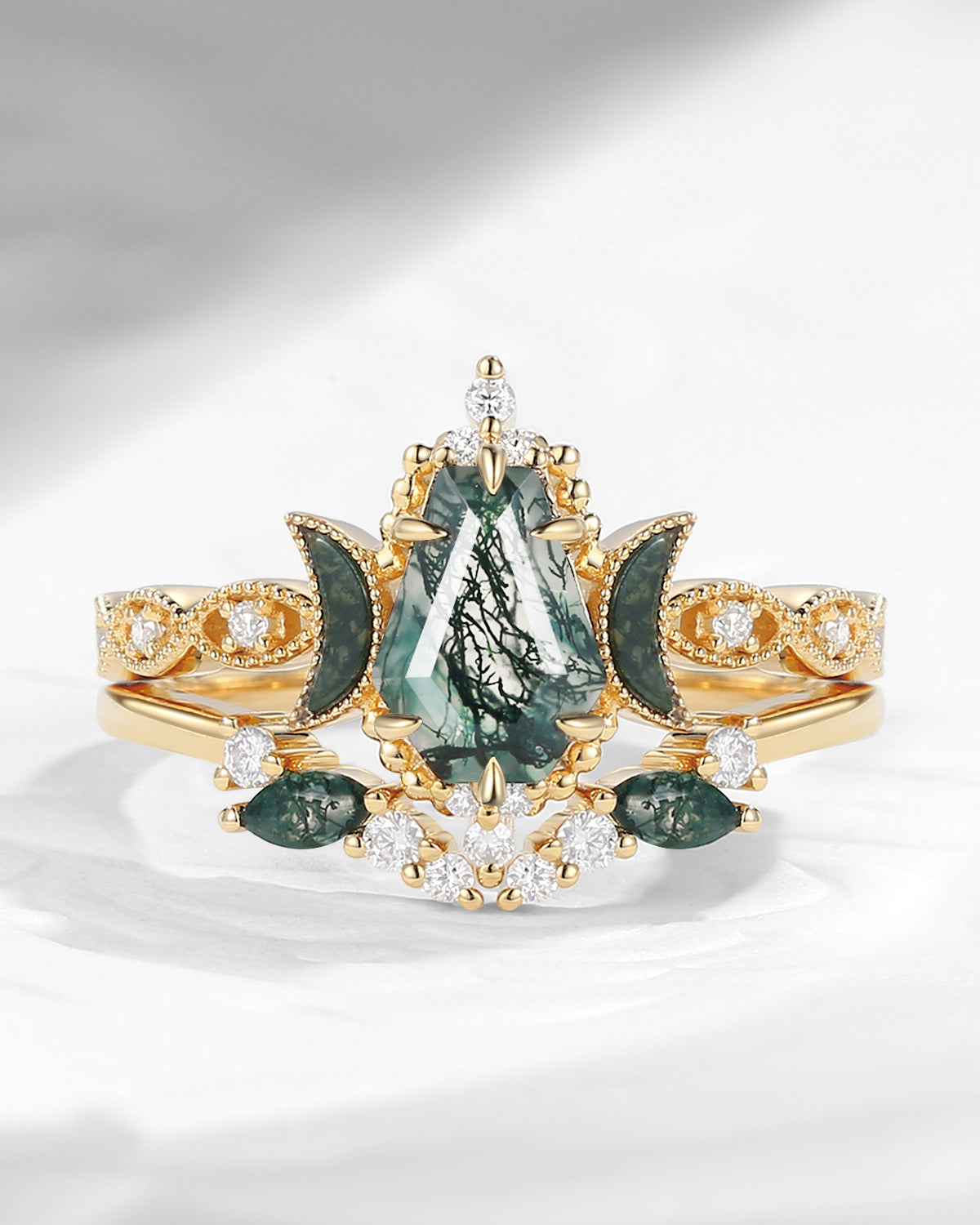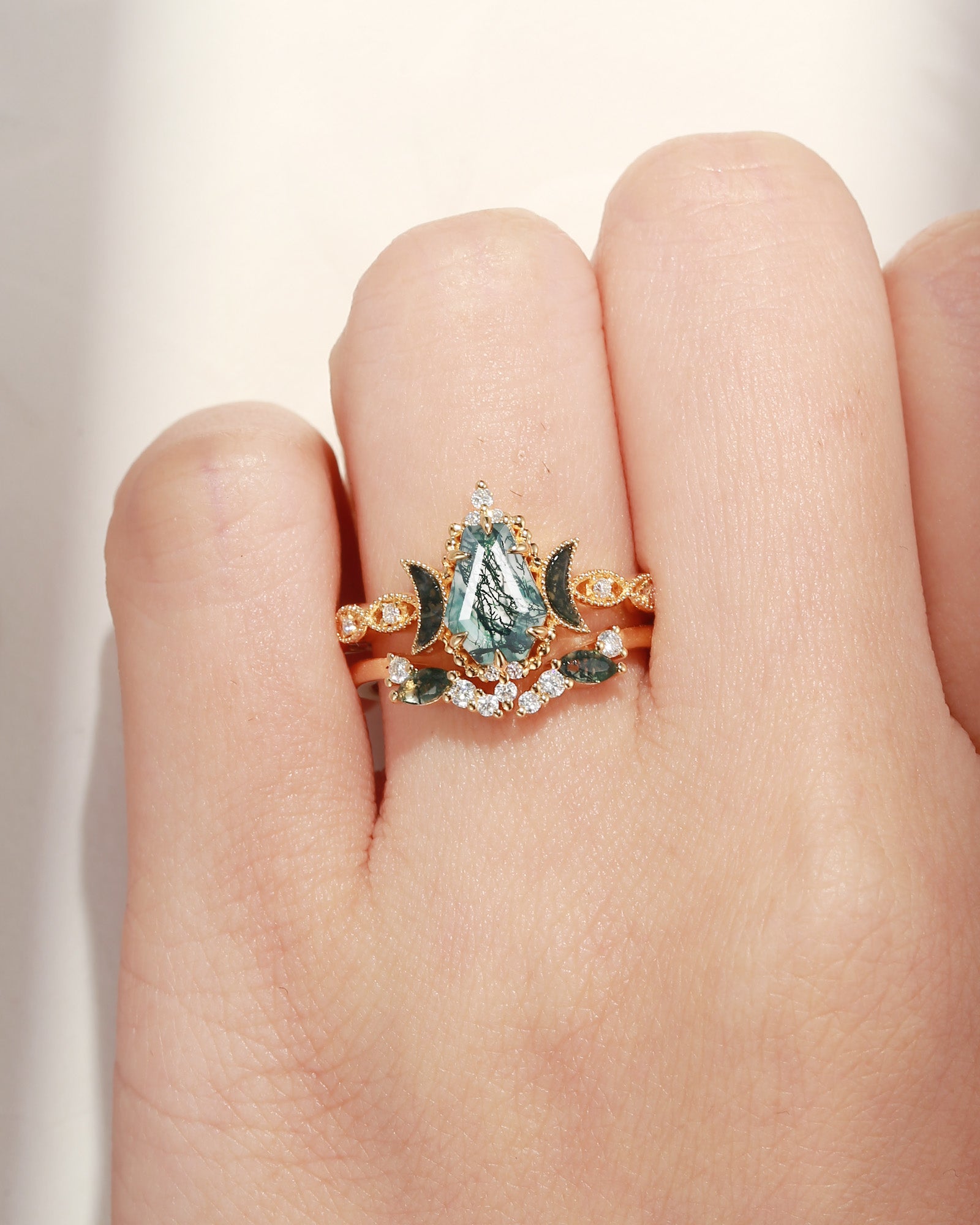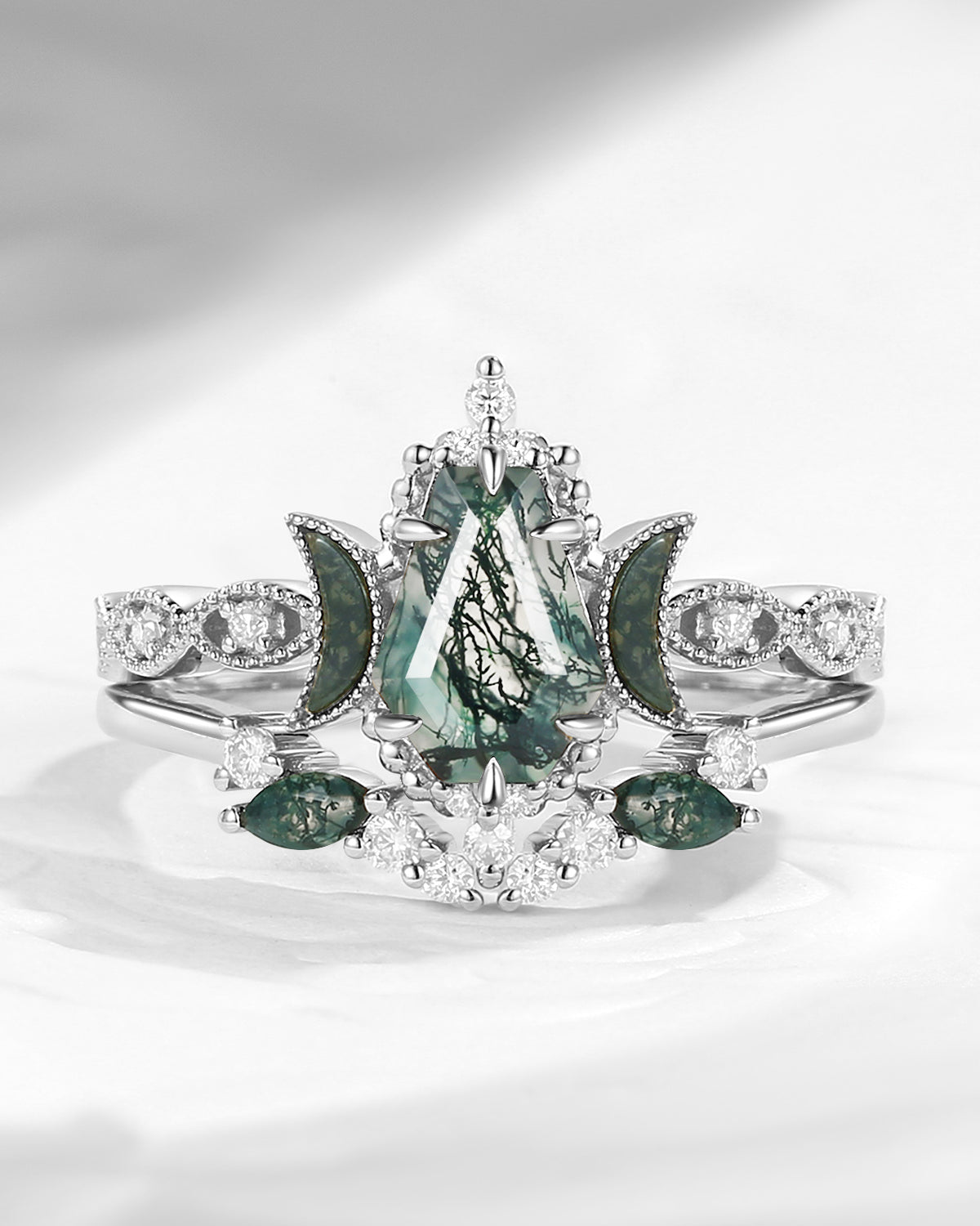 Crescent Moon | Unique Coffin Cut Moss Agate Engagement Ring Set 2pcs - Luna