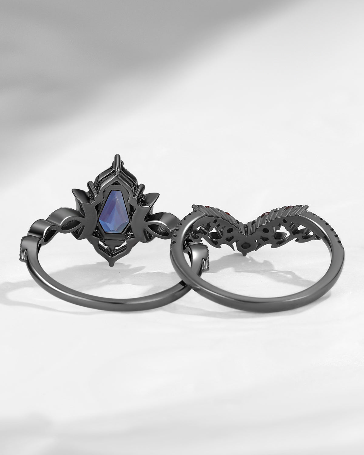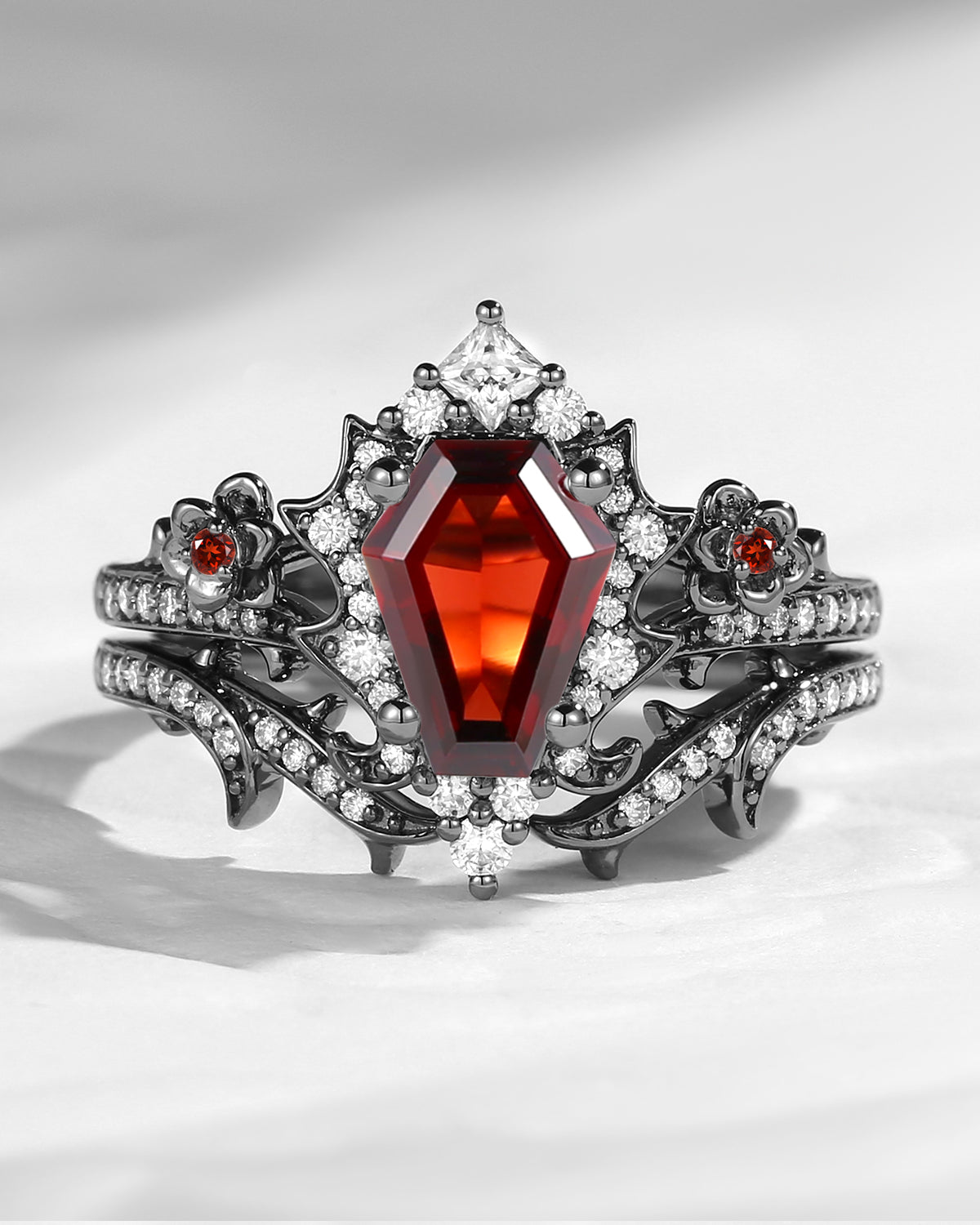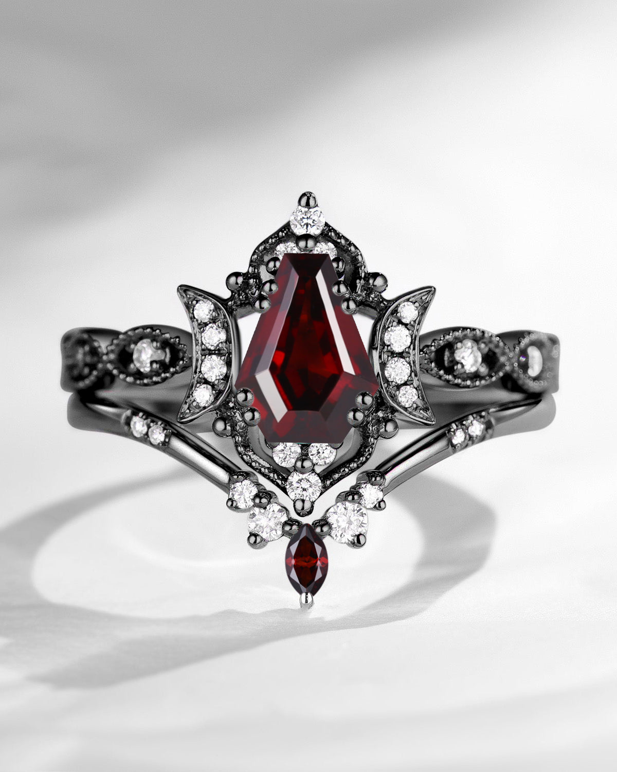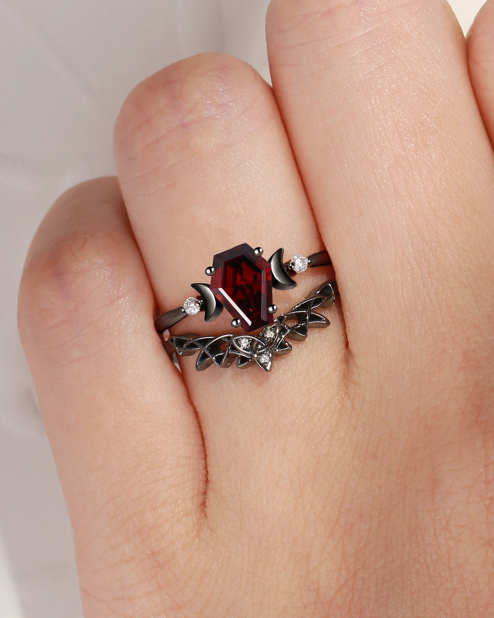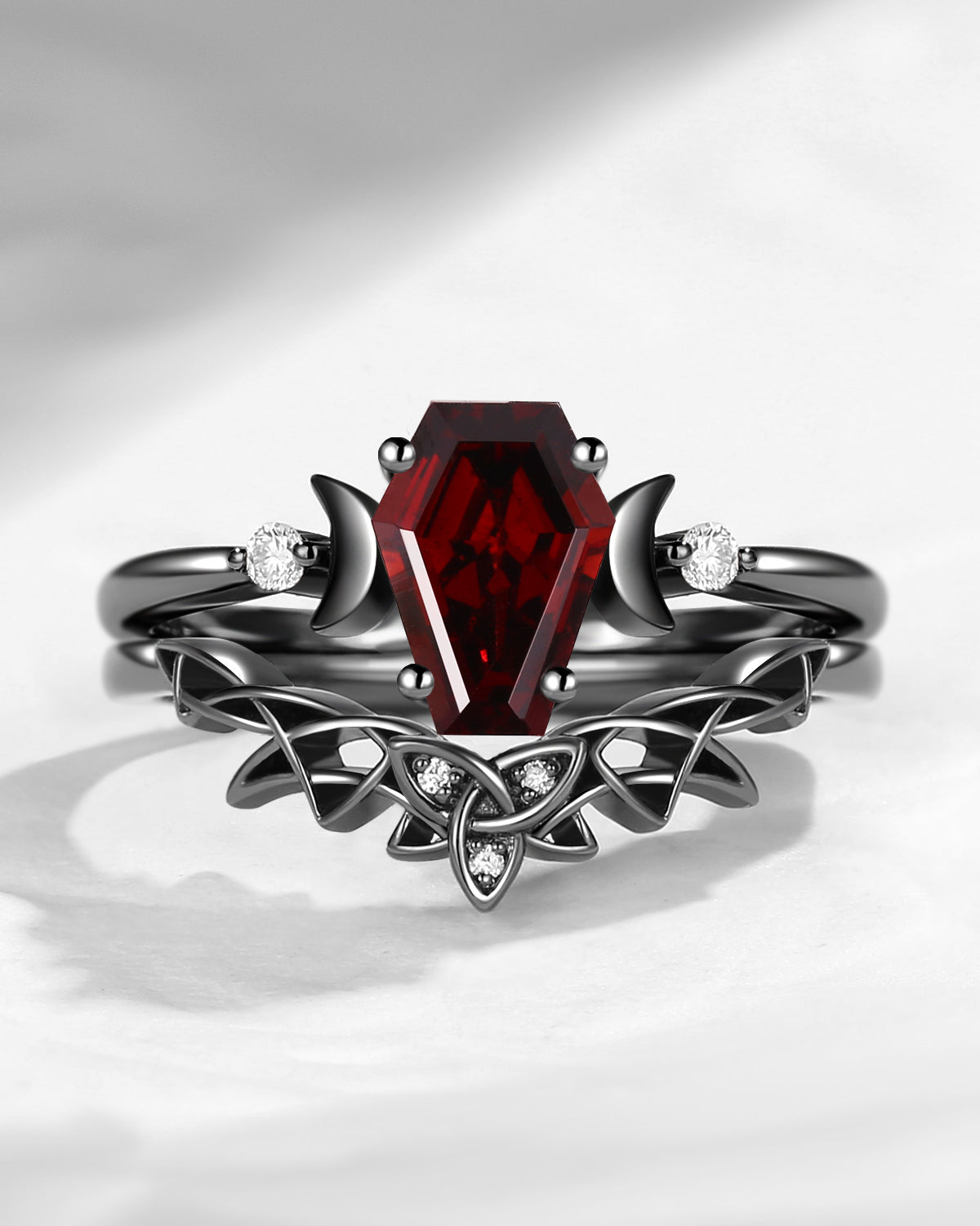 Celtic Moon | Coffin Cut Garnet Celtic Gothic Engagement Ring Set 2pcs
