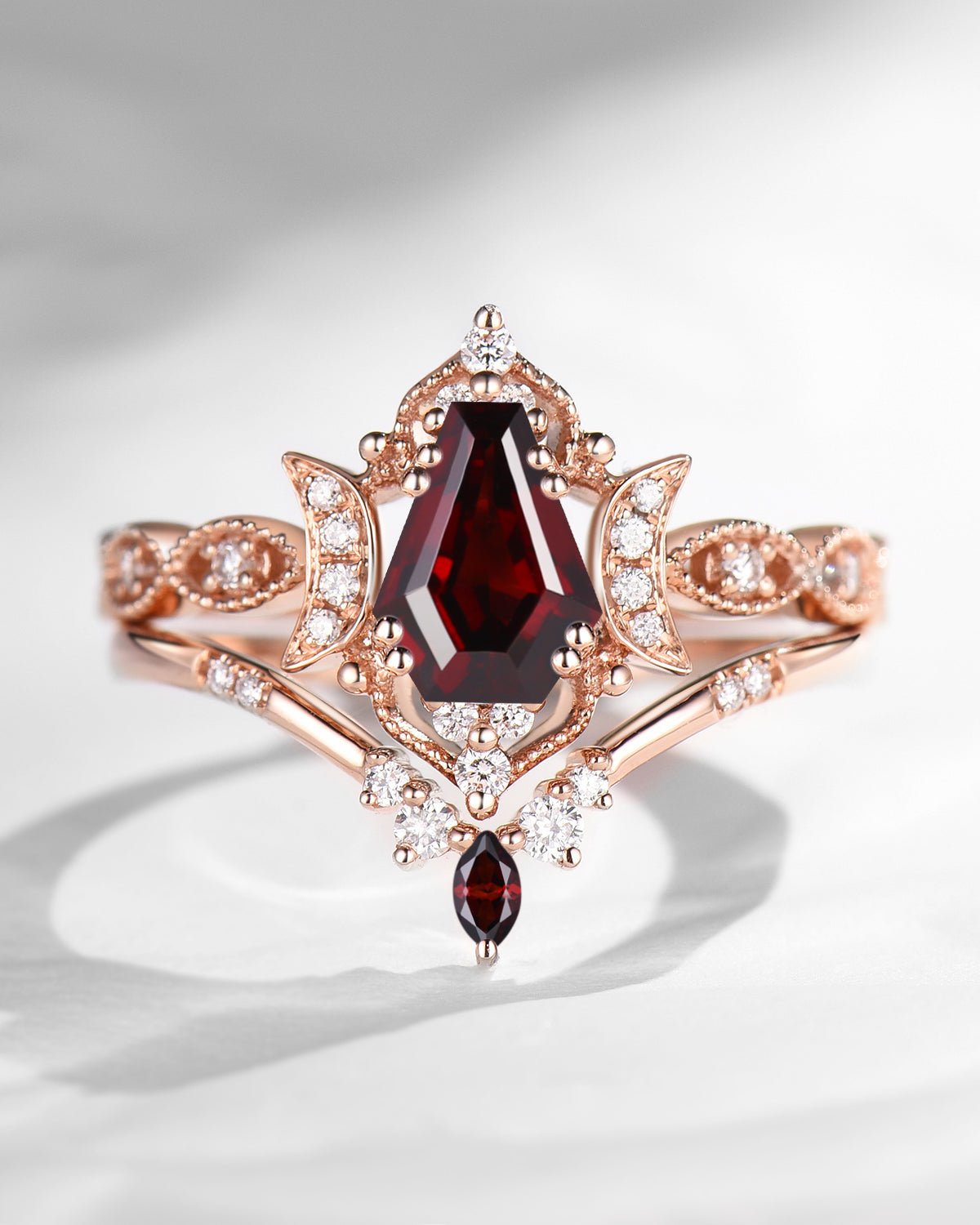 Crescent Moon | Unique Coffin Cut Garnet Engagement Ring Set 2pcs - Luna