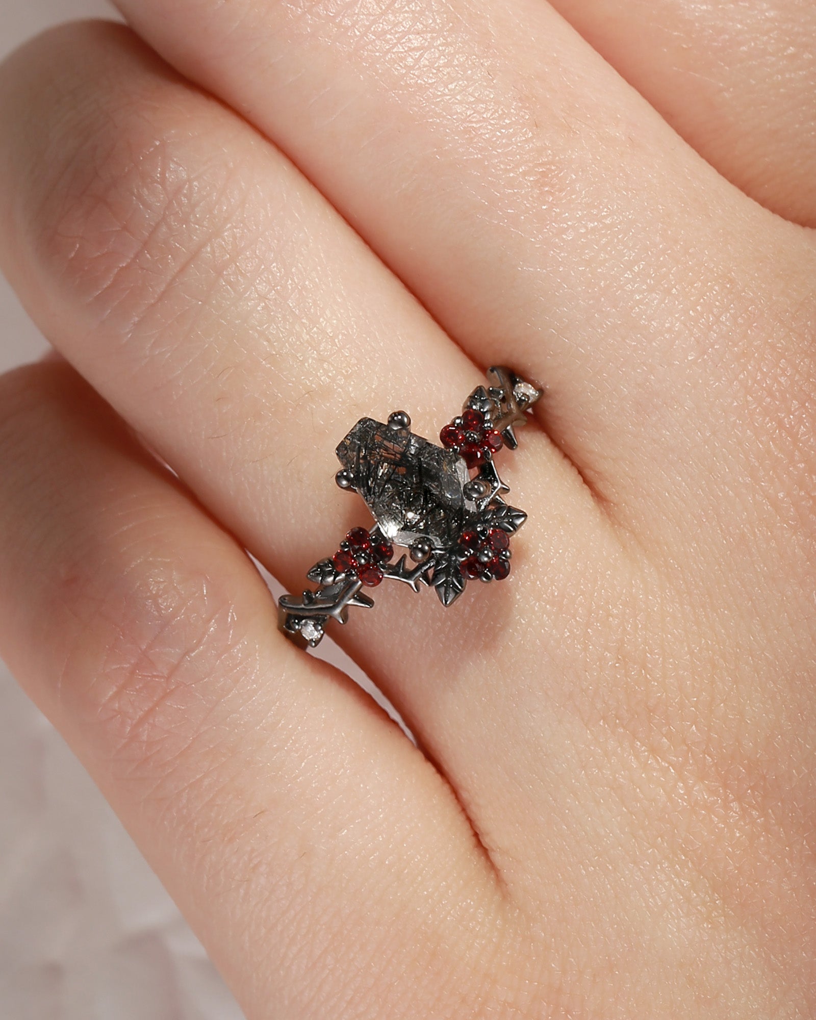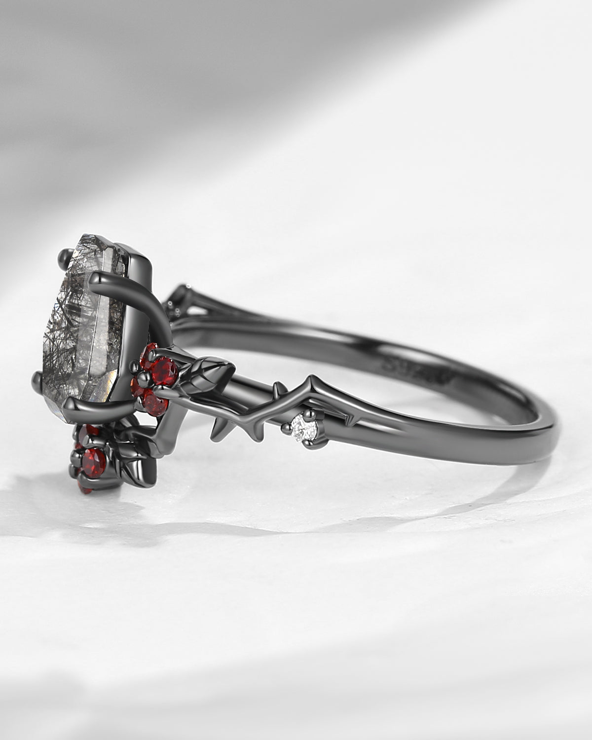Gothic Style Coffin Black Rutilated Quartz Vine Thorns & Roses Engagement Ring