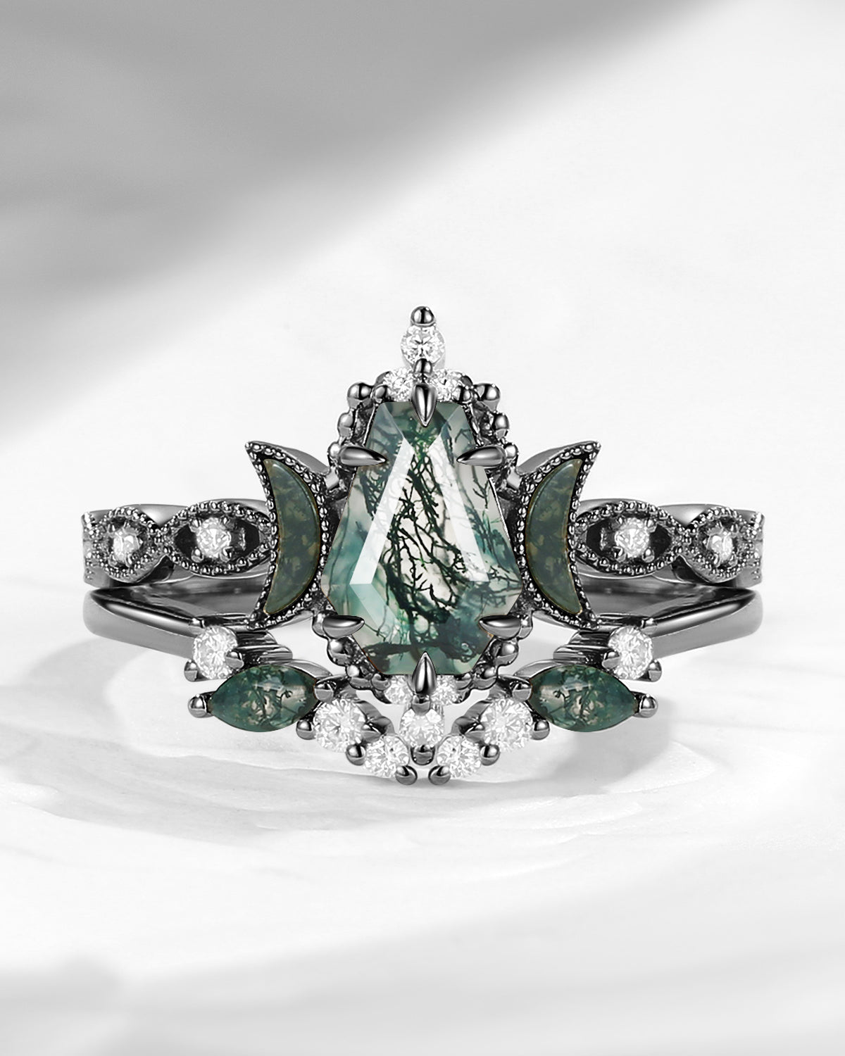 Crescent Moon | Coffin Cut Moss Agate 'Ultra Galaxy' Engagement Ring Set 2pcs