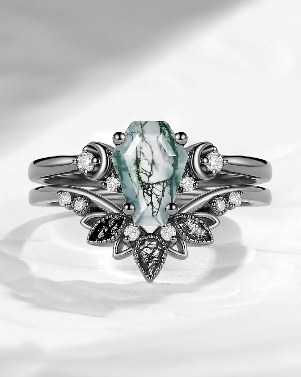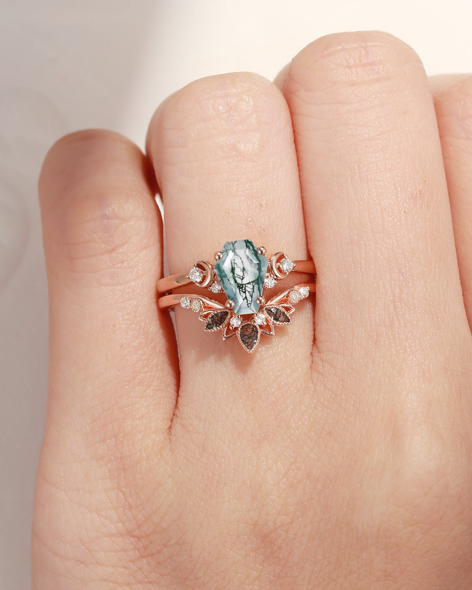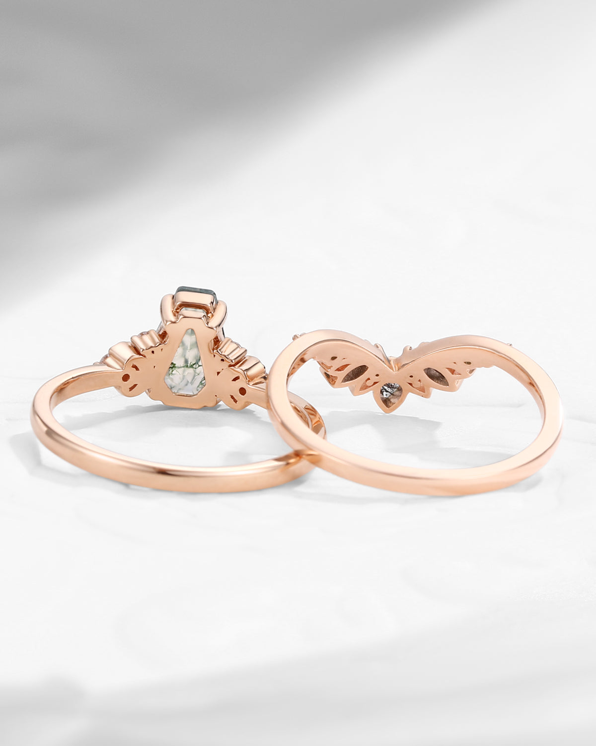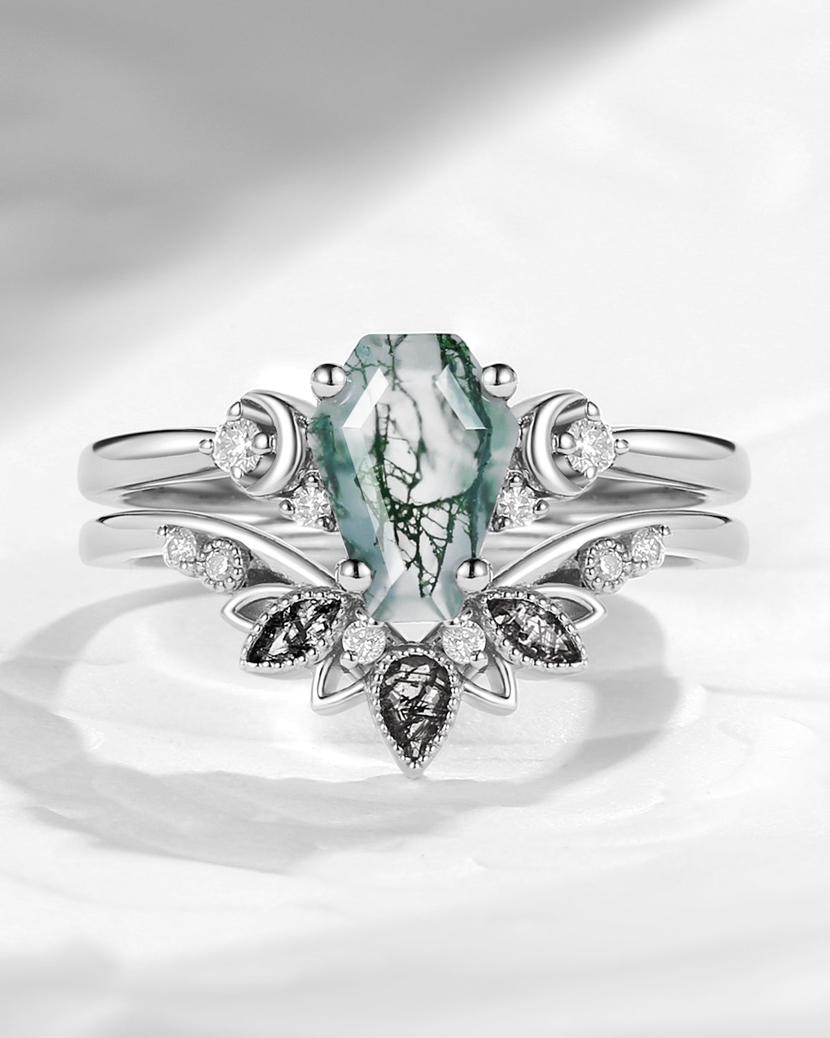 Pure Moon | Fancy Coffin Cut Moss Agate Engagement Ring Set 2pcs