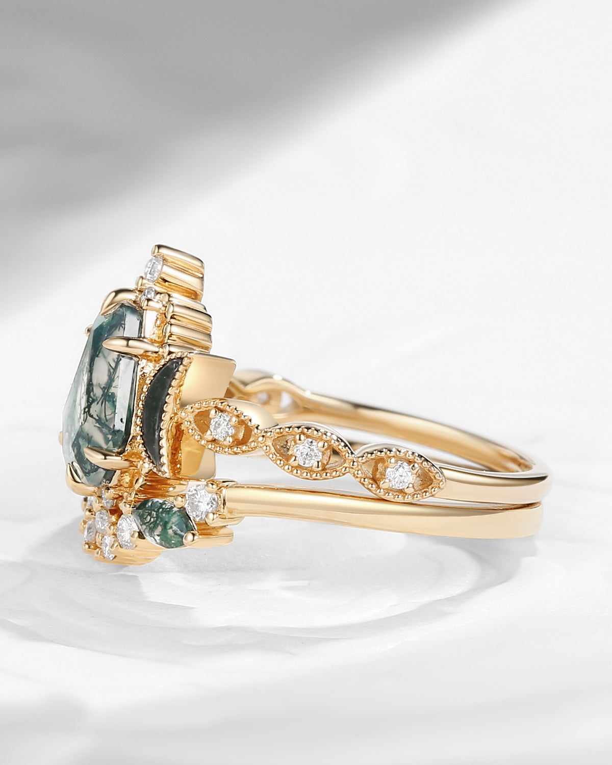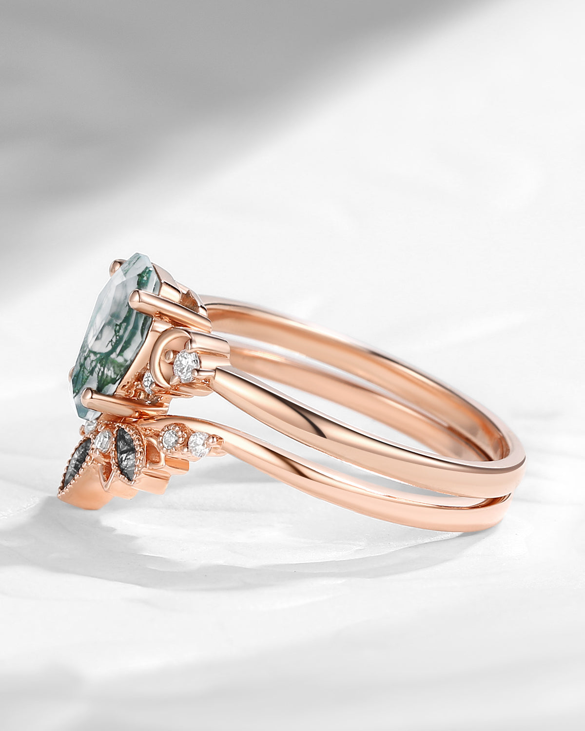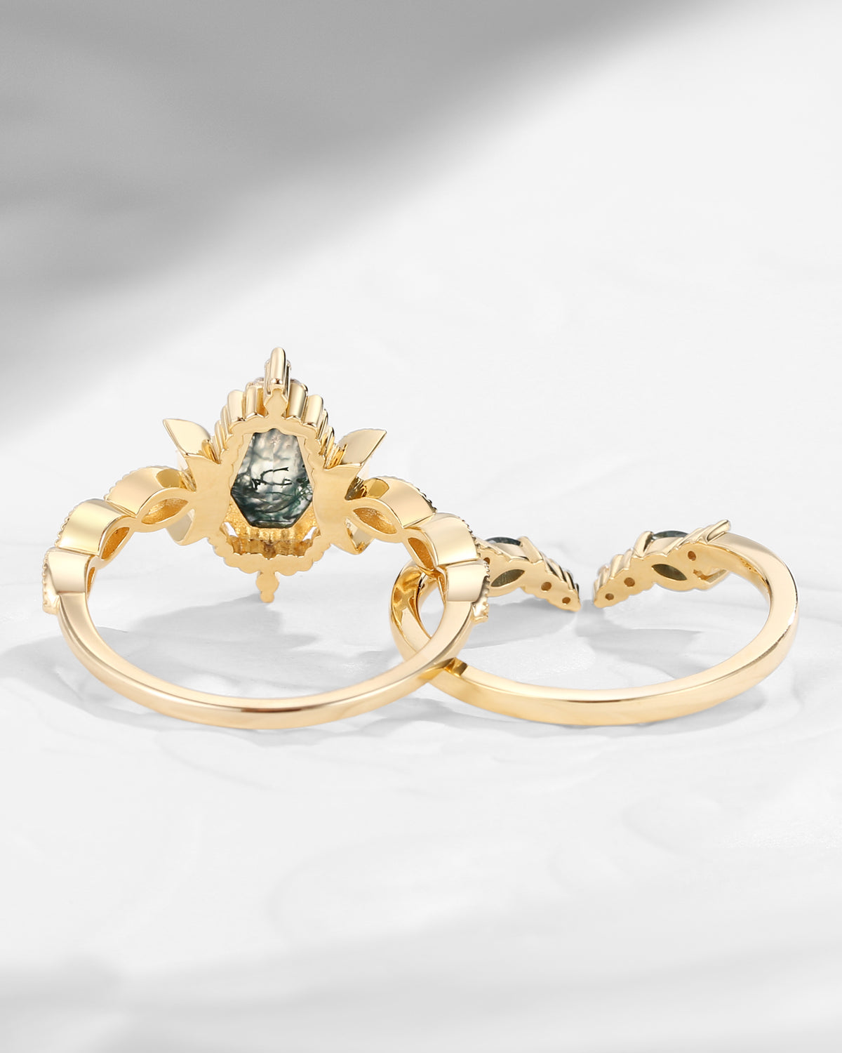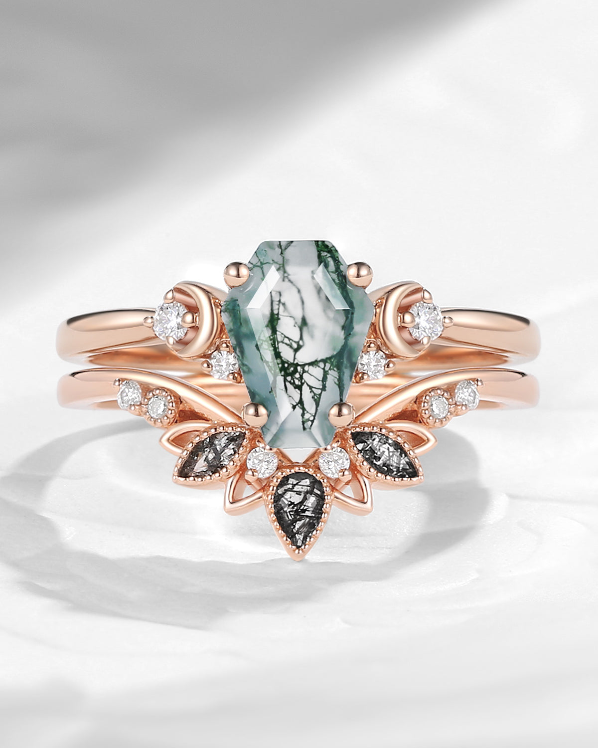 Pure Moon | Fancy Coffin Cut Moss Agate Engagement Ring Set 2pcs