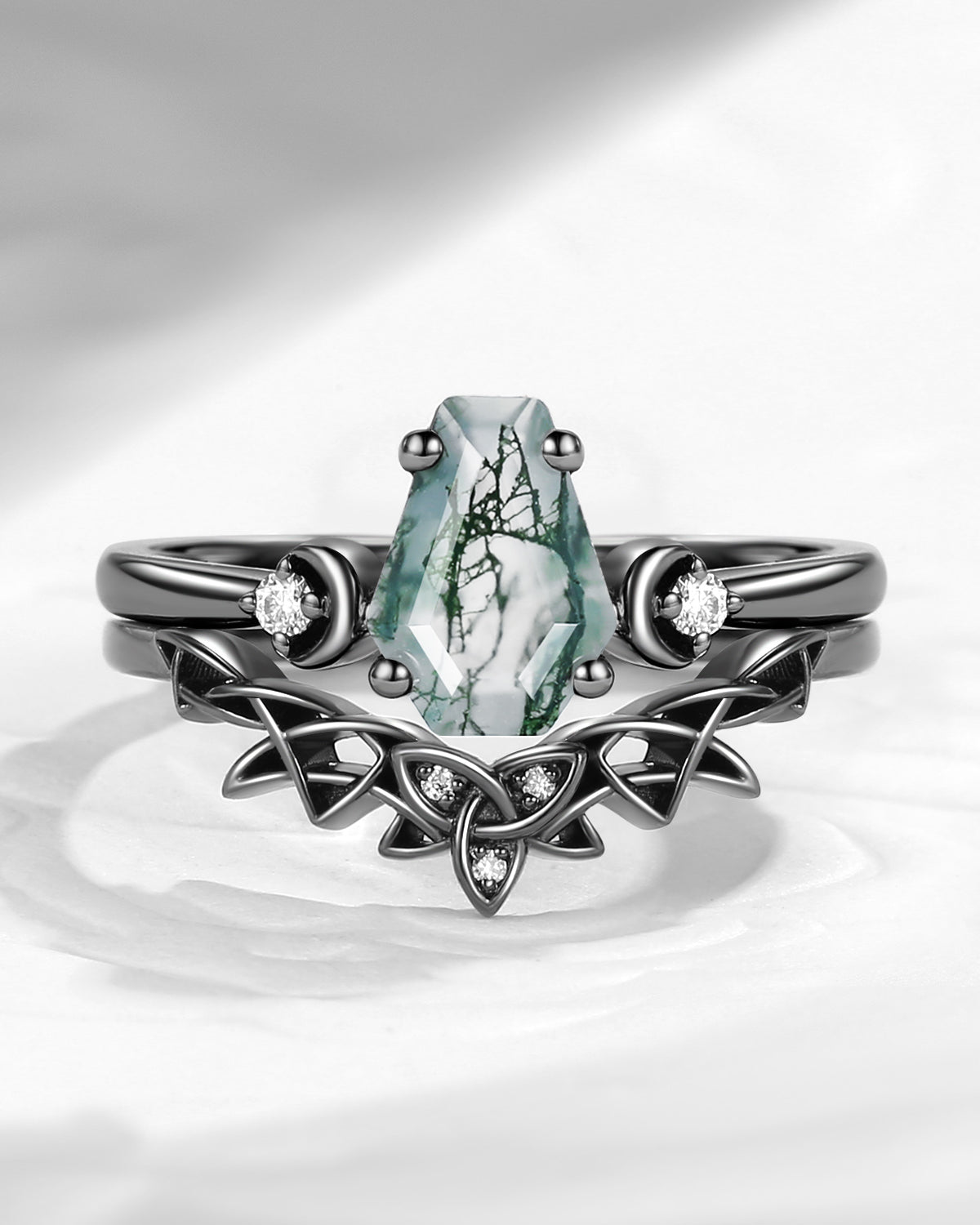 Celtic Moon | Fancy Coffin Cut Moss Agate Celtic Engagement Ring Set 2pcs