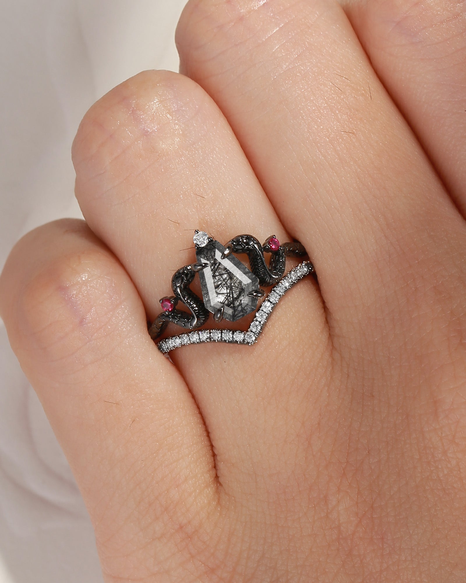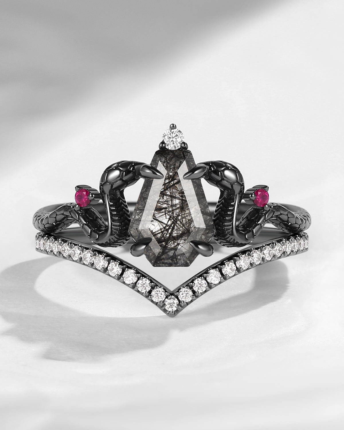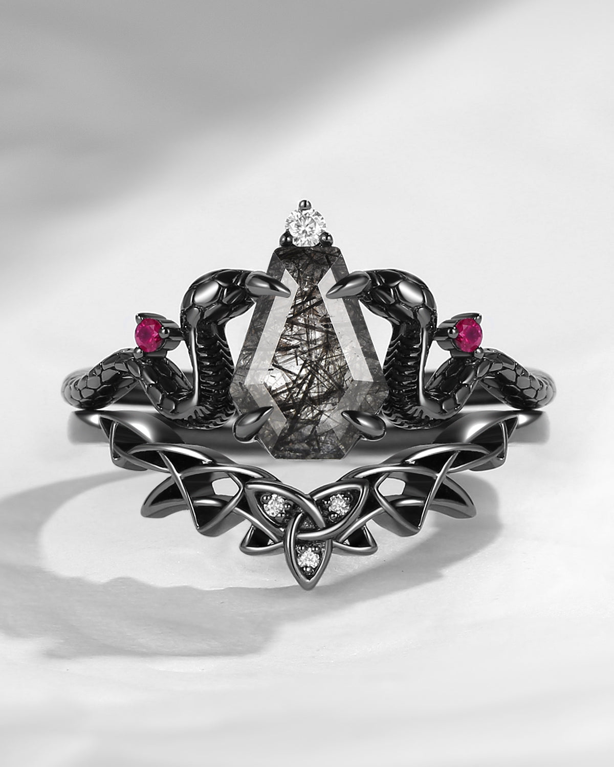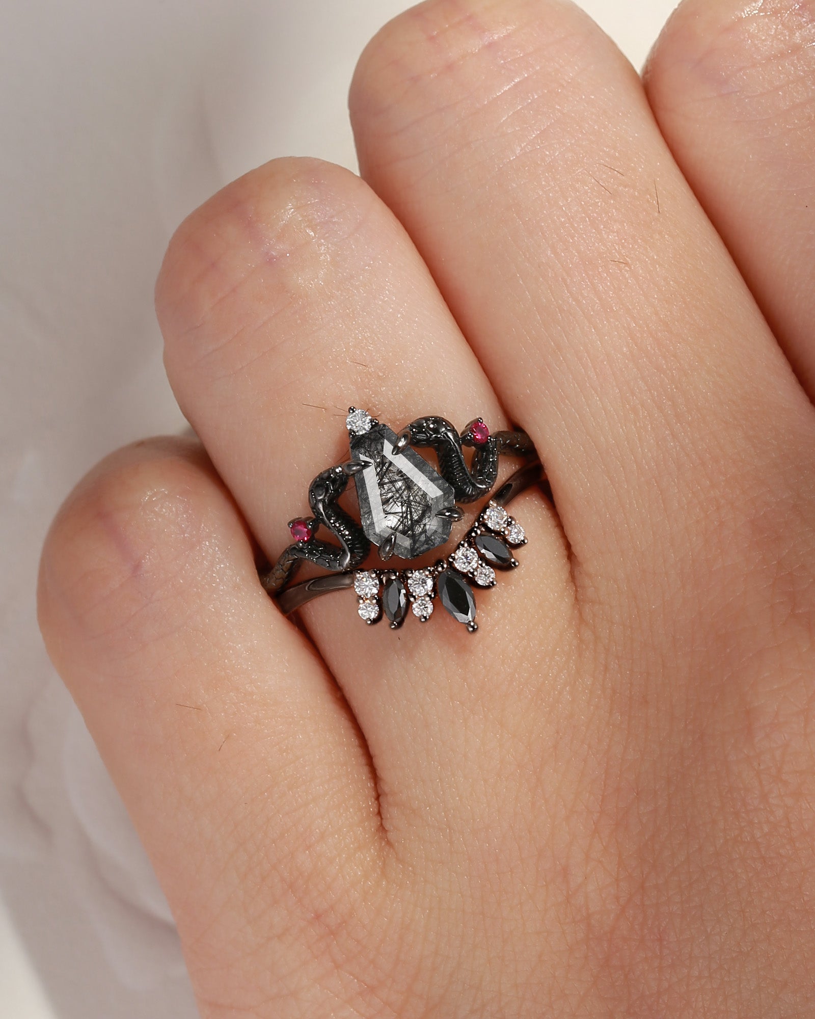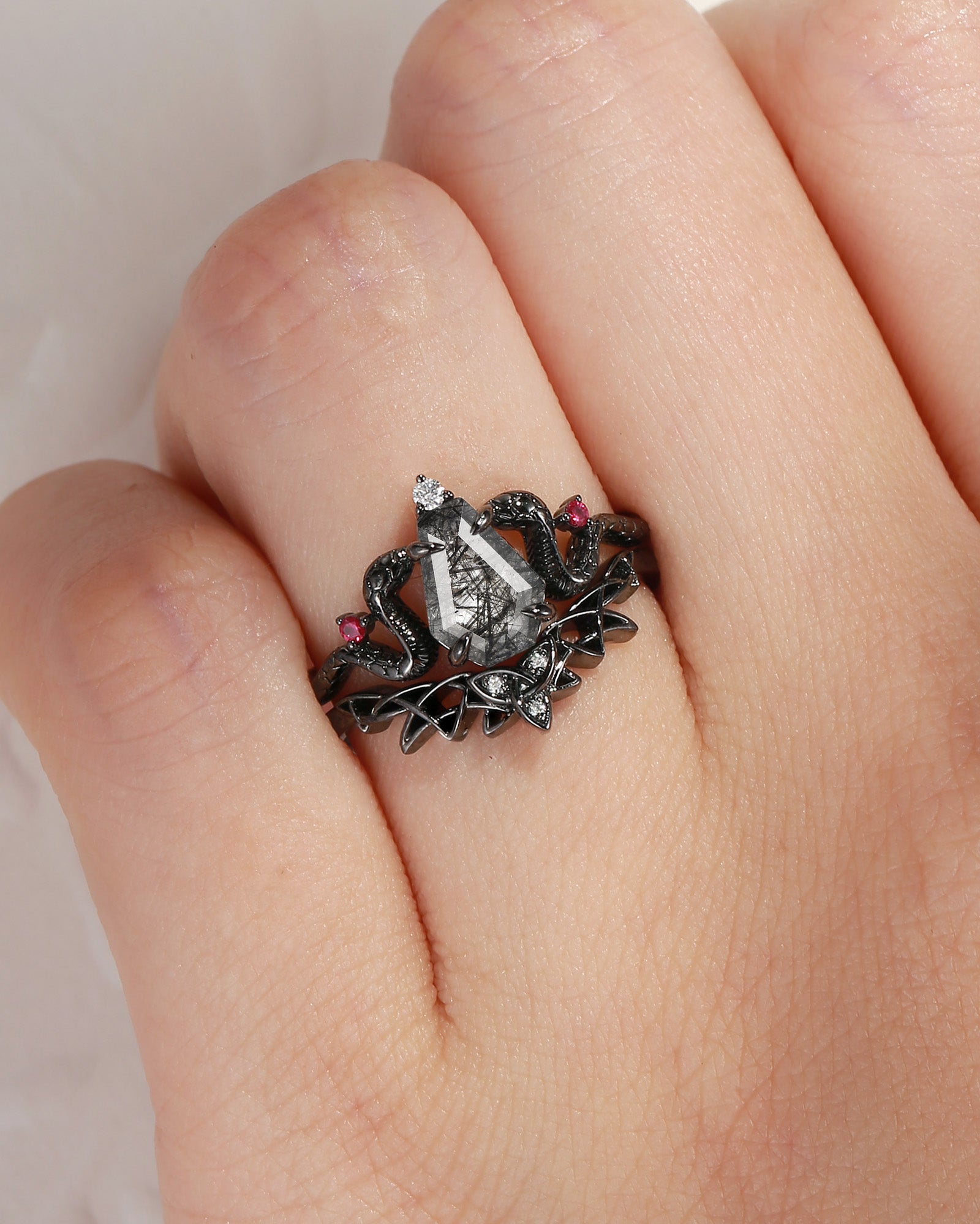 Gothic Coffin Cut Black Rutilated Quartz Engagement Ring - 'Serpent's Embrace'
