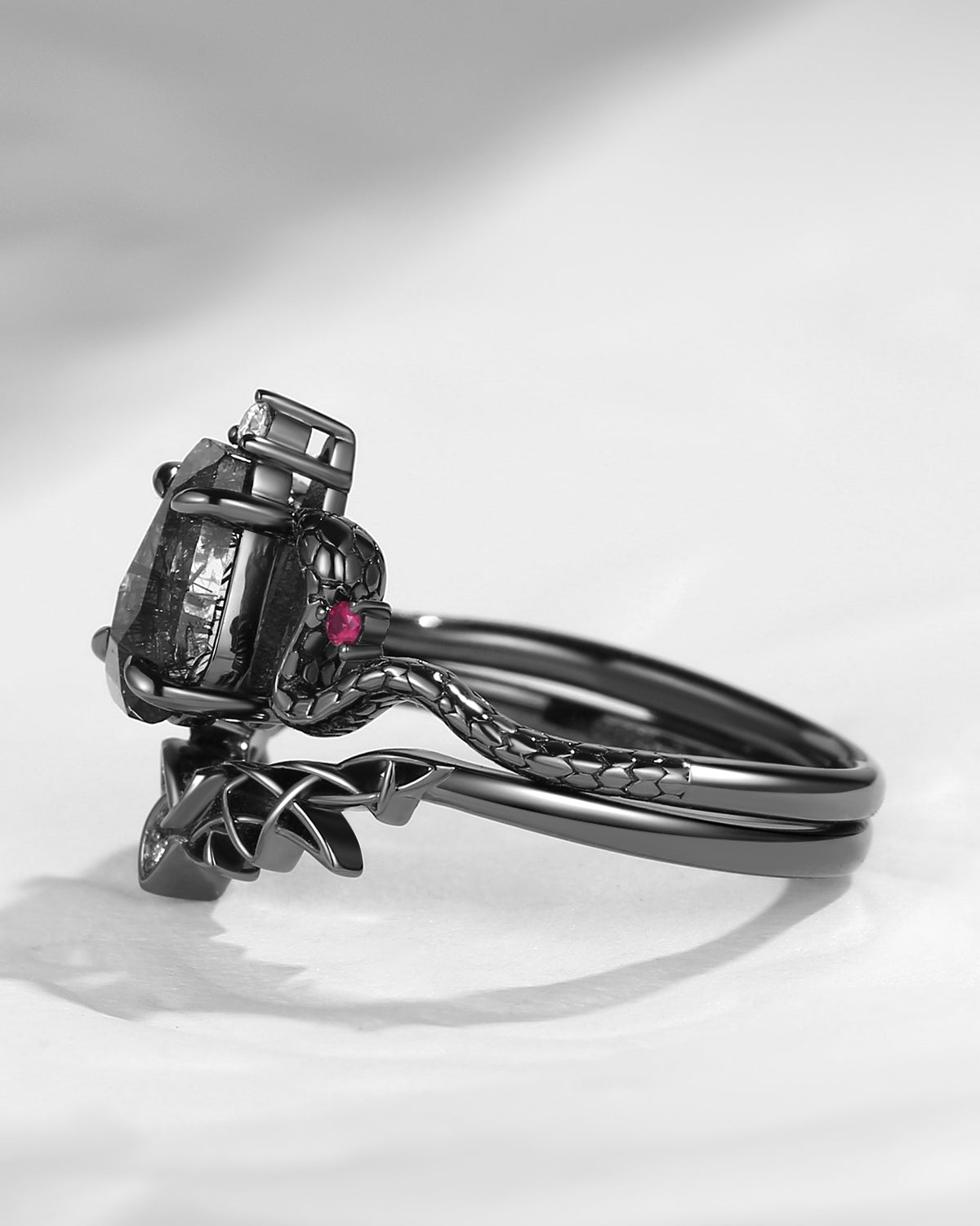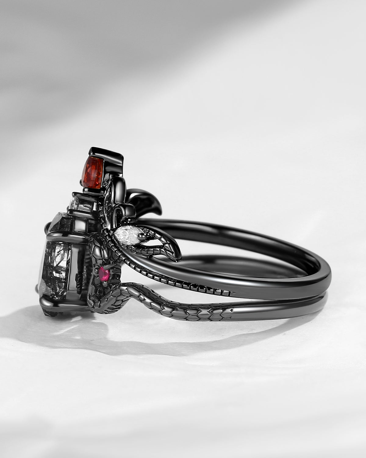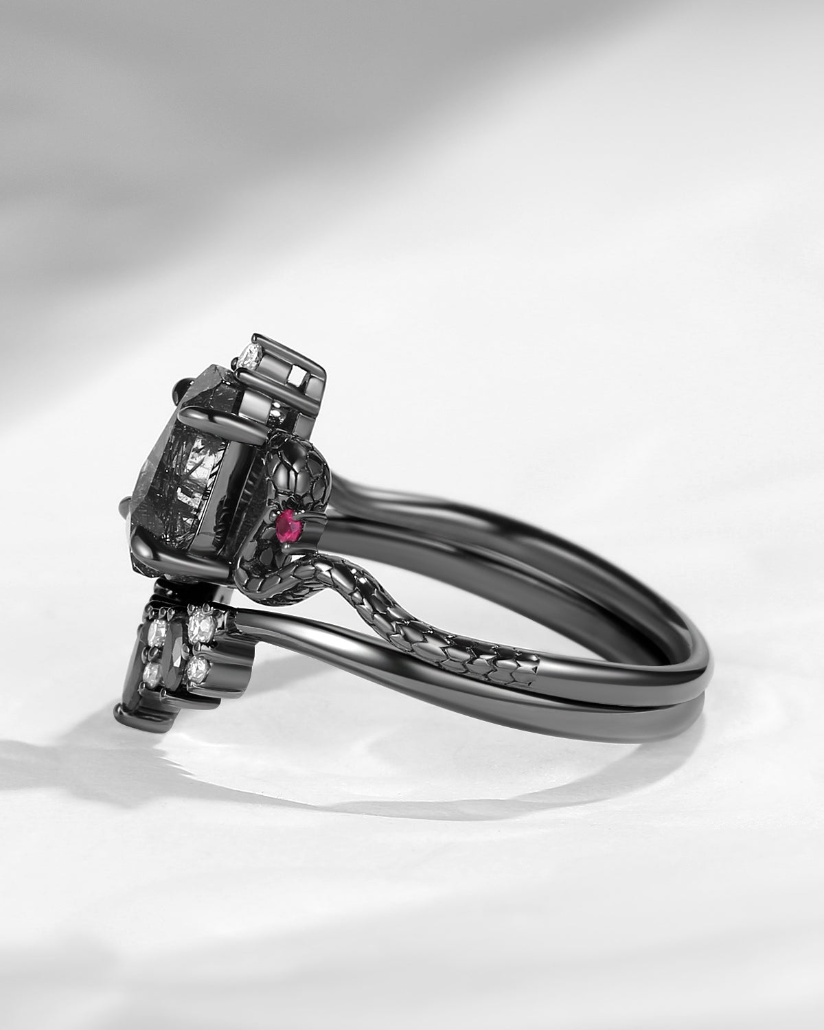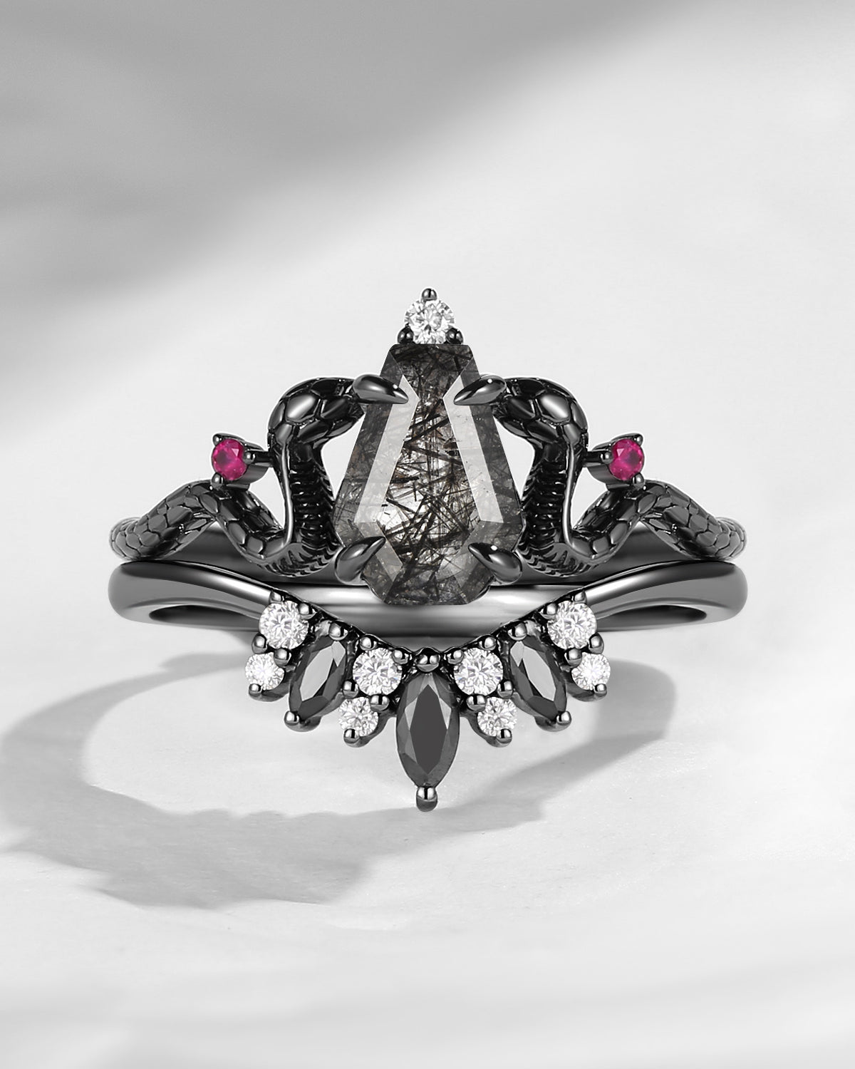 Gothic Coffin Cut Black Rutilated Quartz Engagement Ring - 'Serpent's Embrace'