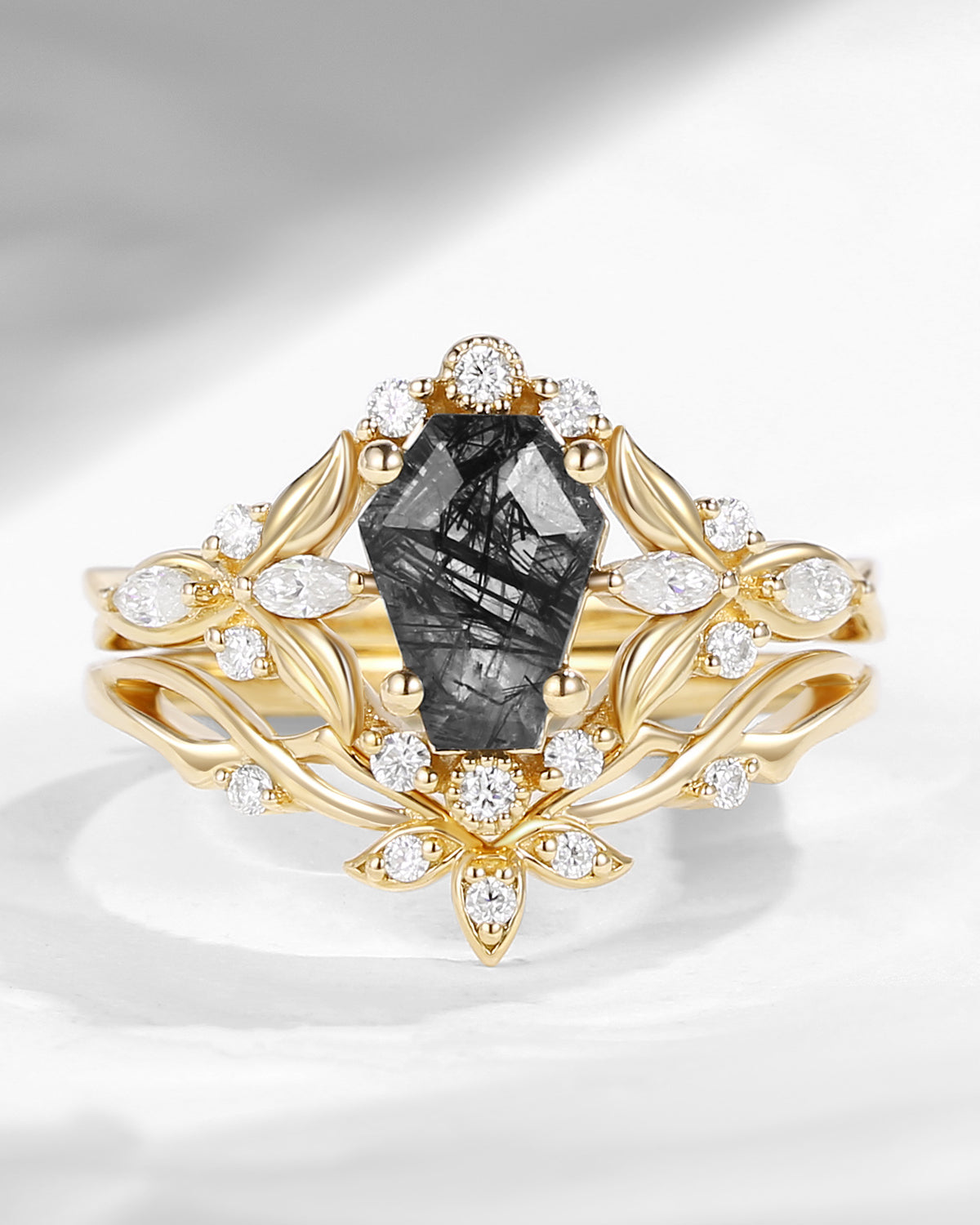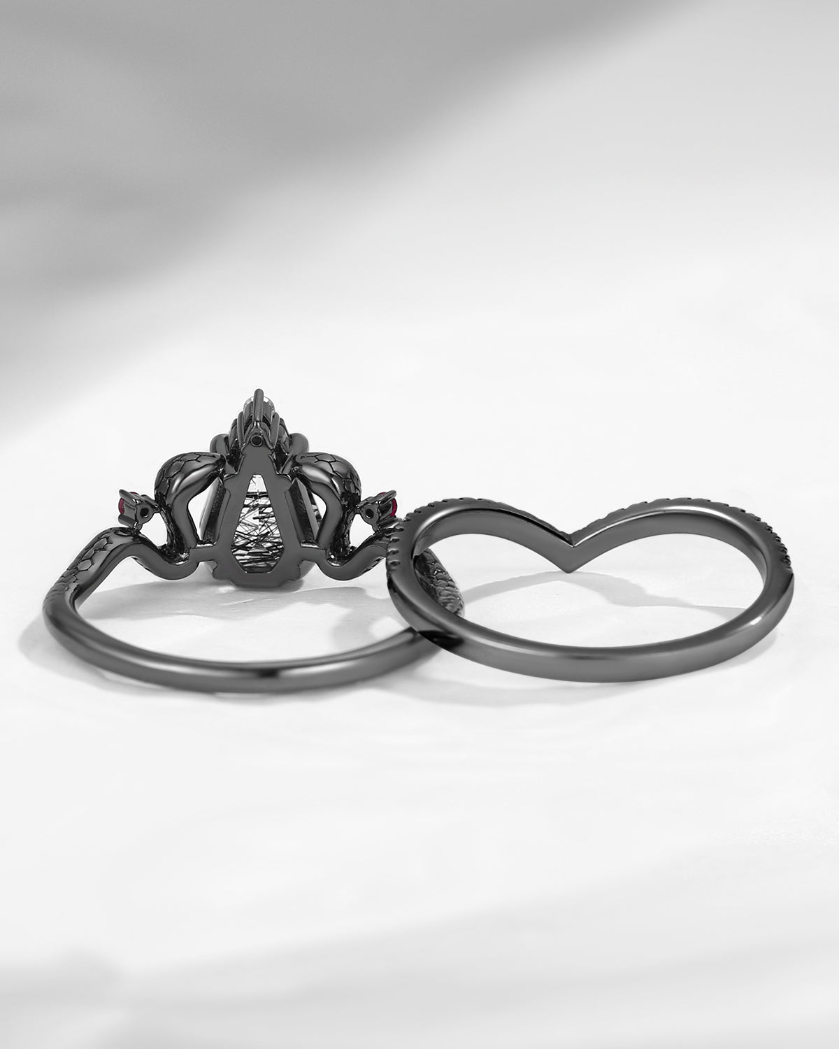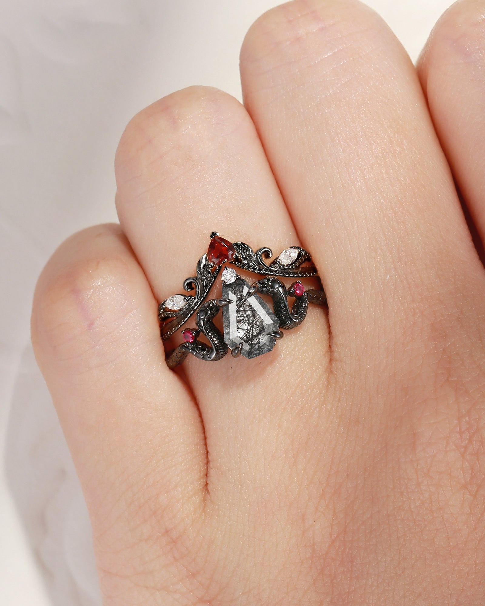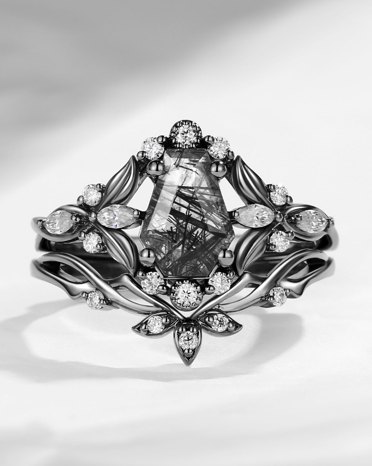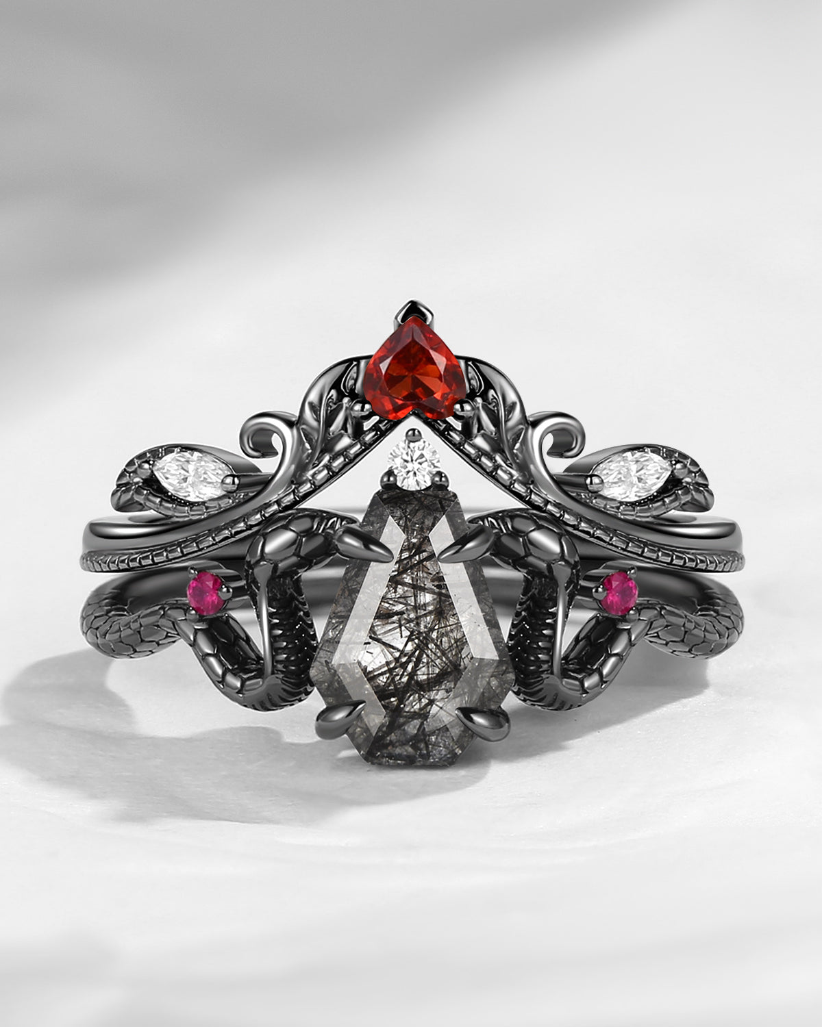 Gothic Coffin Cut Black Rutilated Quartz Engagement Ring - 'Serpent's Embrace'