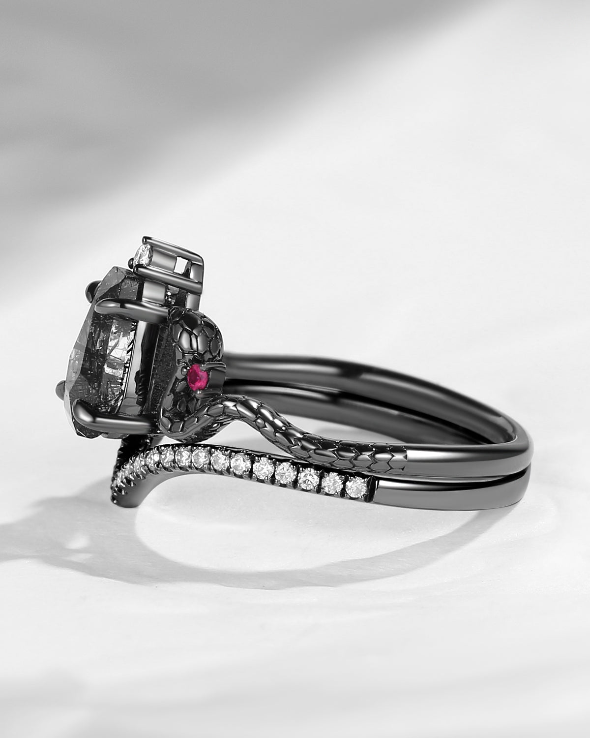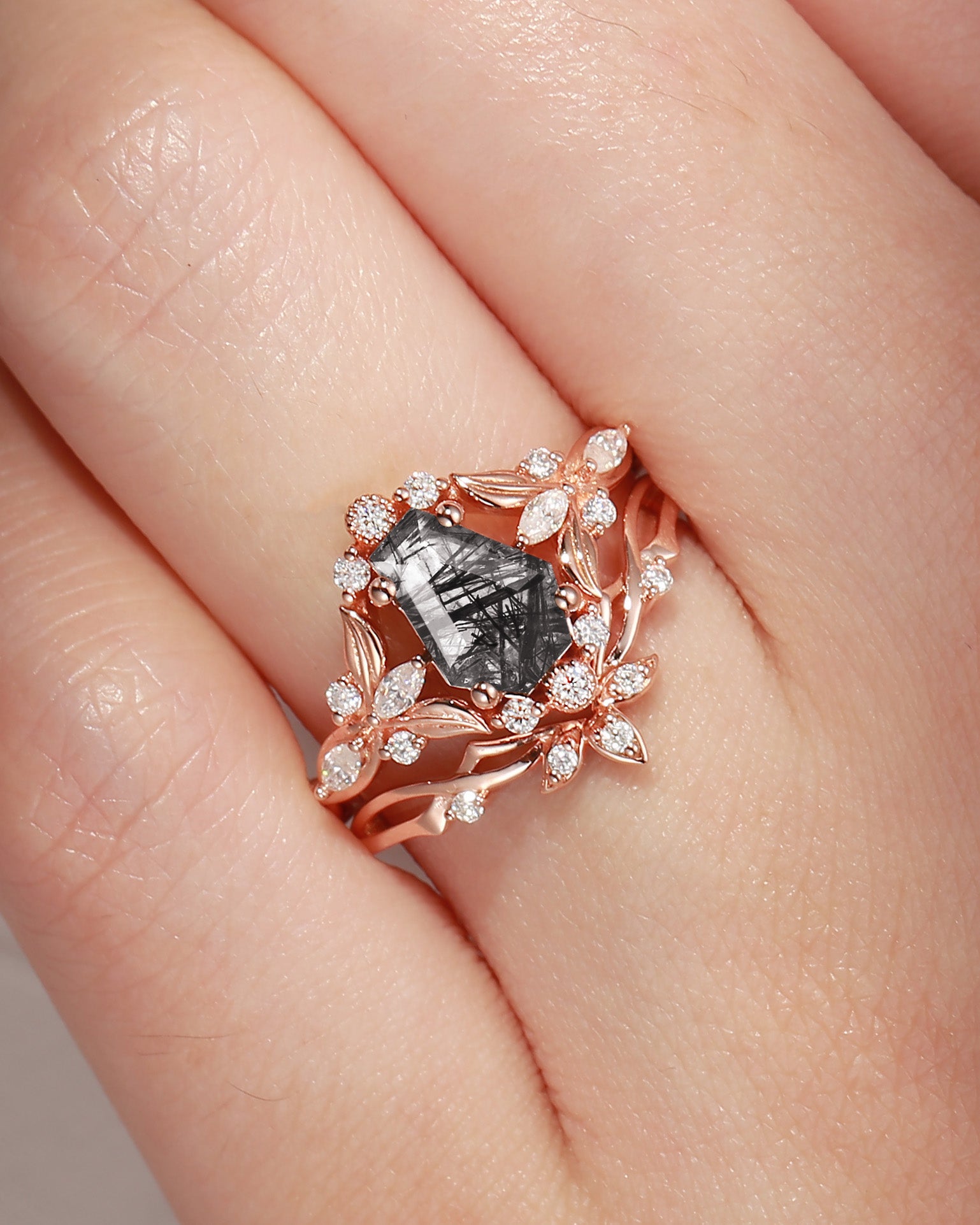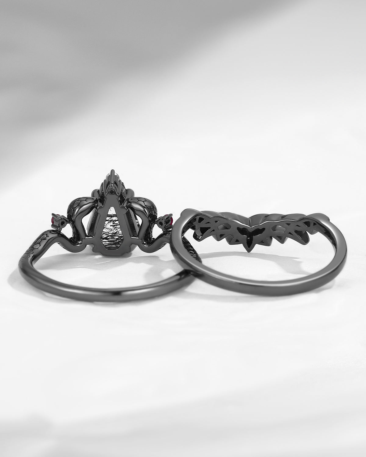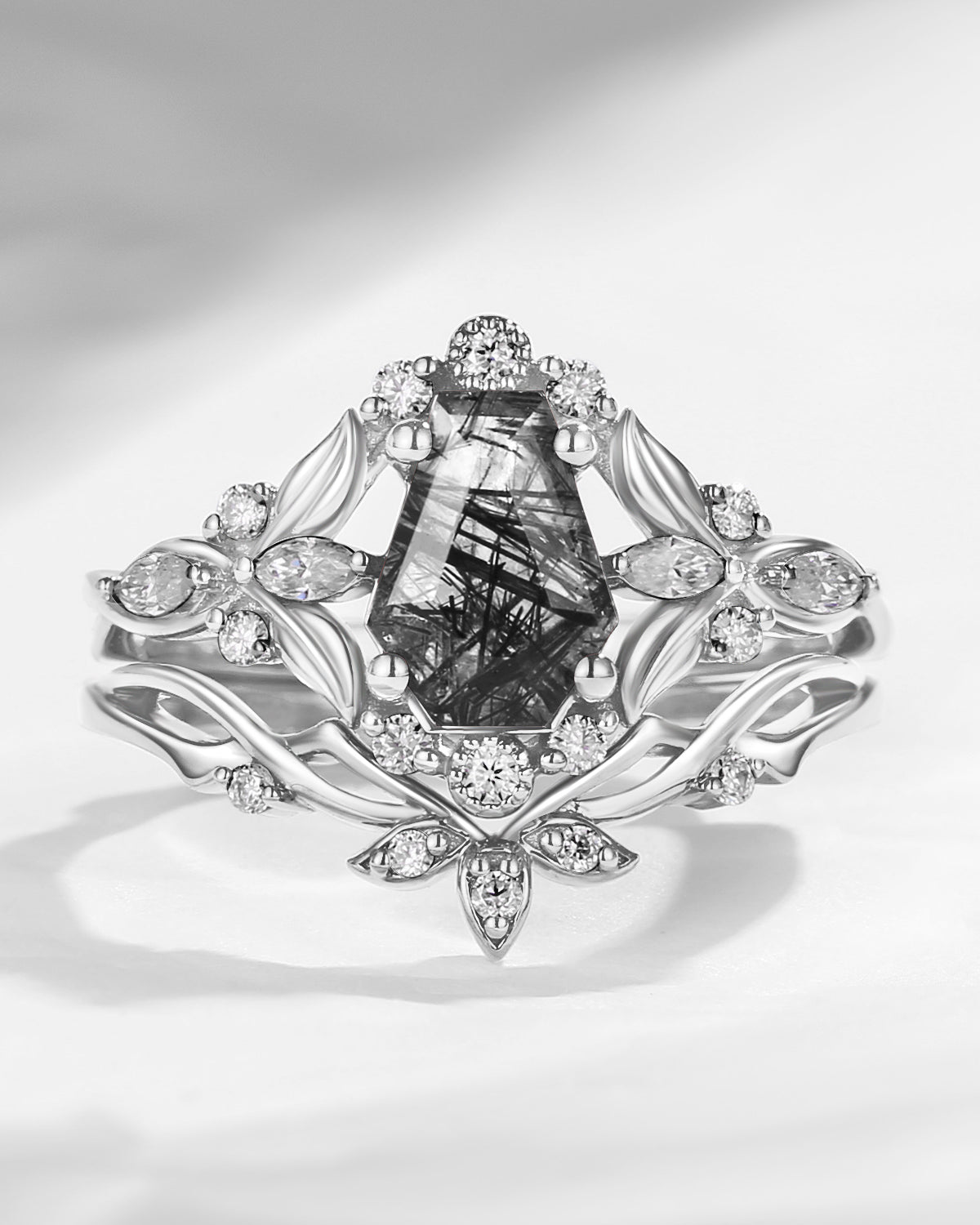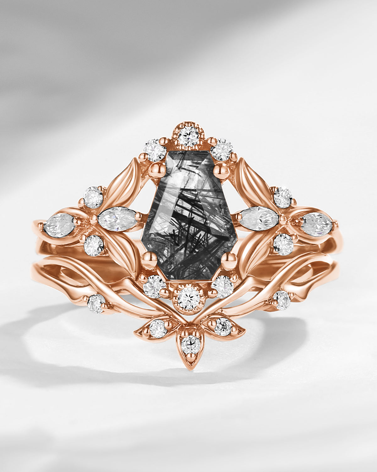 Gothic Coffin Cut Black Rutilated Quartz Engagement Ring - 'Serpent's Embrace'