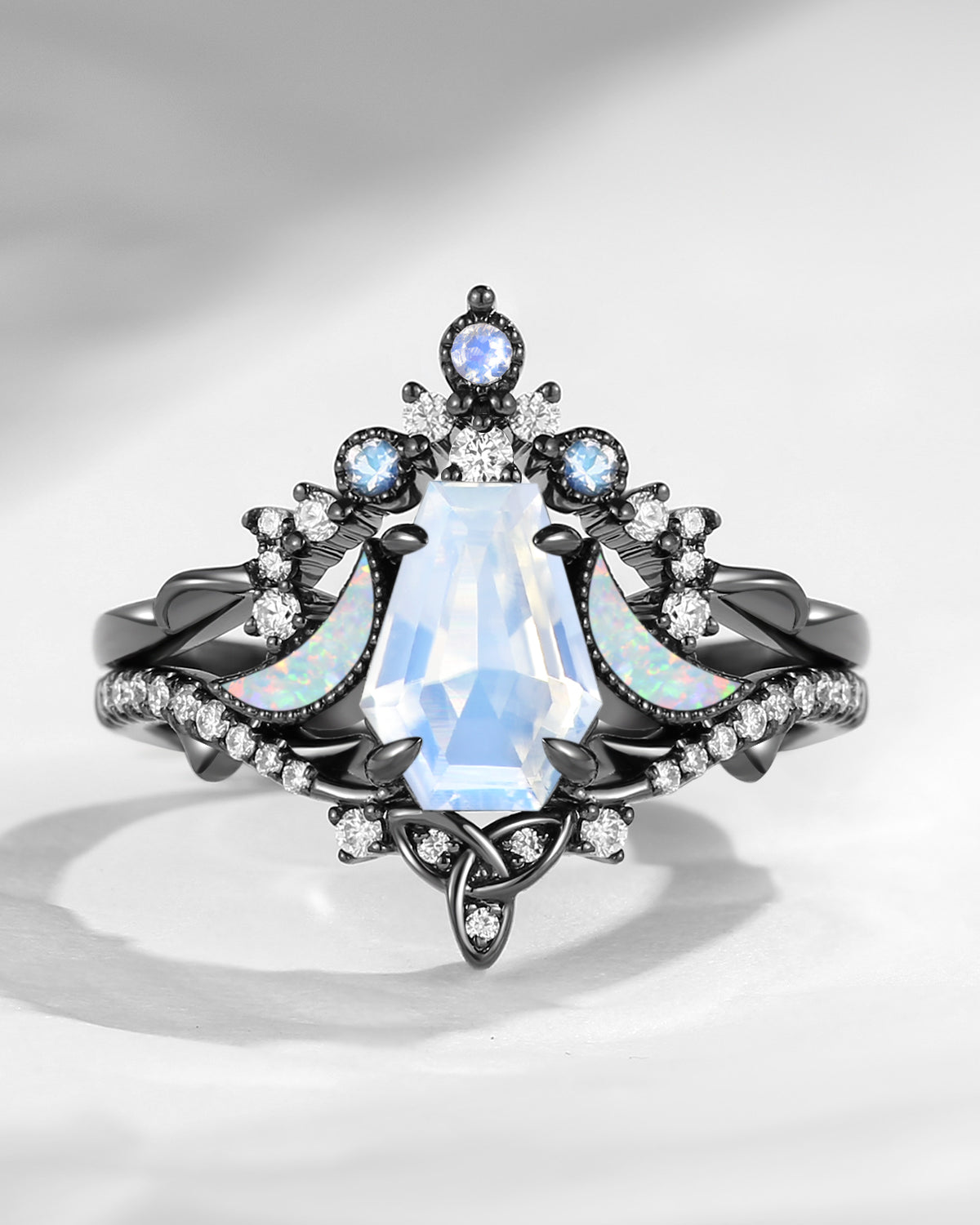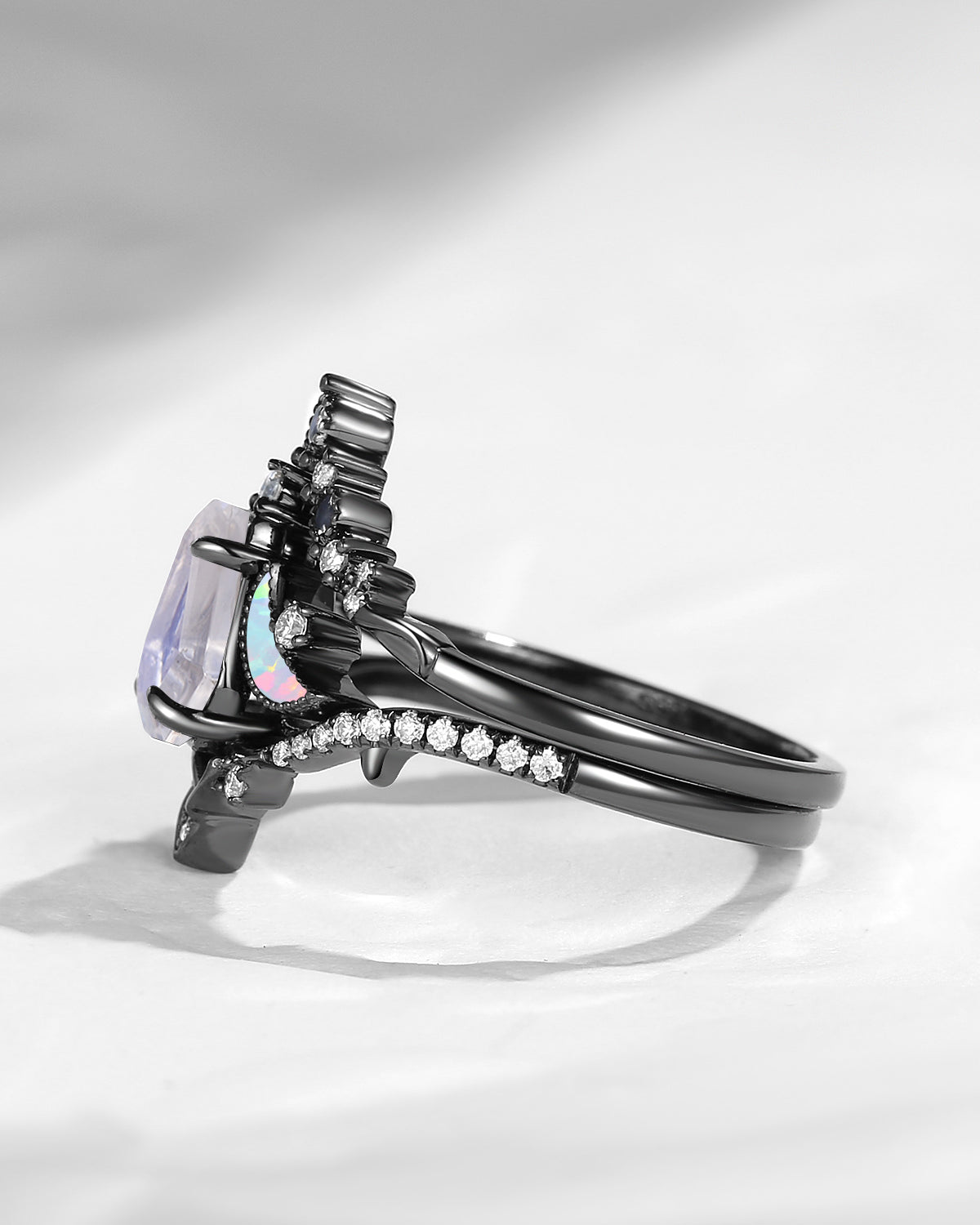 Crescent Moon | Unique Coffin Cut Lab Opal Engagement Ring Set 2pcs - Luna