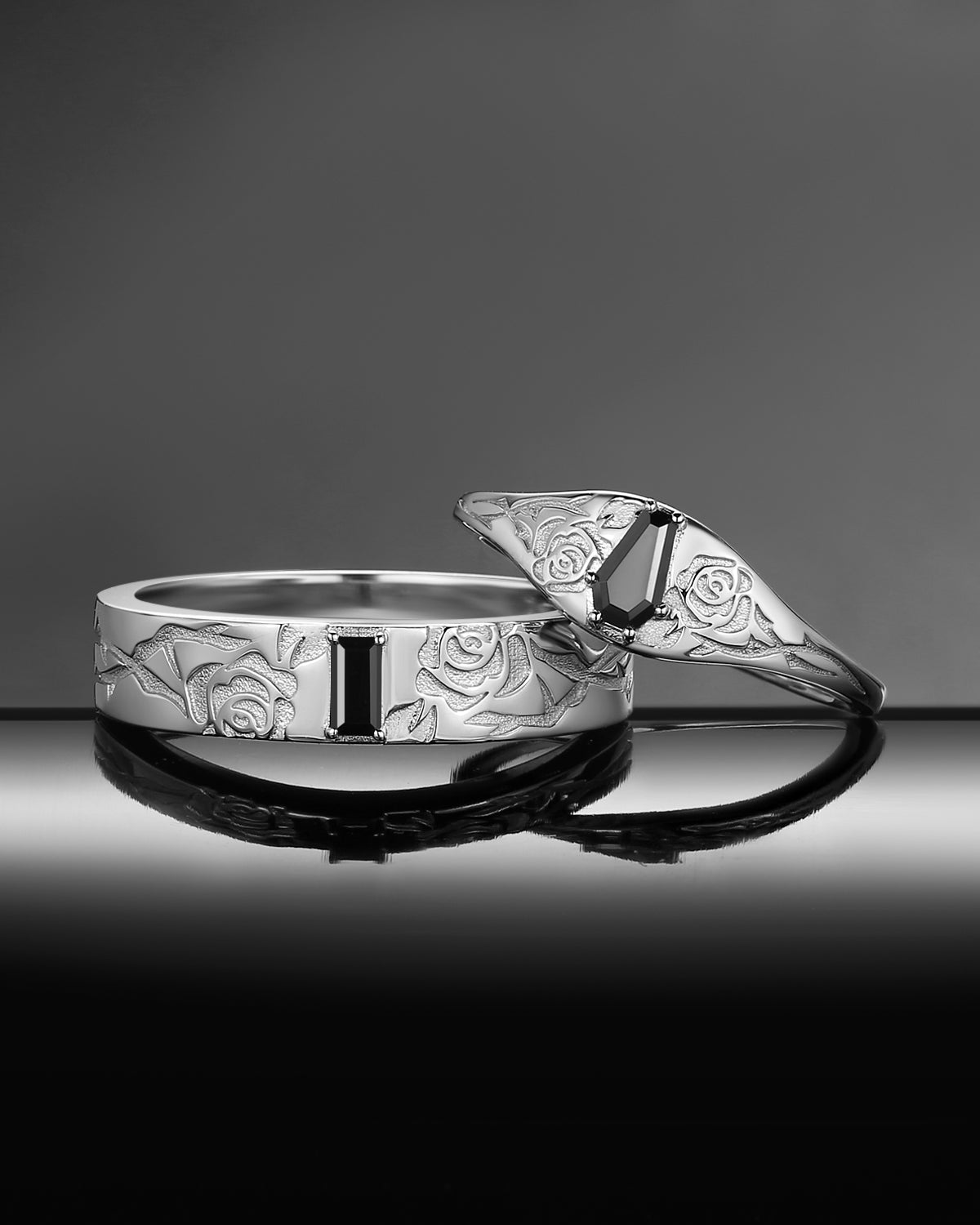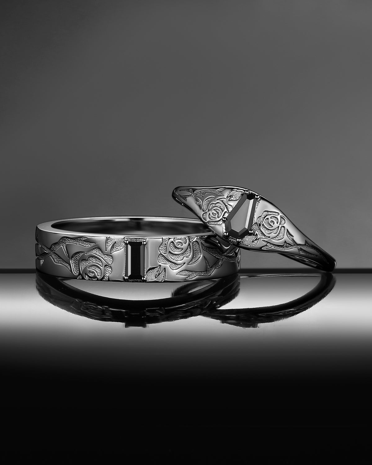 Gothic Inspired 'Thorns & Roses' Coffin Cut Garnet Couple Rings 2pcs