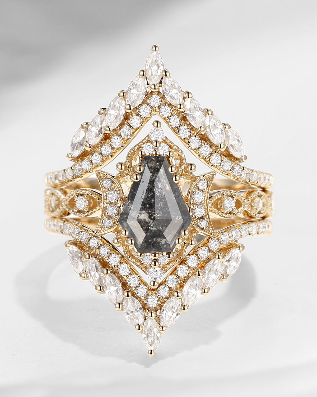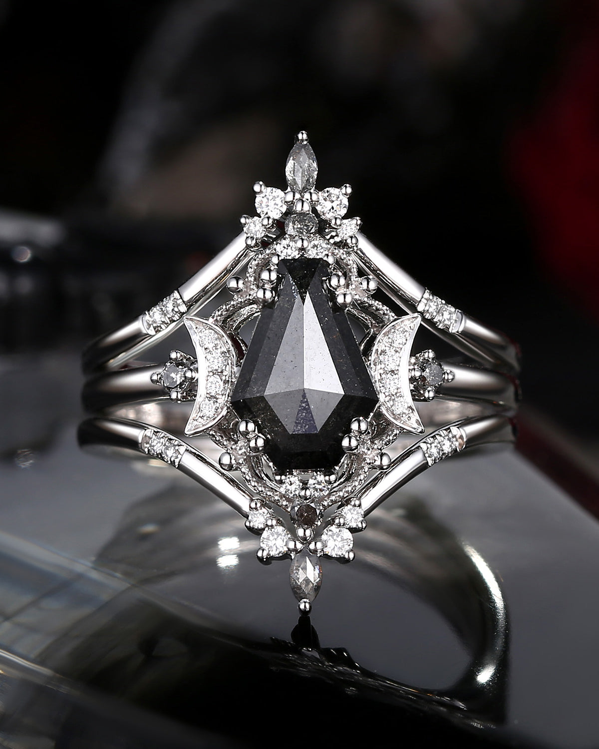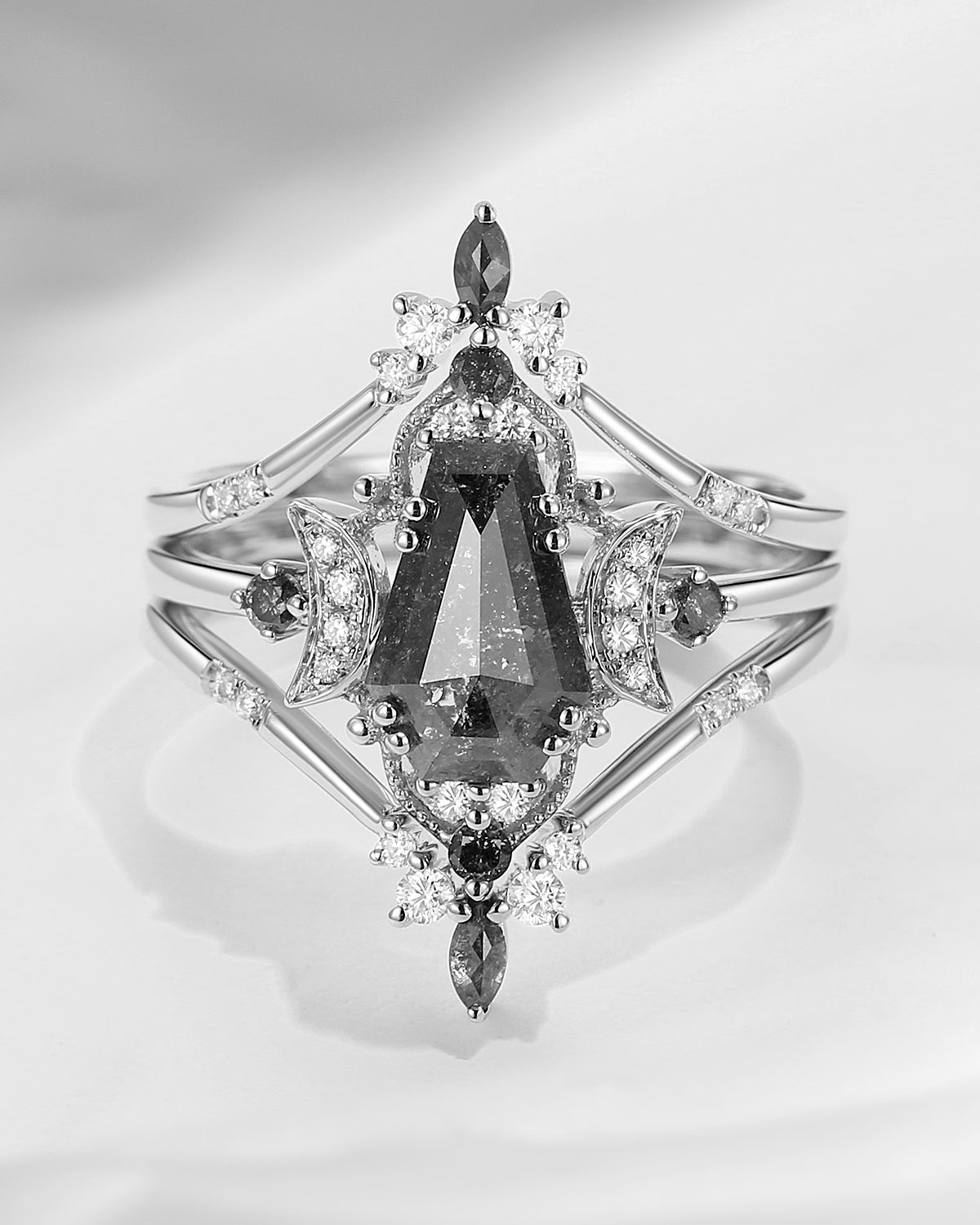 Crescent Moon | Coffin Cut Salt and Pepper Diamond Art-Deco Engagement Ring Set 3pcs