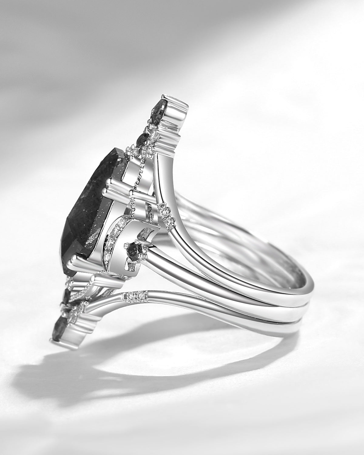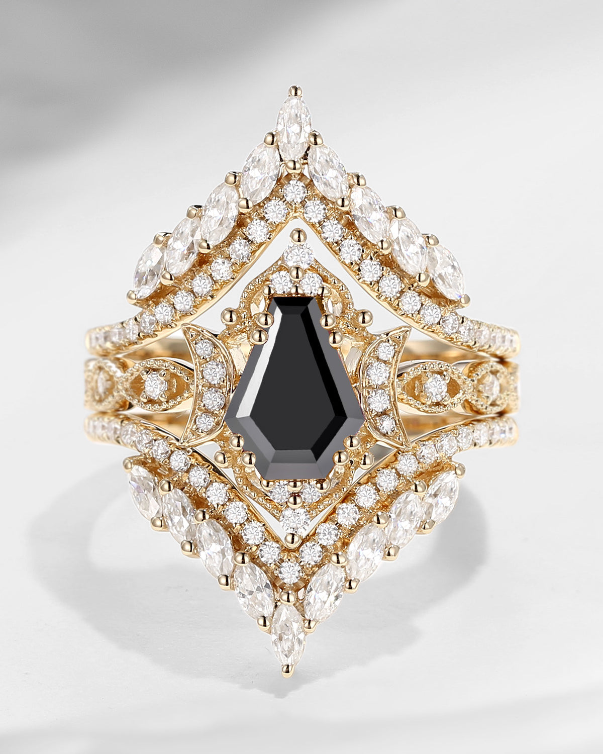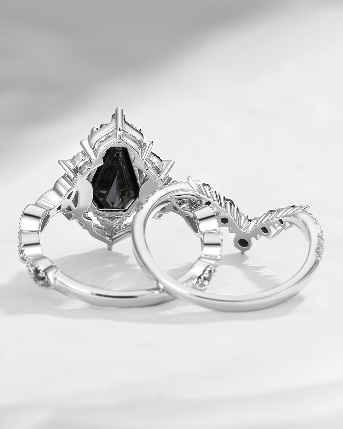 Crescent Moon | Coffin Cut Salt and Pepper Diamond Art-Deco Engagement Ring Set 3pcs