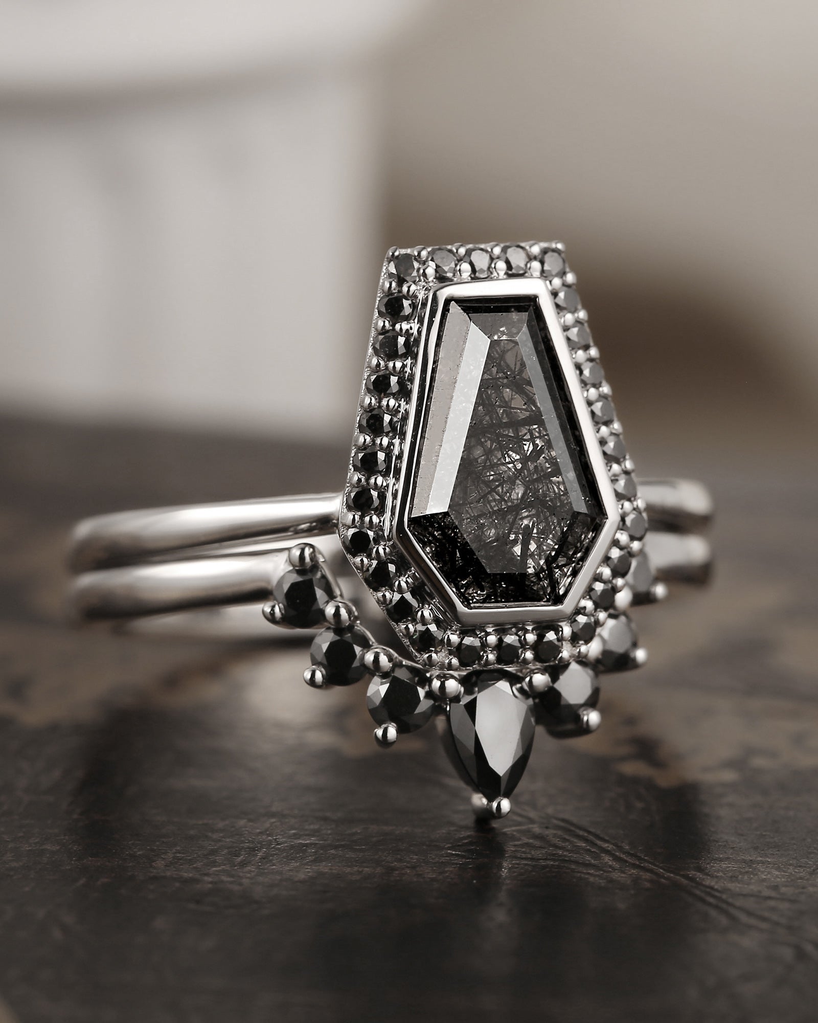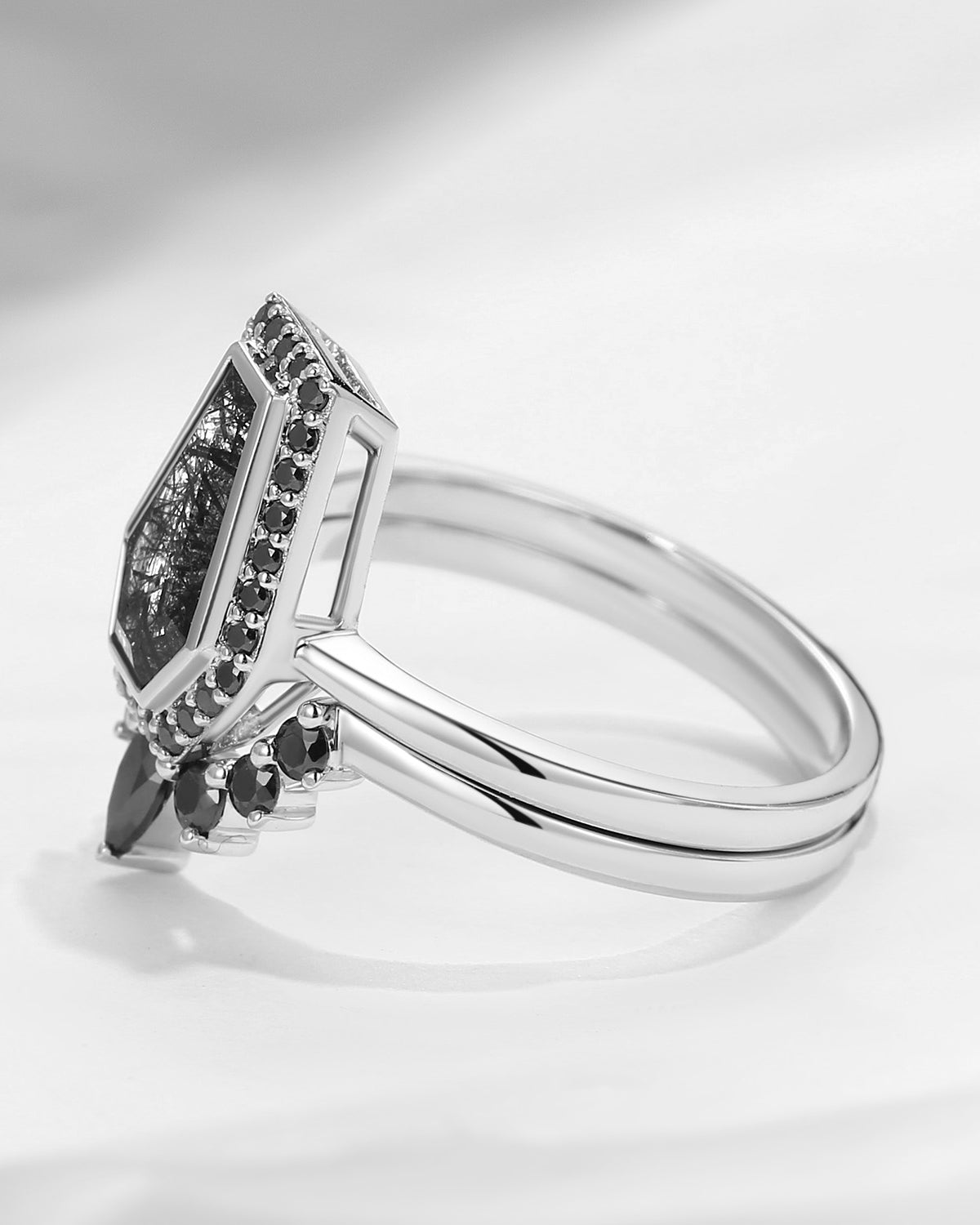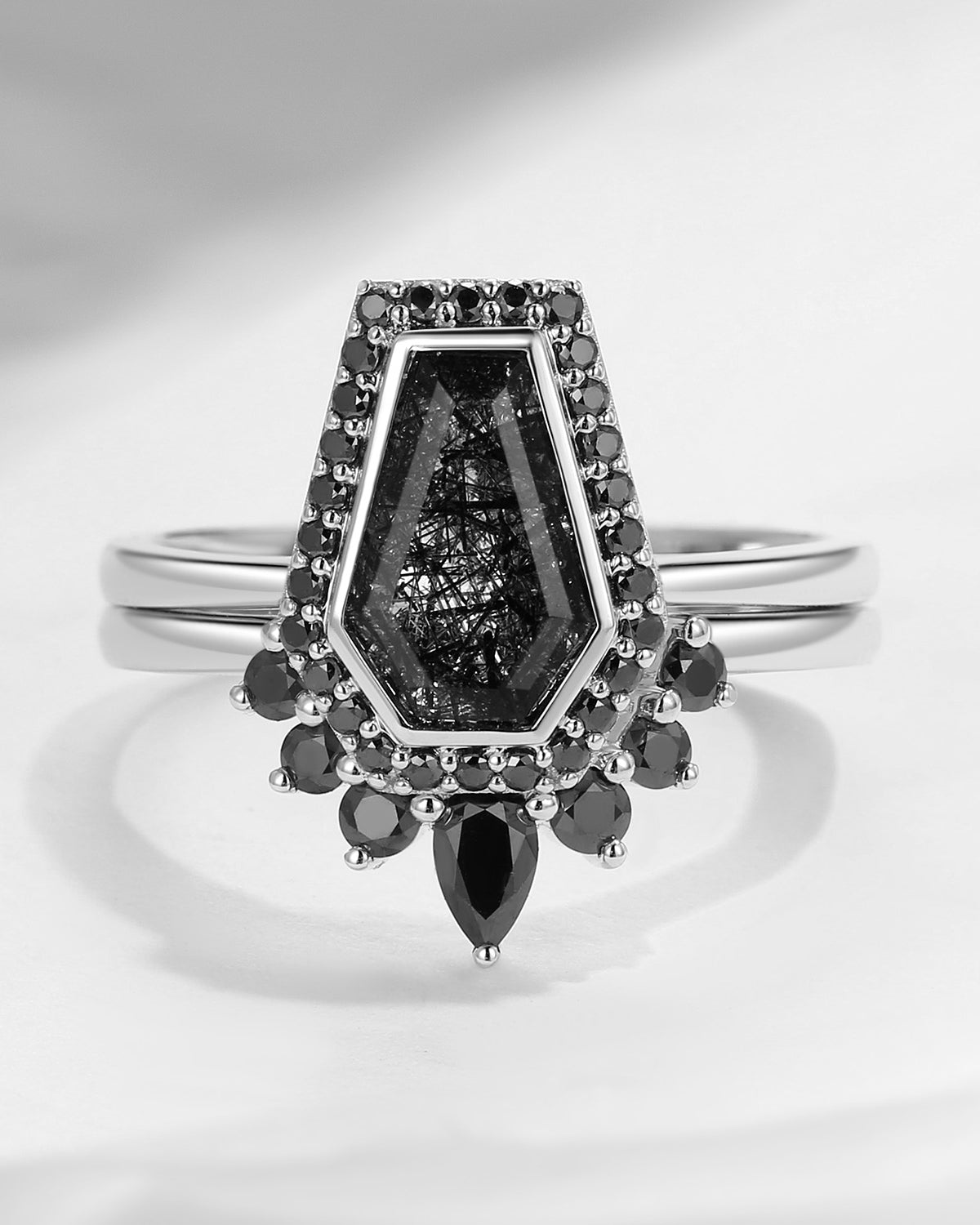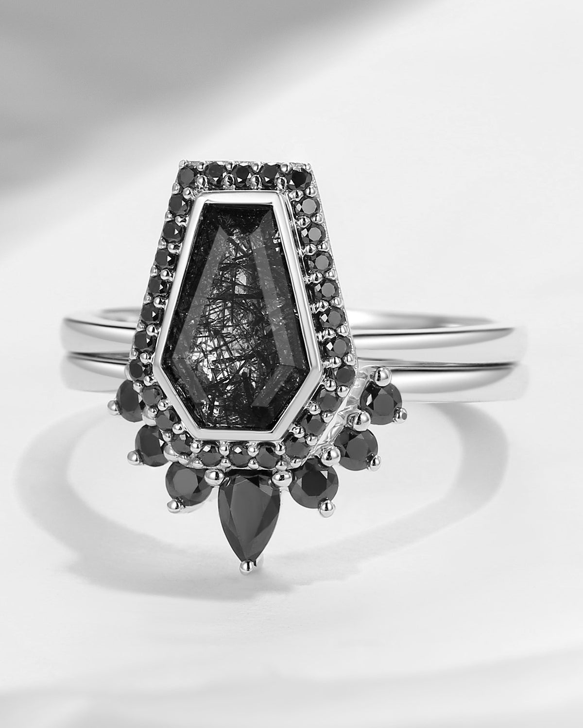 Coffin Cut Black Rutilated Quartz Engagement Ring Set 2pcs - Goth Girl