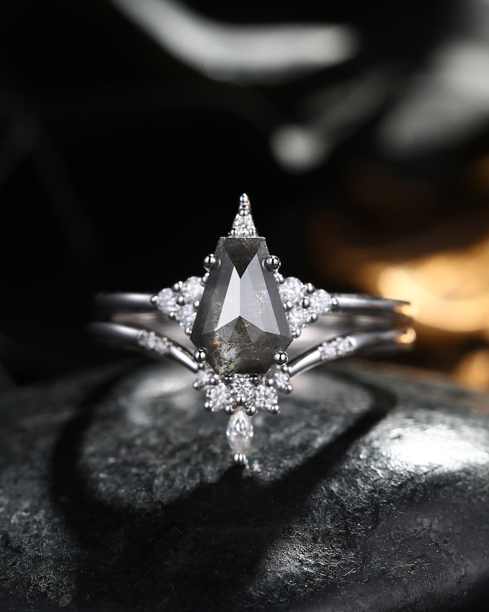 Coffin Cut Salt And Pepper Diamond Engagement Ring Set 2pcs - Goth Girl