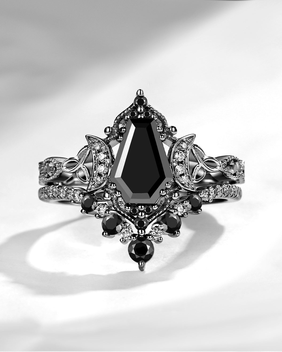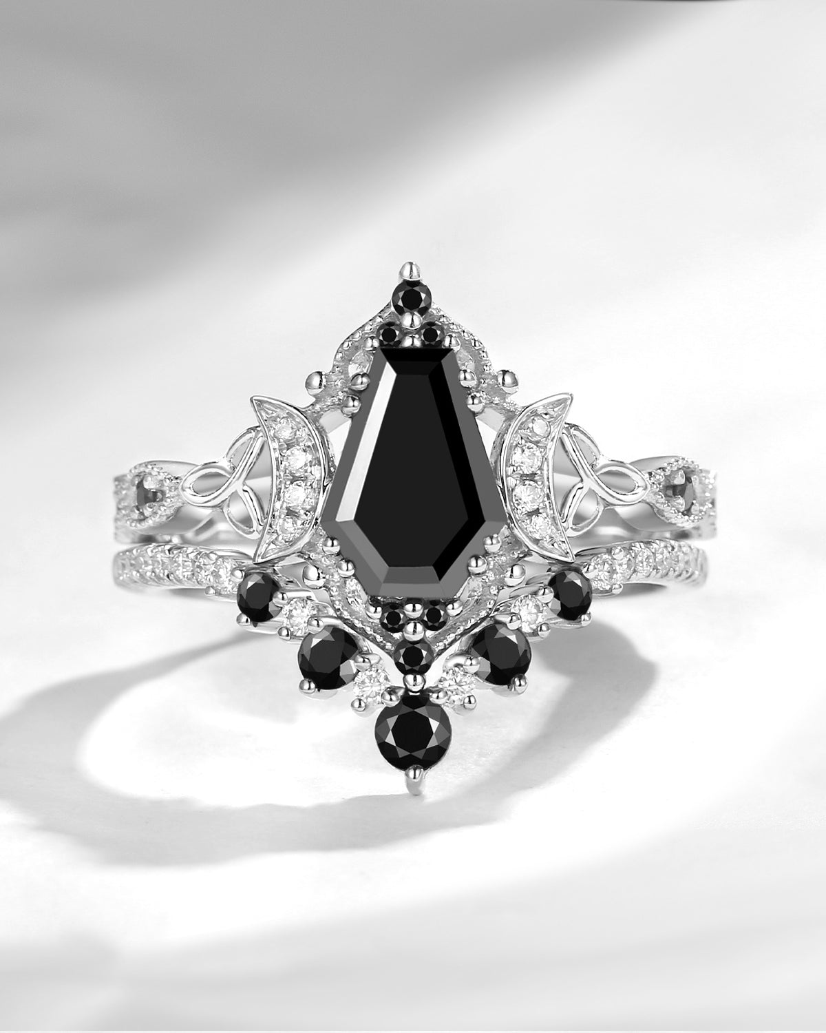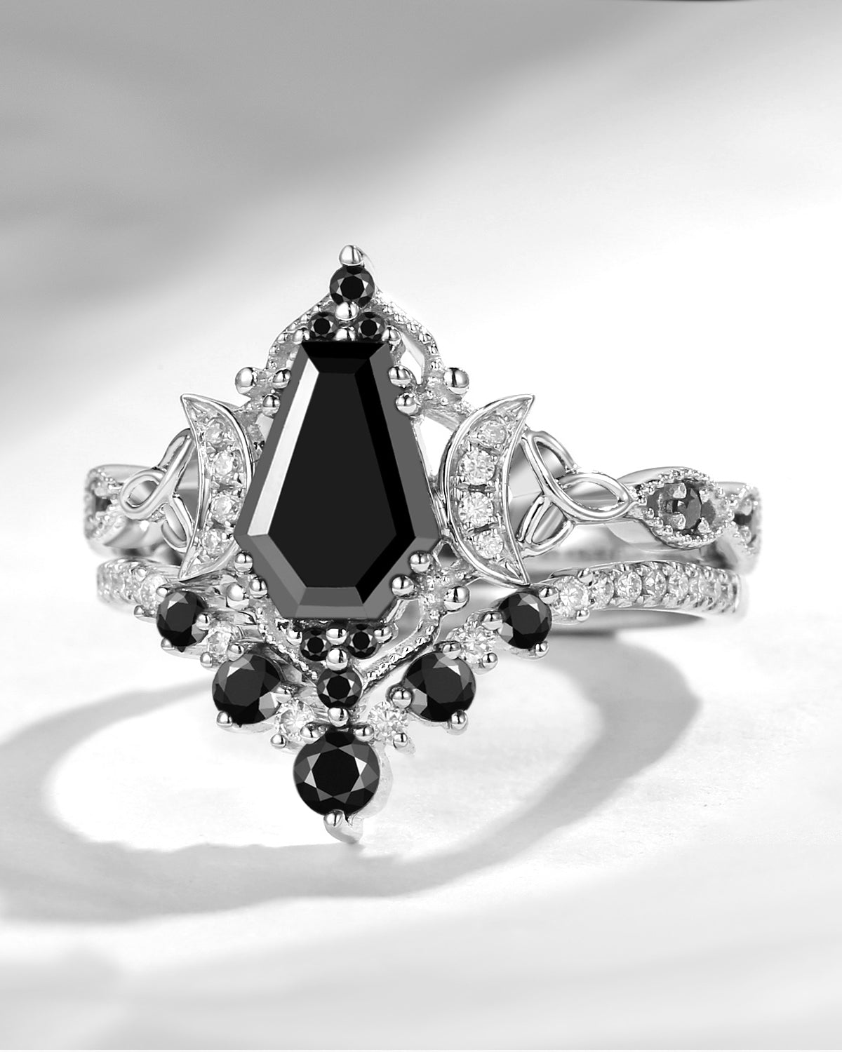Crescent Moon | Unique Coffin Cut Black Moissanite Celtic Engagement Ring Set 2pcs