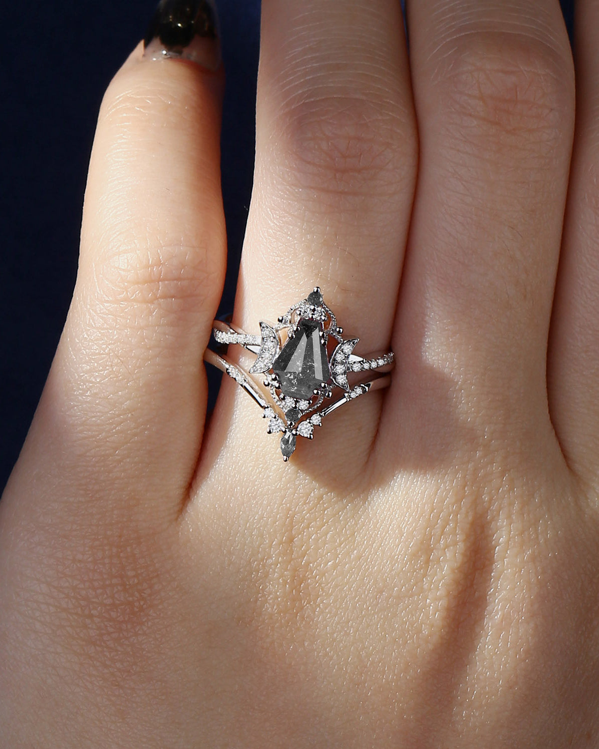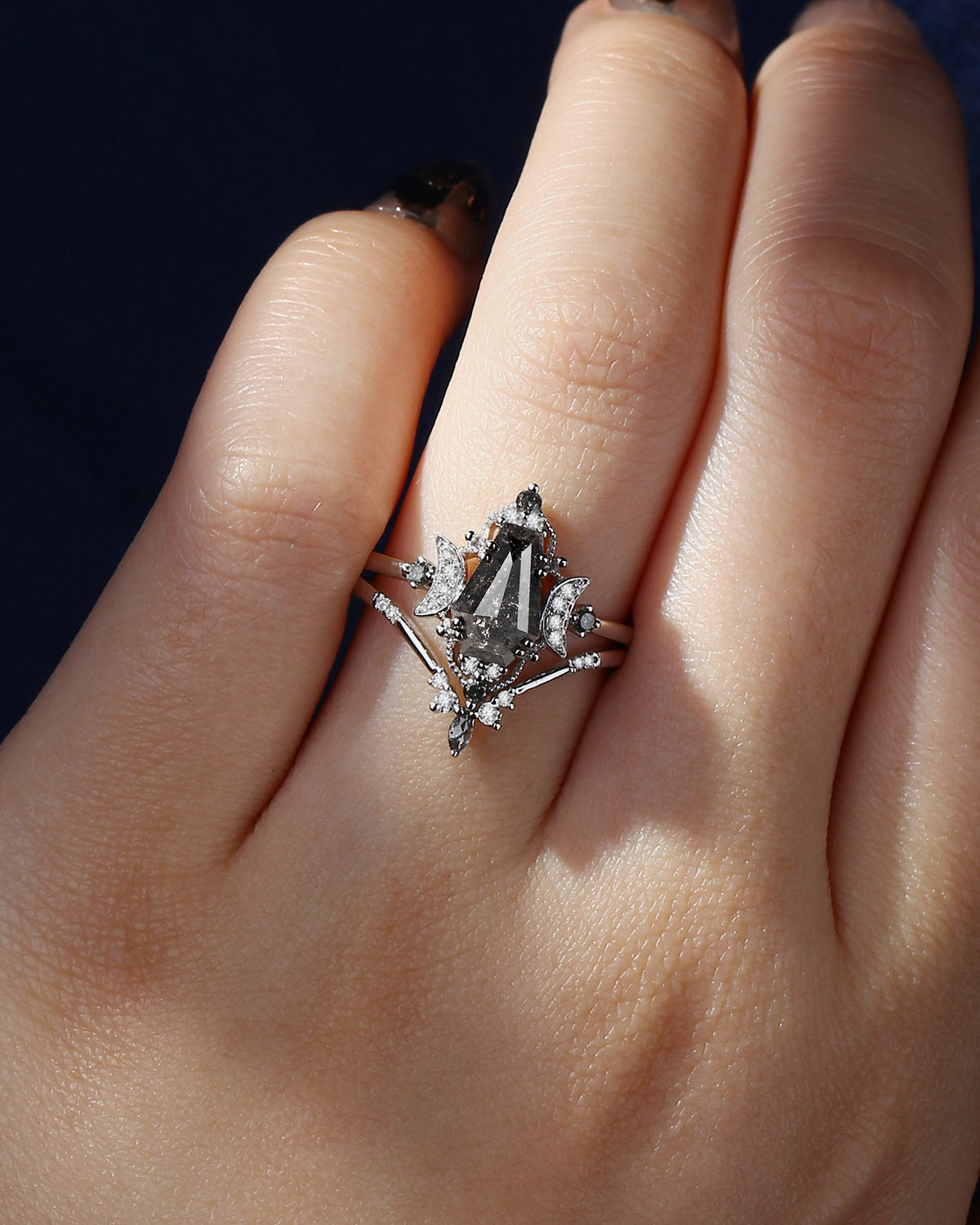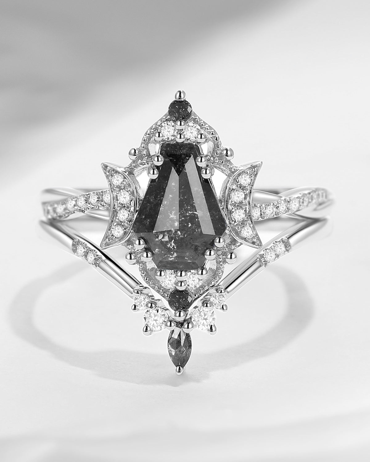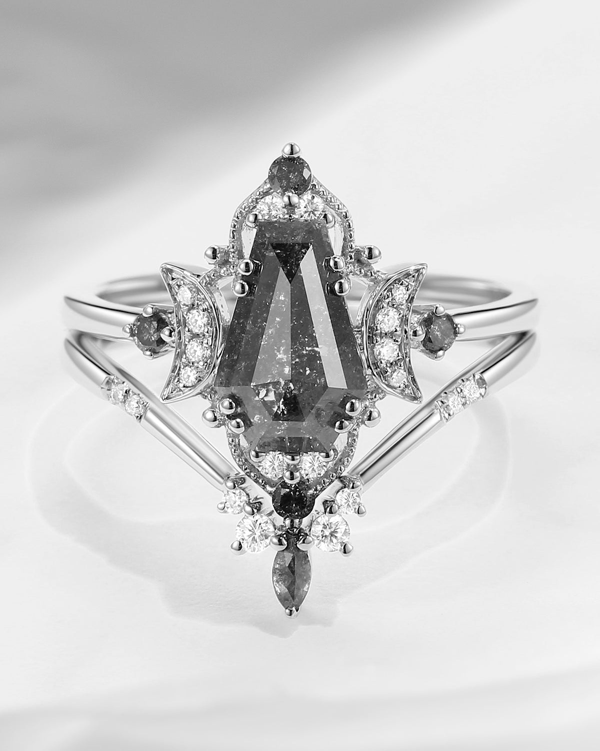 Crescent Moon | Coffin Cut Salt and Pepper Diamond Engagement Ring Set 2pcs