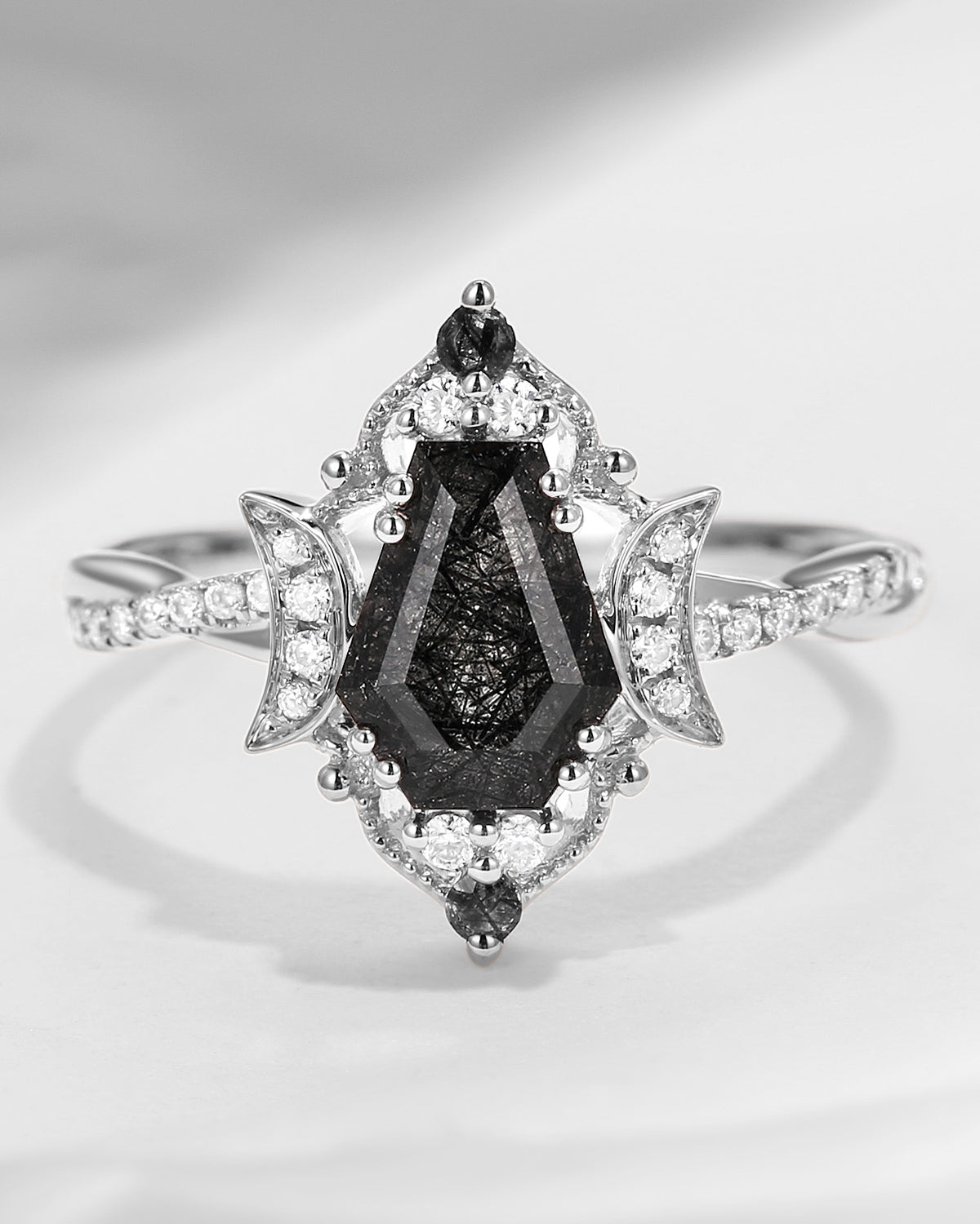 Crescent Moon | Coffin Cut Black Rutilated Quartz Infinity Galaxy Engagement Ring