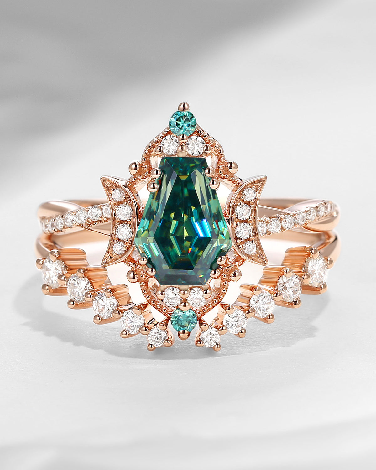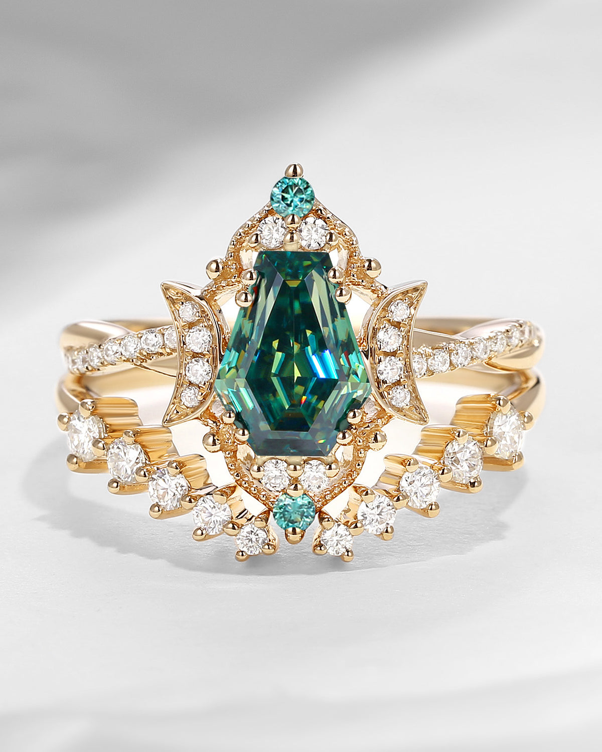 Crescent Moon | Coffin Cut Teal Moissanite 'Black Statement' Ring Set 3pcs