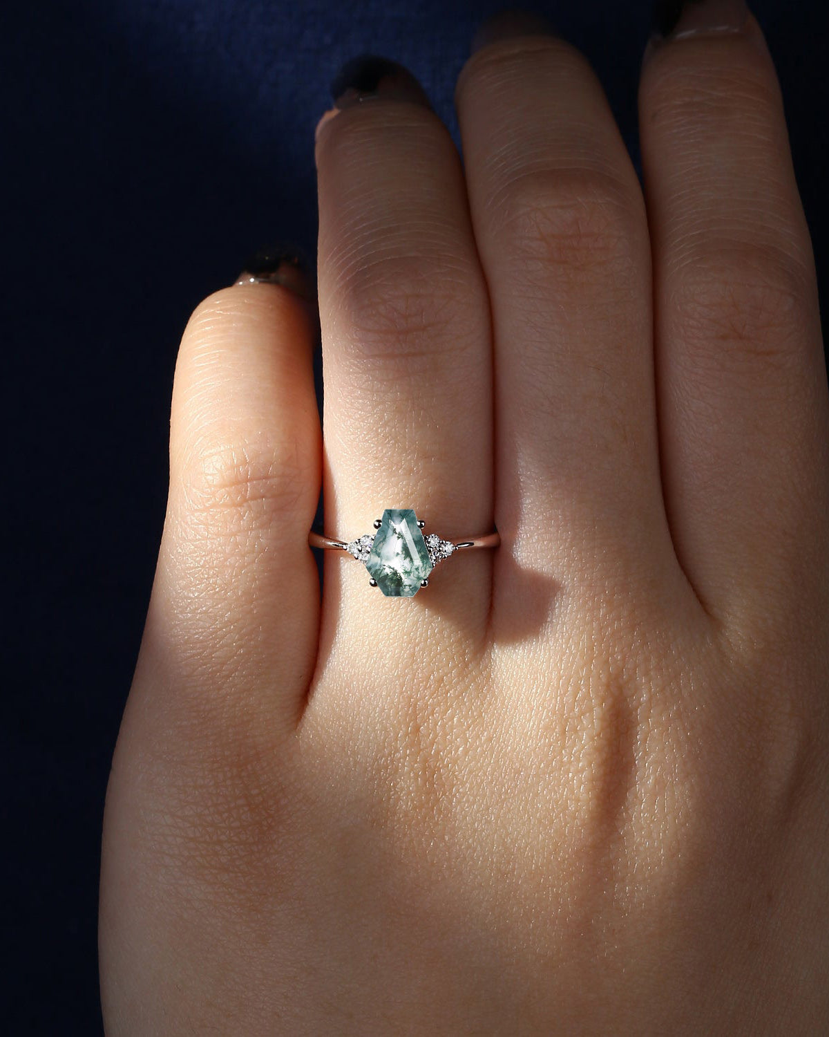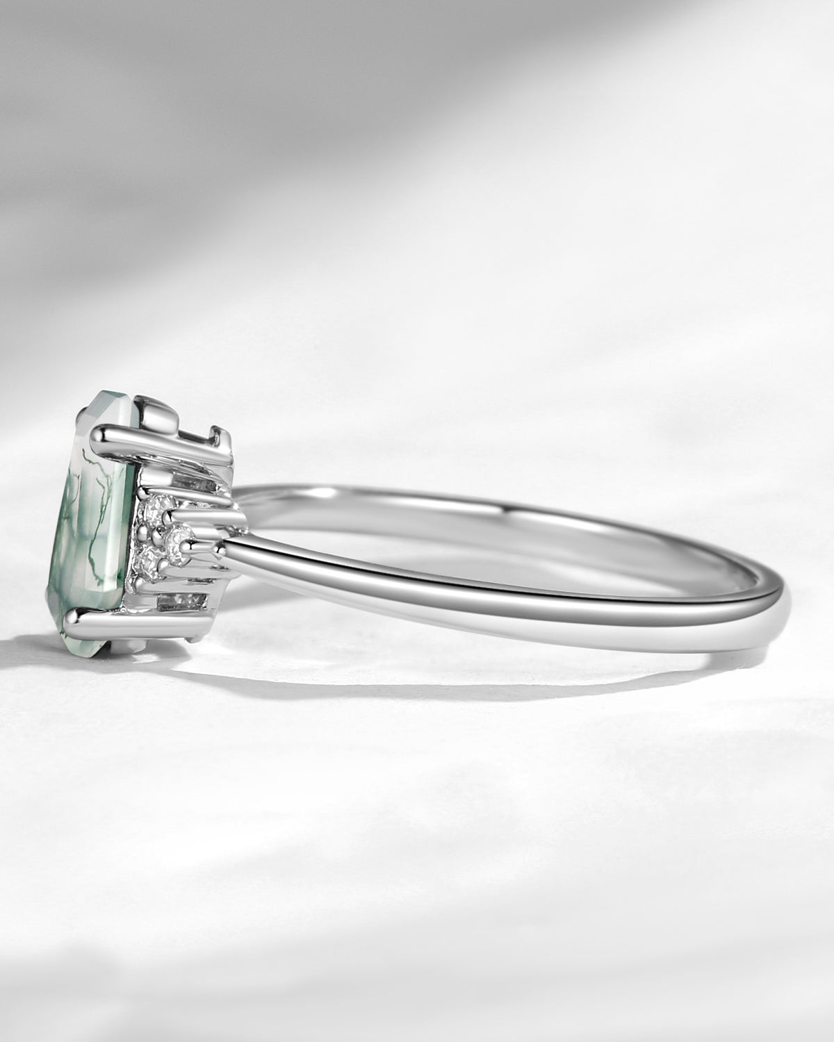 Classic Coffin Shaped Moss Agate Cluster Engagement Ring