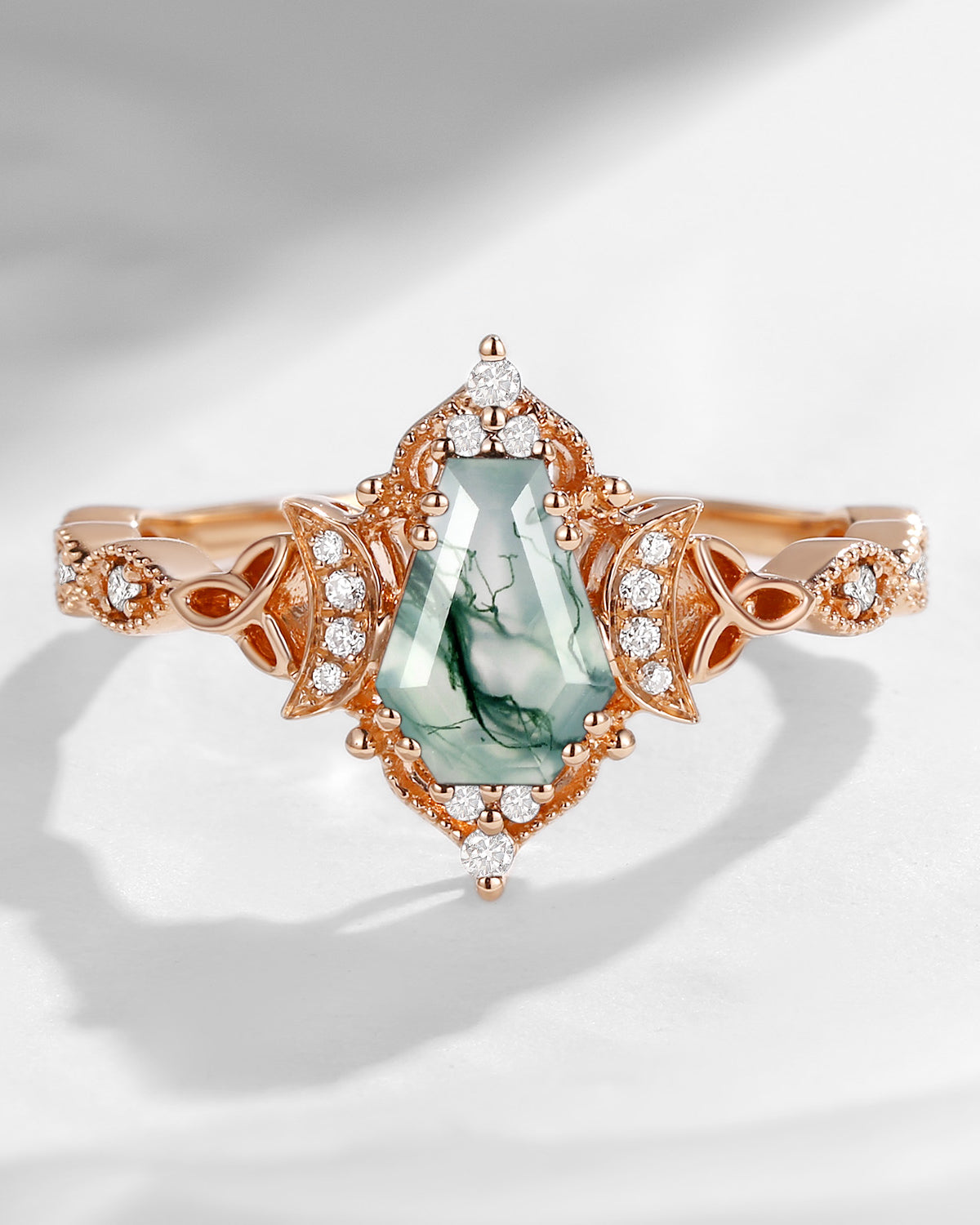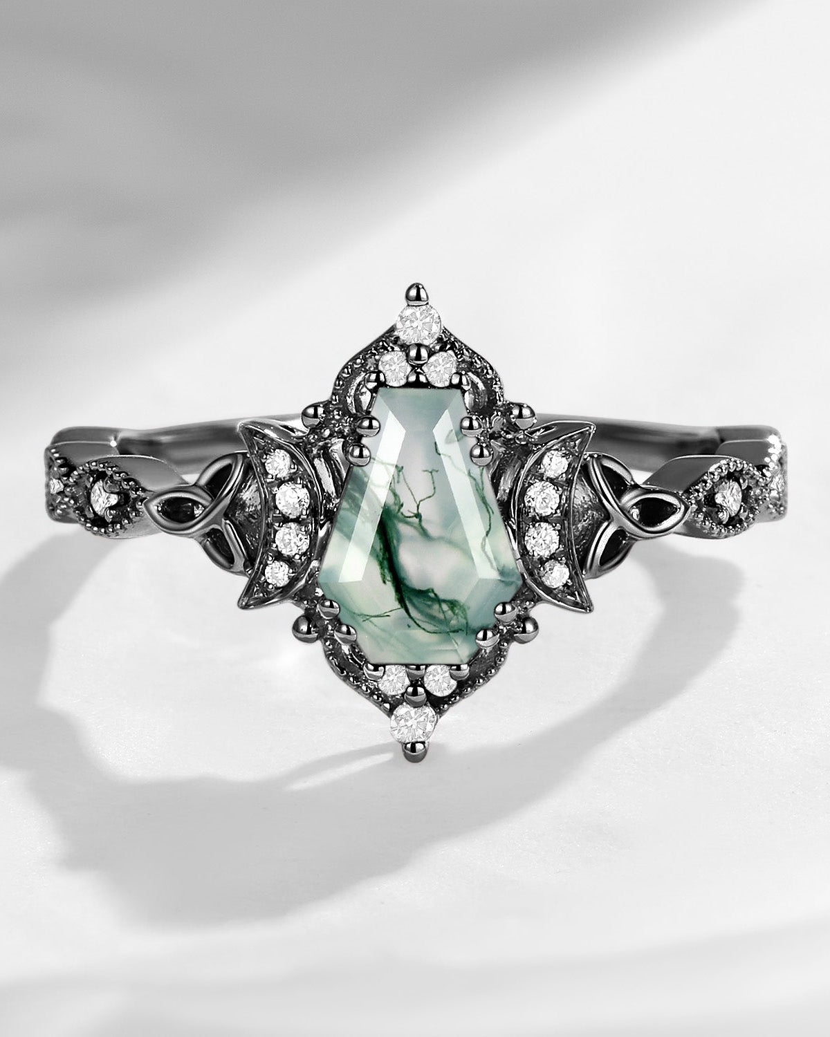 Crescent Moon | Unique Coffin Moss Agate Infinity Celtic Engagement Ring