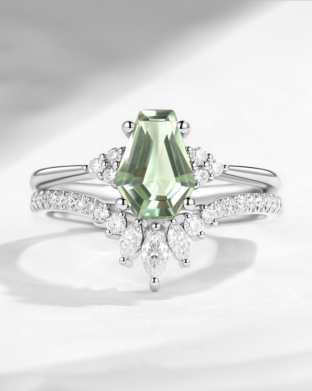 Coffin Cut Green Moissanite Cluster Engagement Set 2pcs - White Dress
