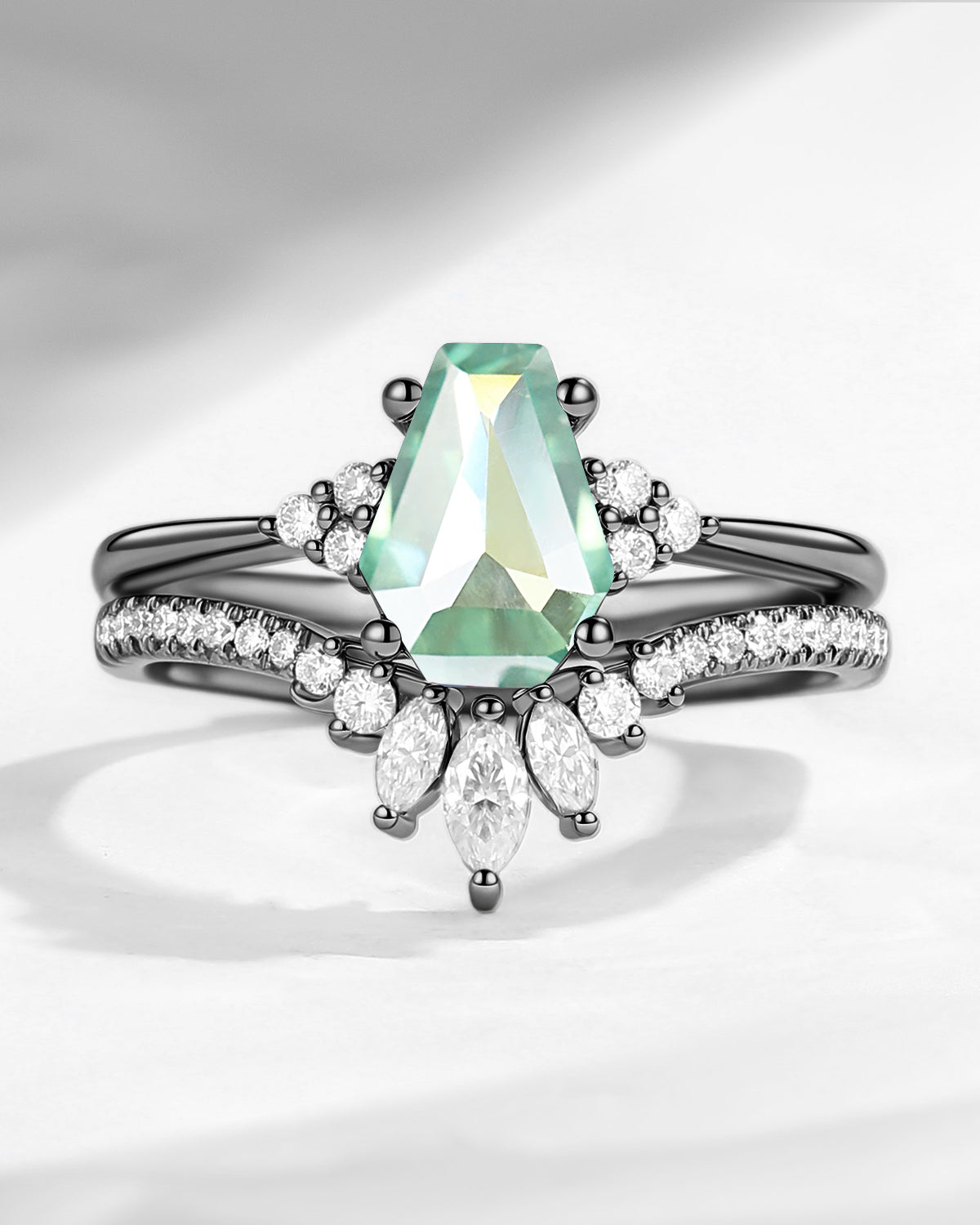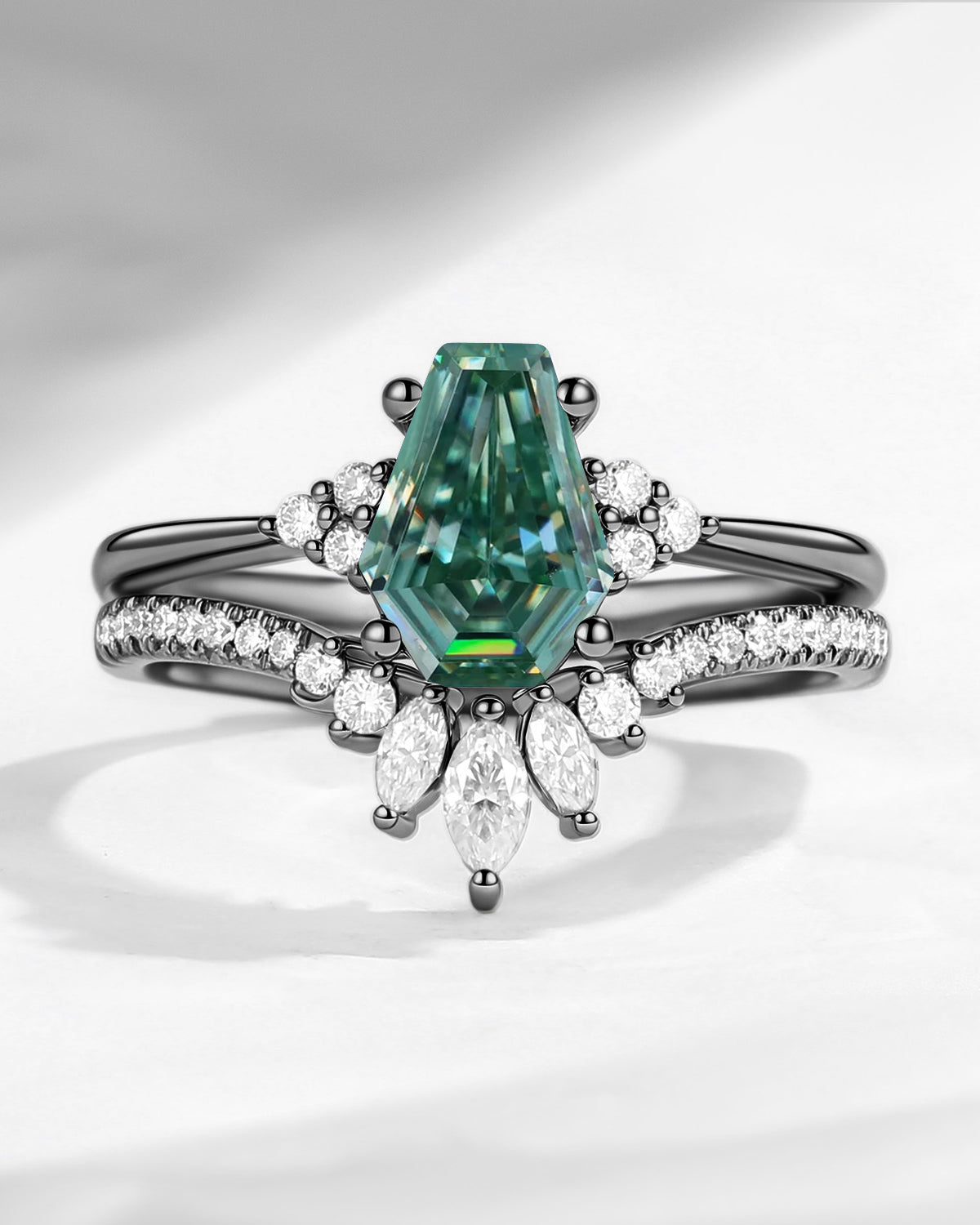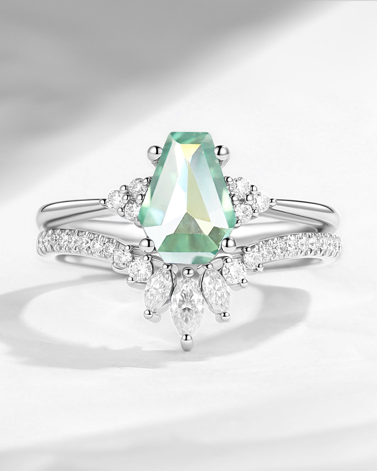 Coffin Cut Mint Moissanite Cluster Engagement Set 2pcs - White Dress
