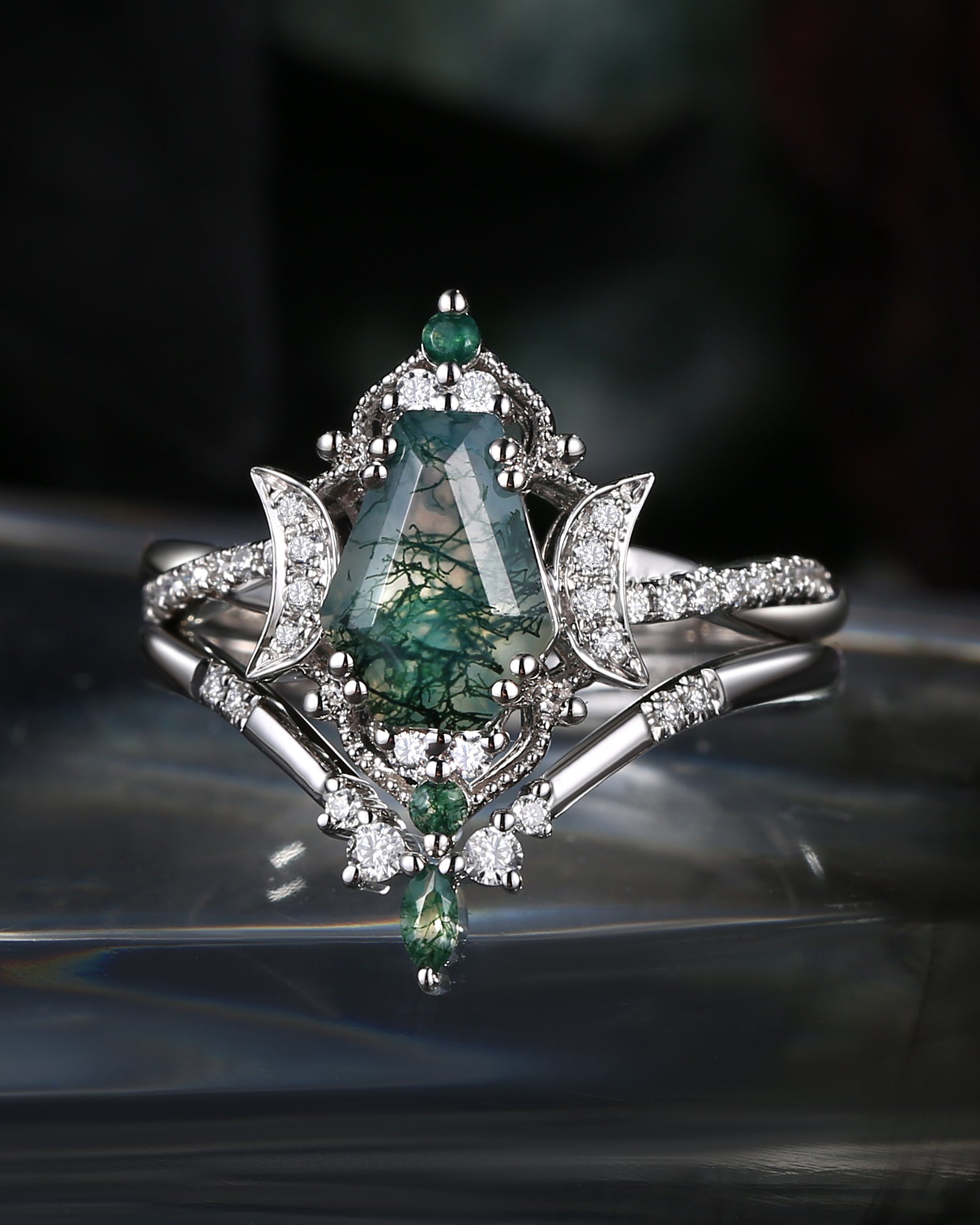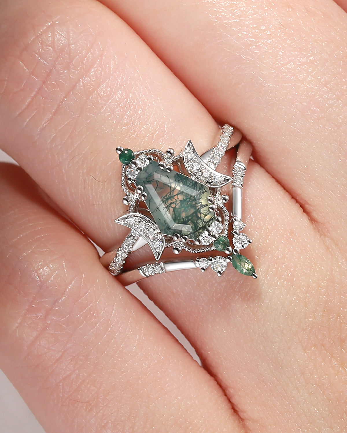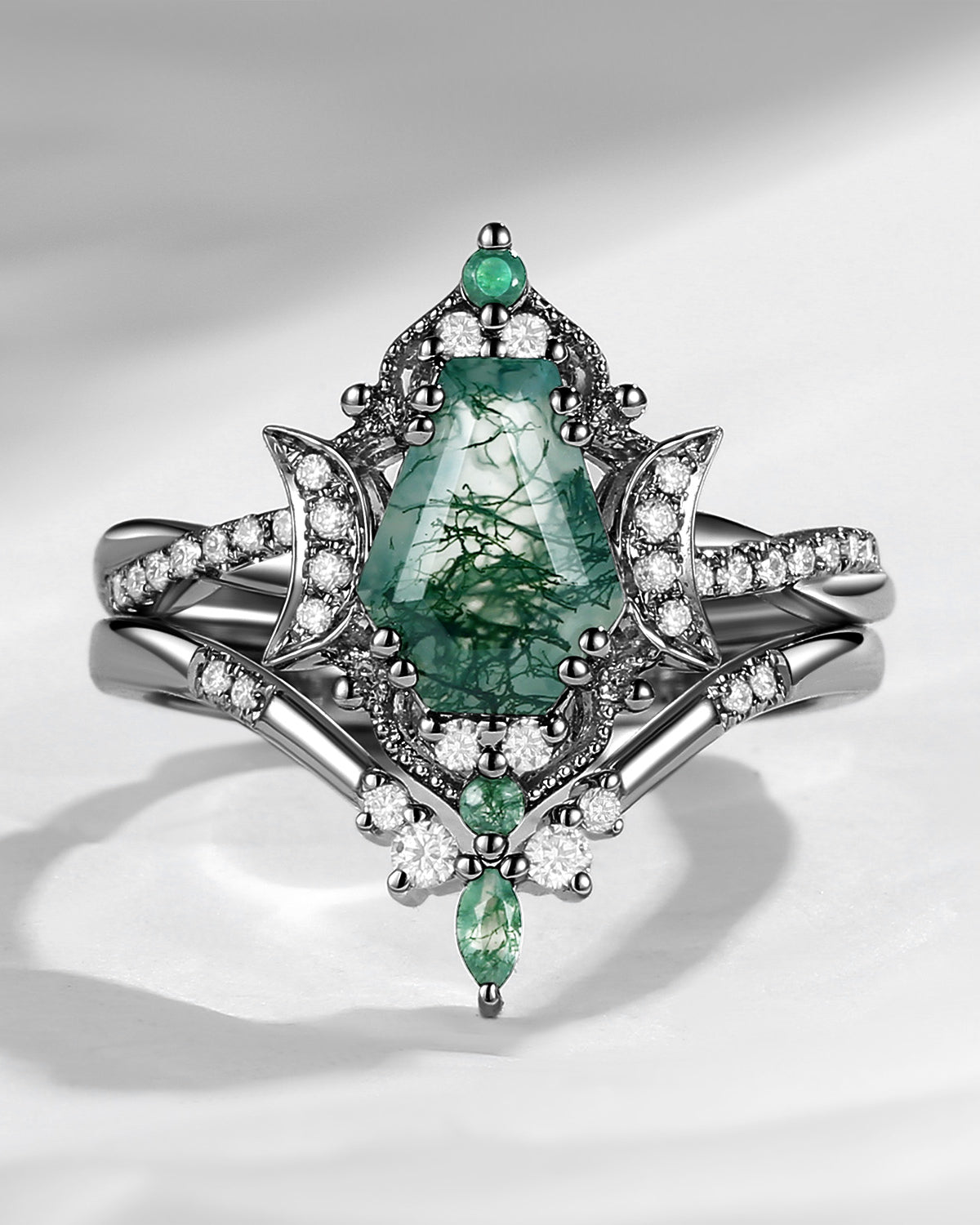 Crescent Moon | Coffin Cut Moss Agate Infinity Open Black Gold Engagement Ring 2pcs - Infinity Galaxy