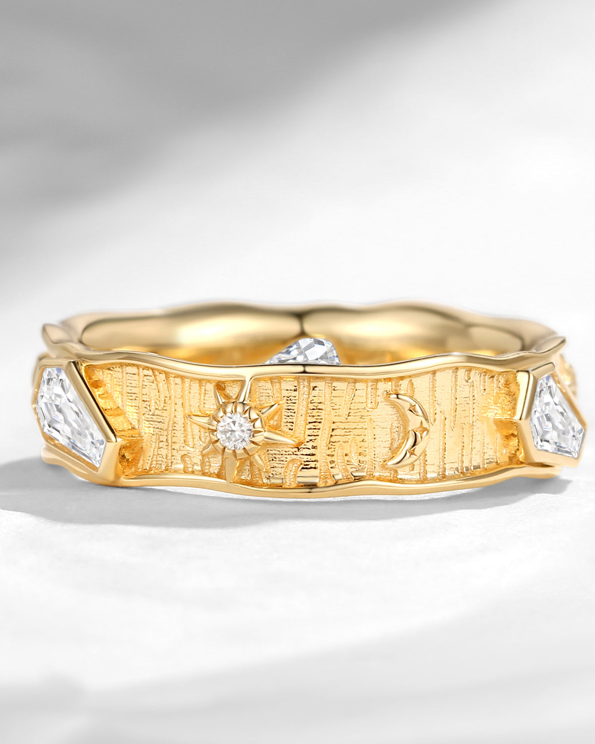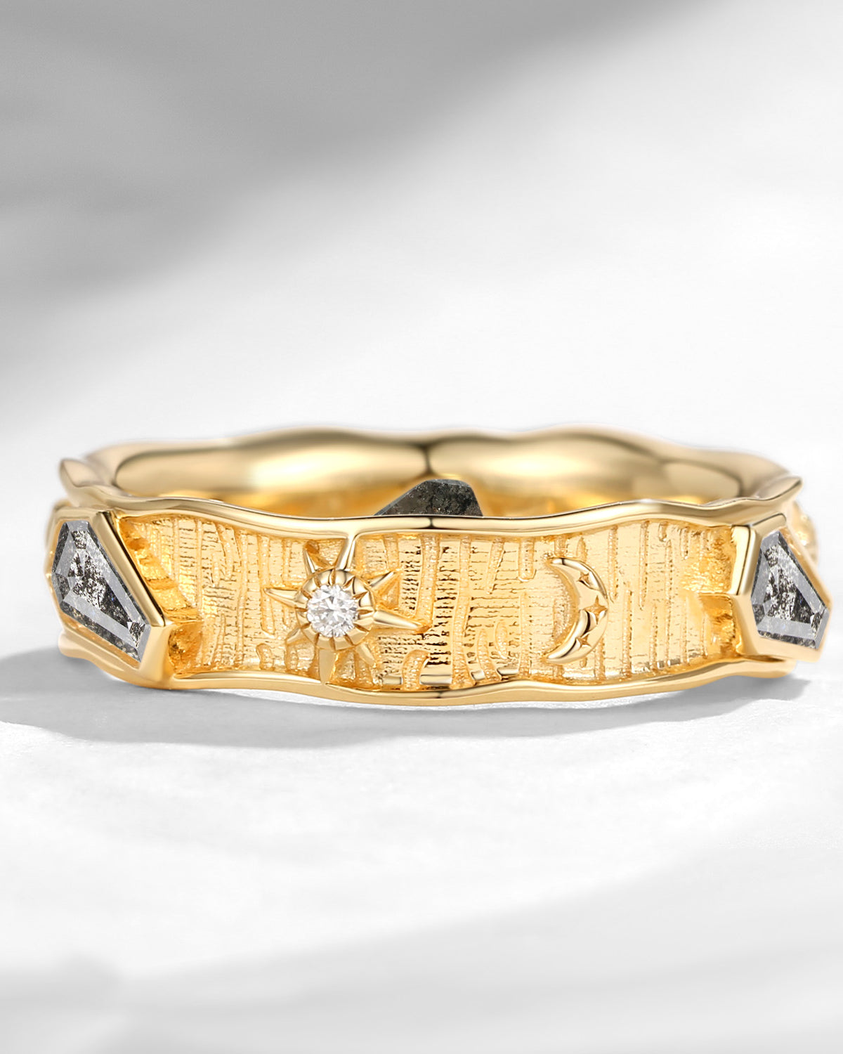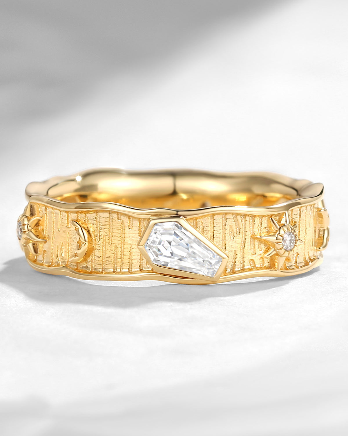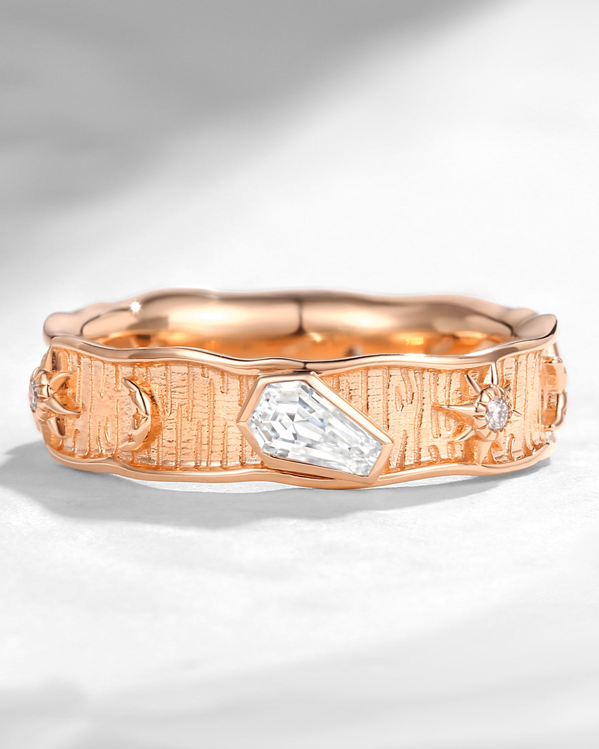 Coffin Moissanite Soft Textured Ripples Sun & Moon Wedding Ring