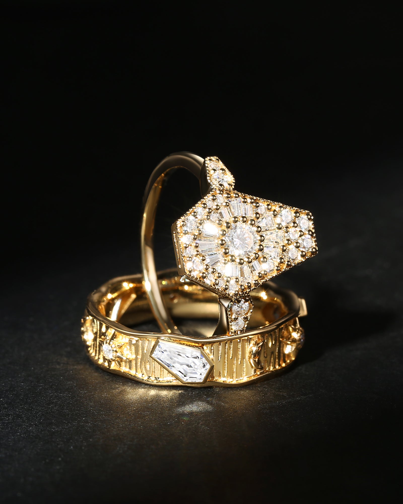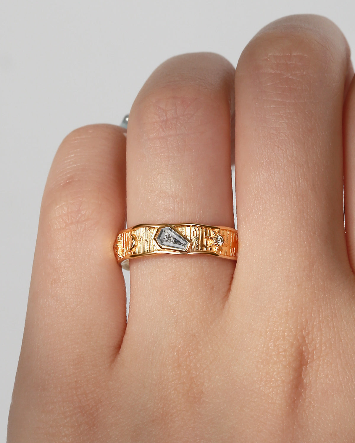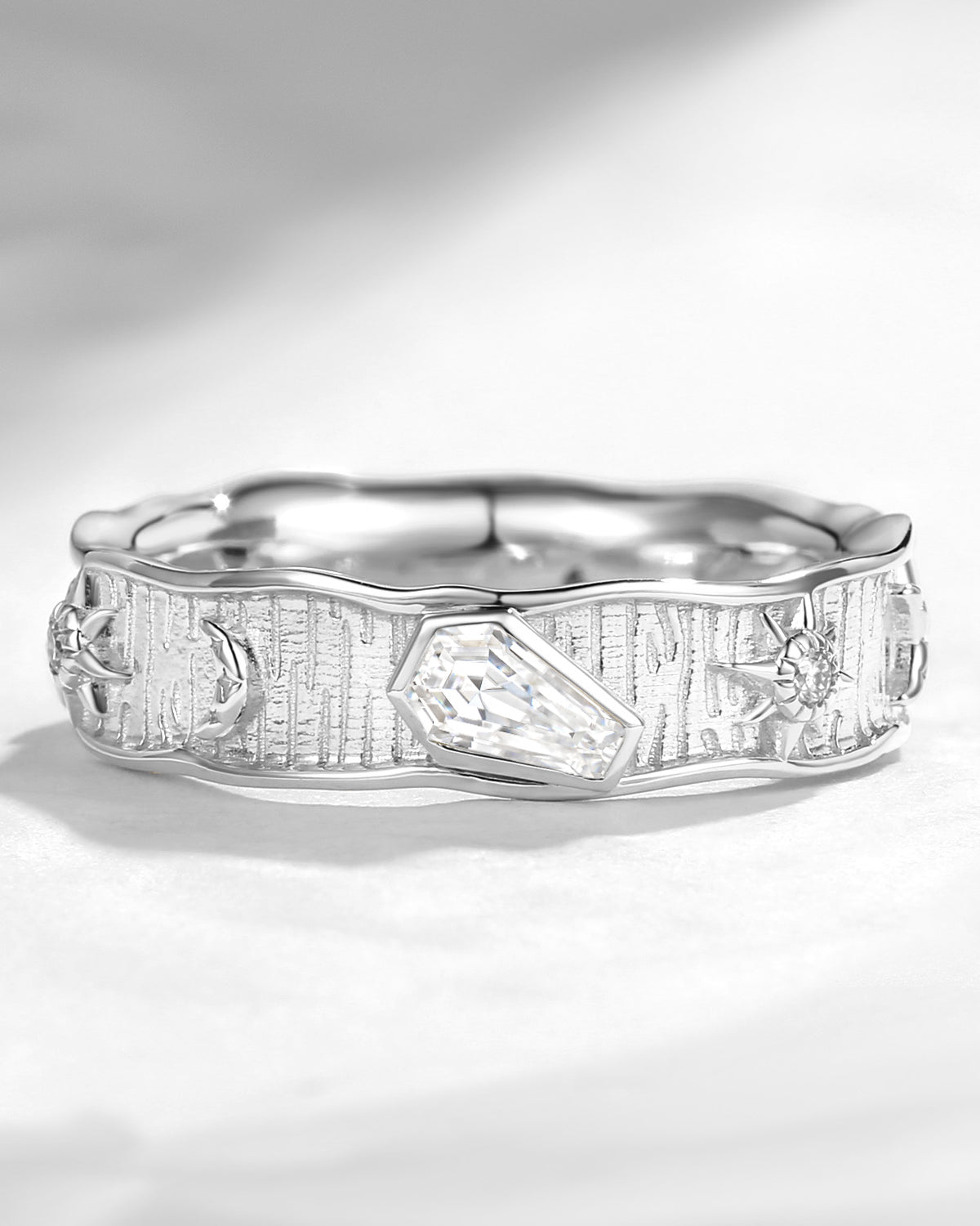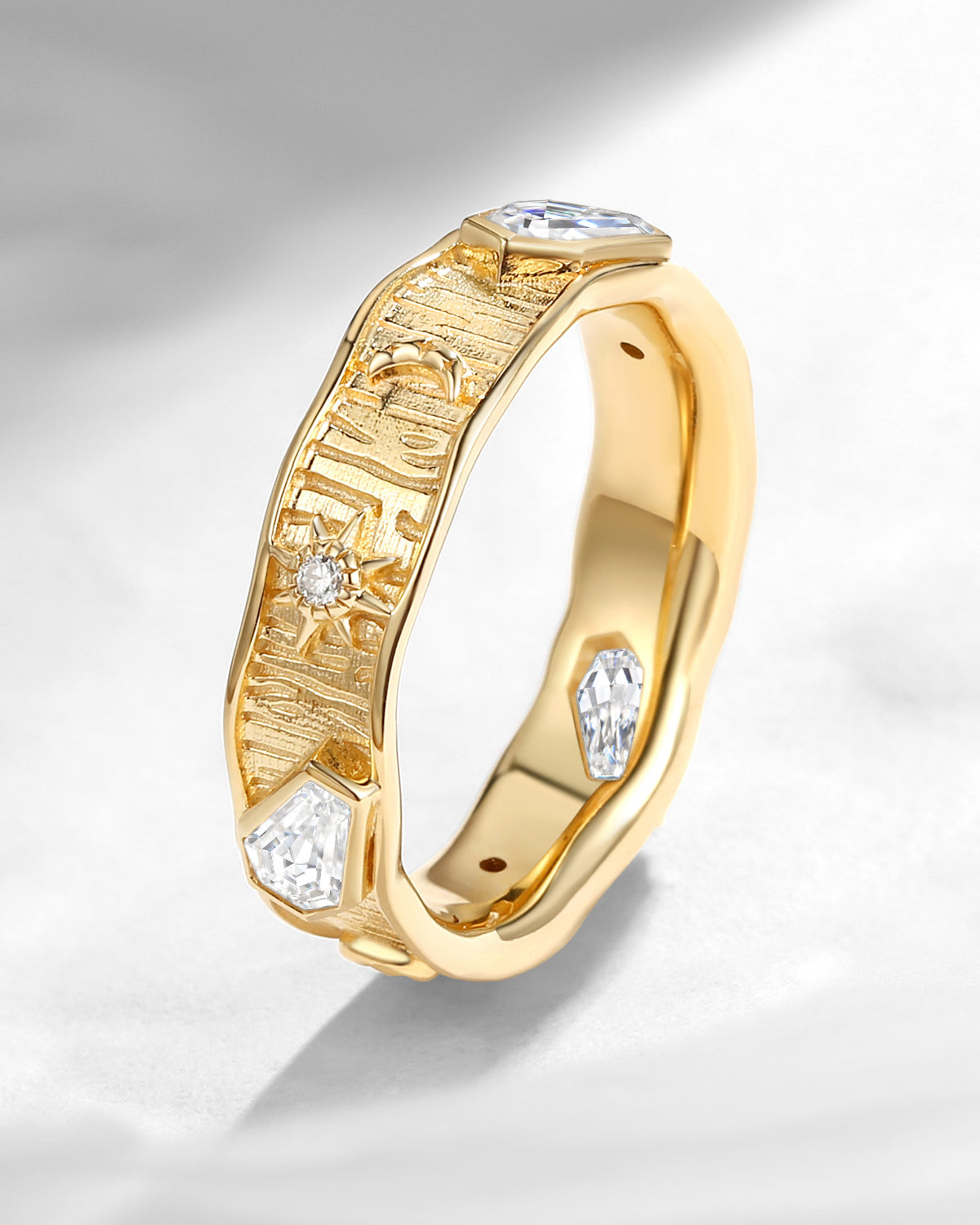 Coffin Moissanite Soft Textured Ripples Sun & Moon Wedding Ring