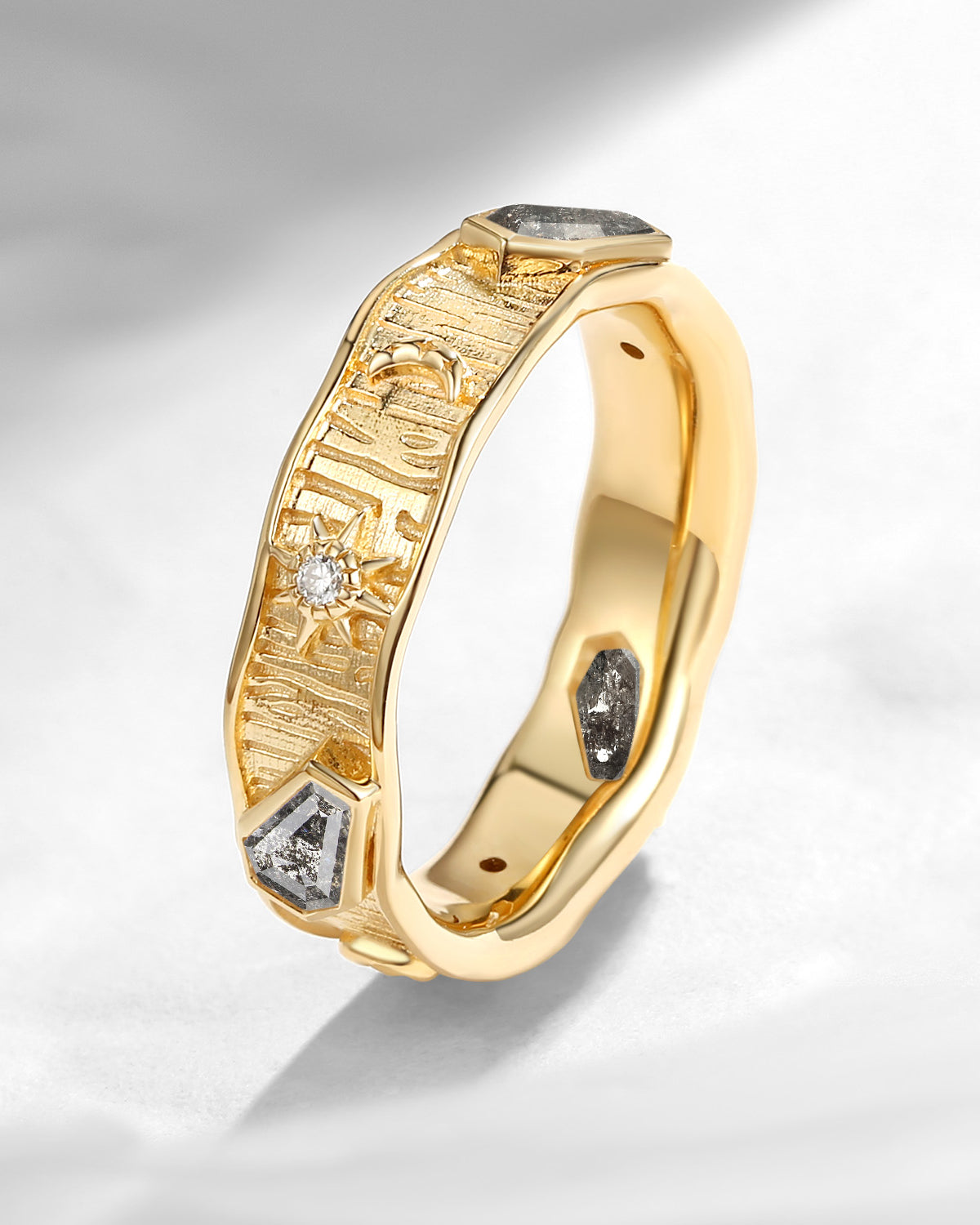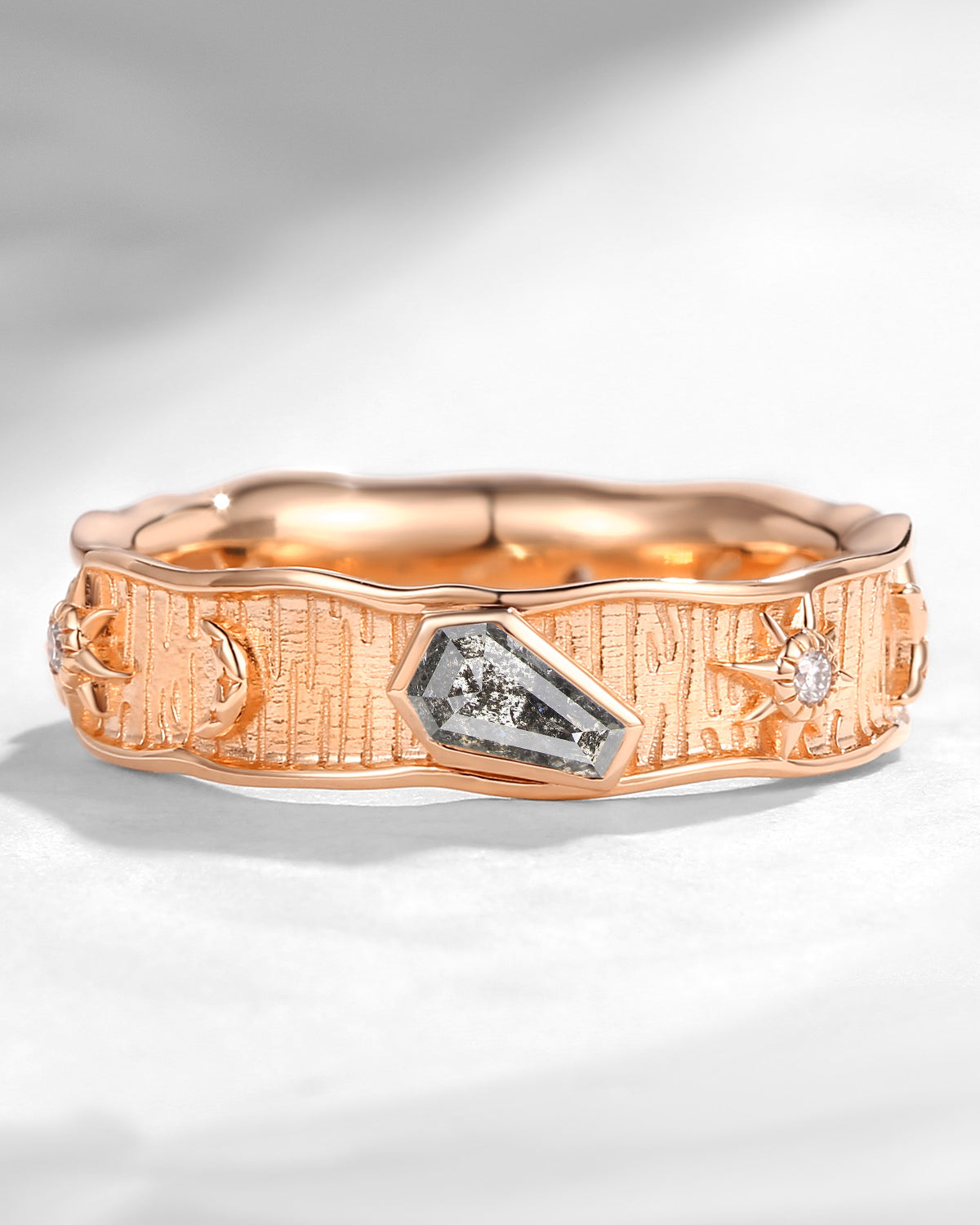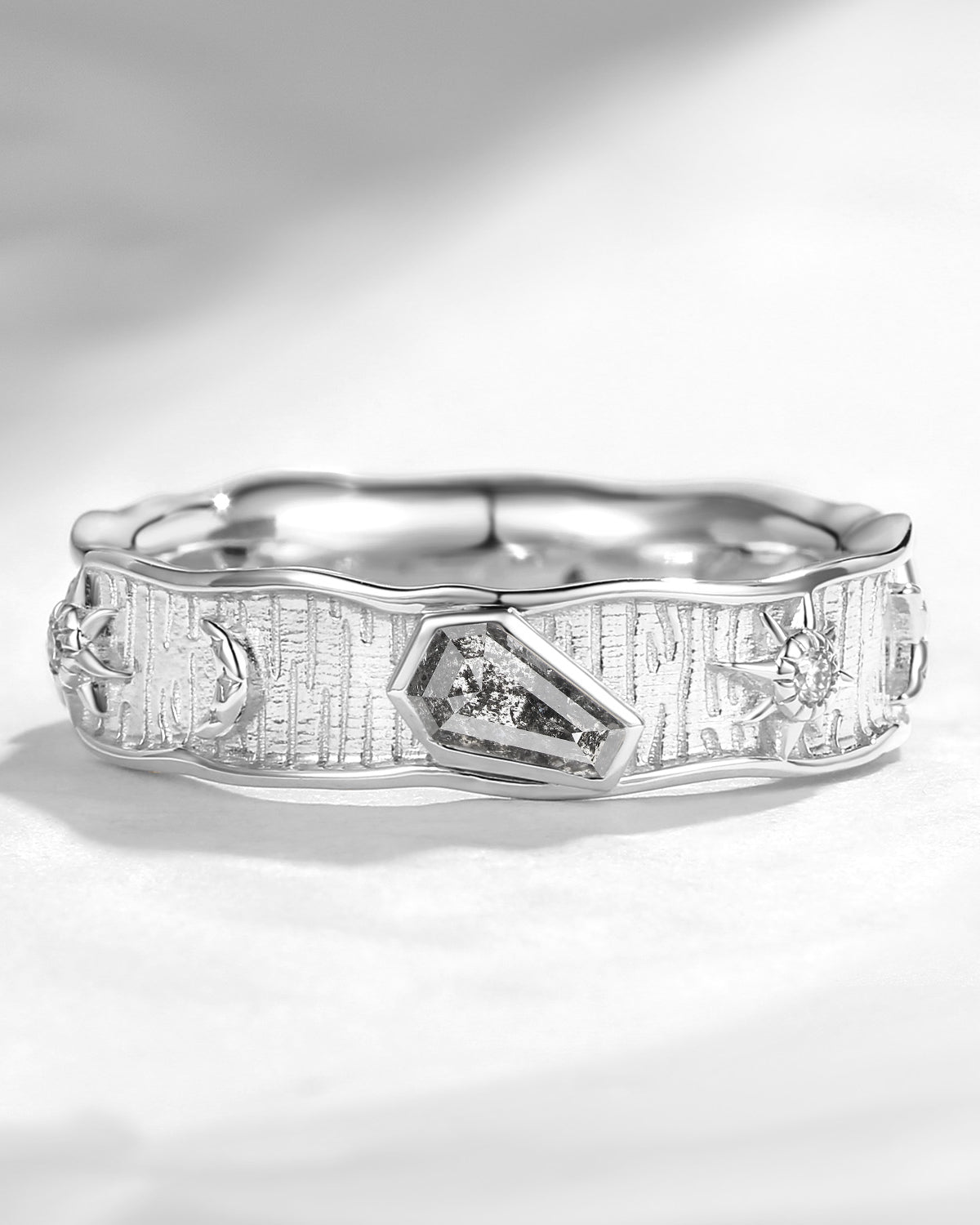 Coffin Salt And Pepper Diamond Soft Textured Ripples Sun & Moon Wedding Ring